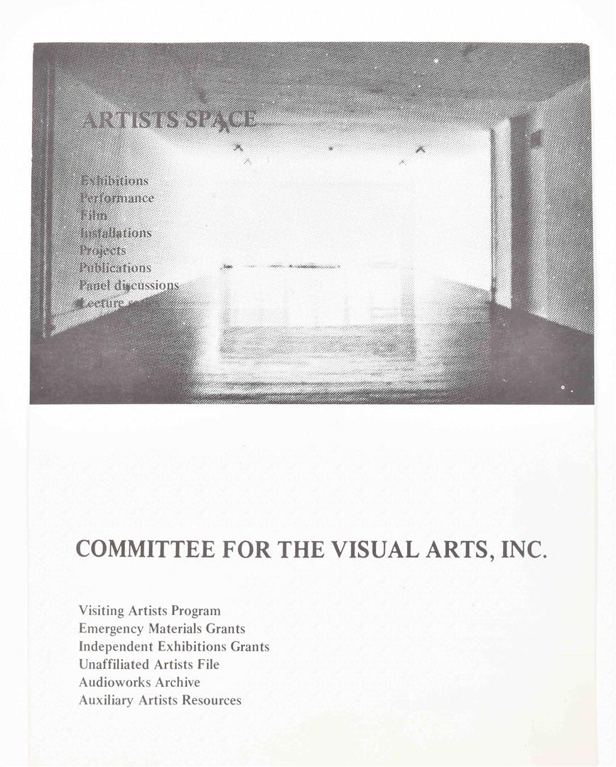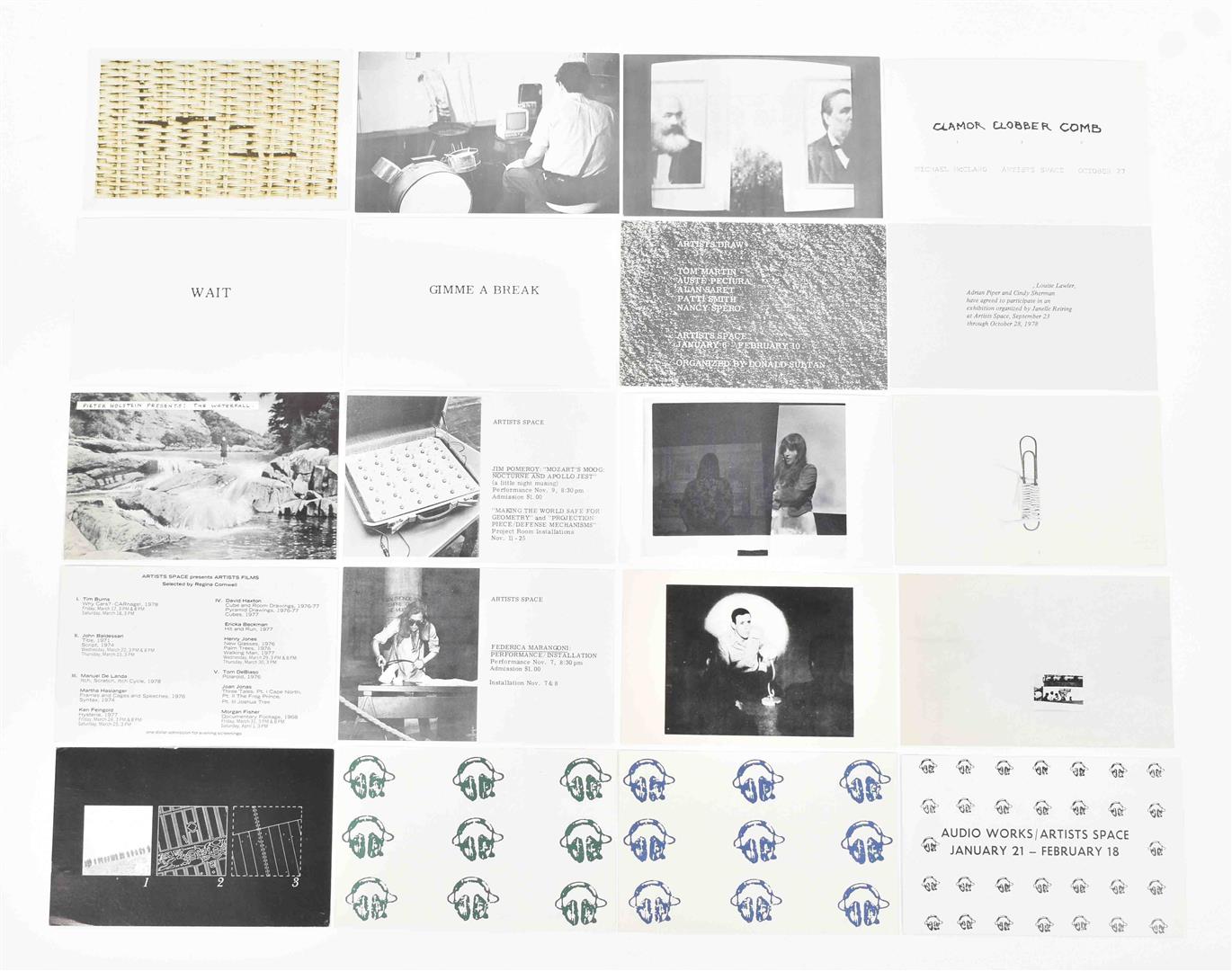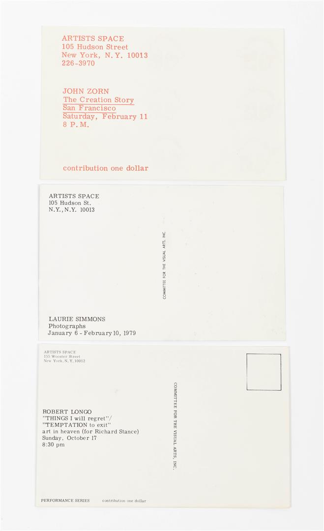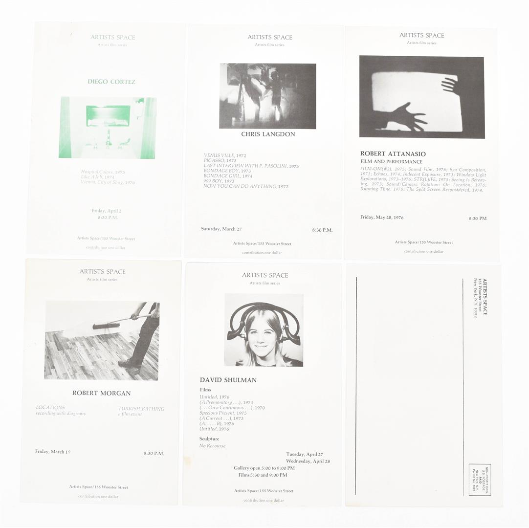 Set of 28 regular sized double sided postcards, and 7 large format cards from 1976 to 1979. Includes cards by Robert Longo, Michael Smith and Poppy Johnson from the 1976 Performance Series, as well as David Lamelas and Jack Goldstein from the 1976 Film Series. Other artists include Laurie Simmons, John Zorn, Patti Smith, Nancy Spero, Adrian Piper and many more. Added is a brochure published in season 1978/1979 by Artists Space/Committee for the Visual Arts Inc., 12 pp. (total 36)