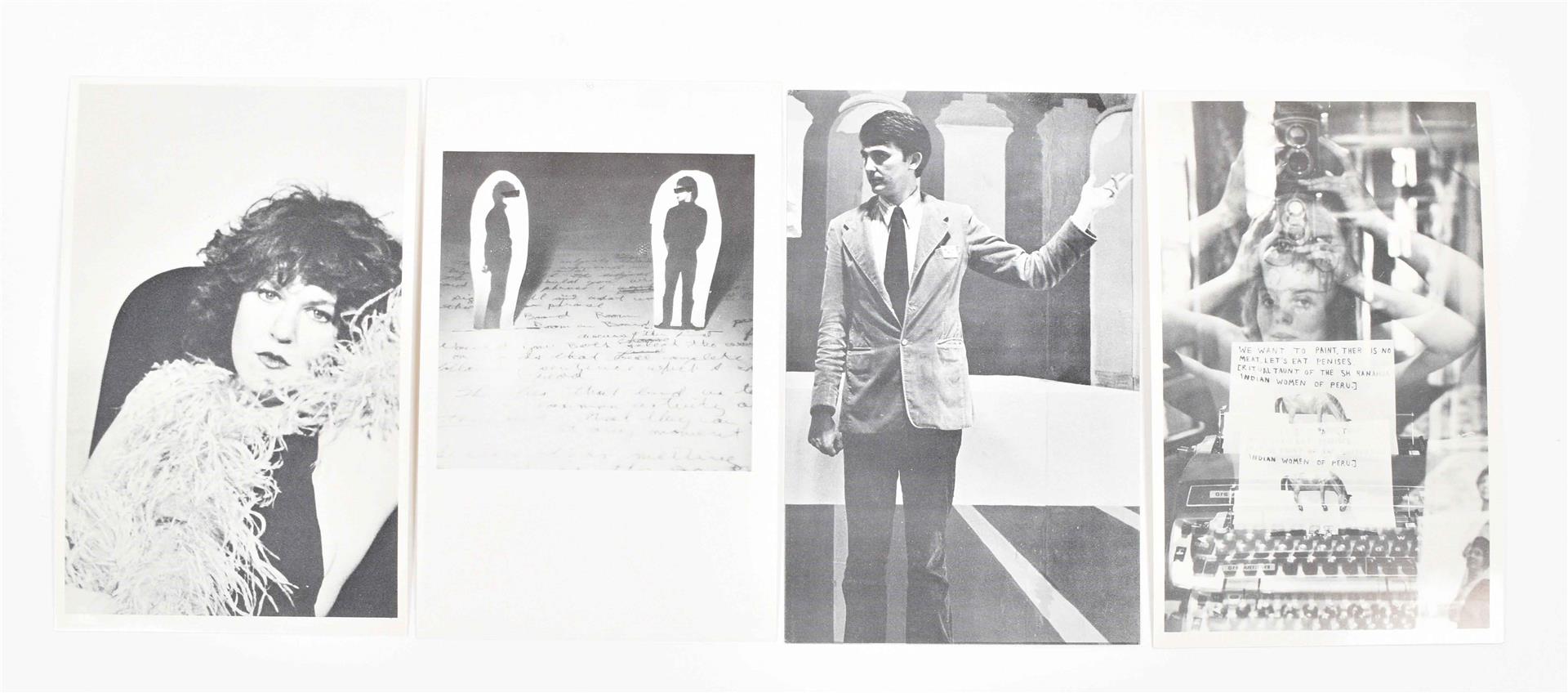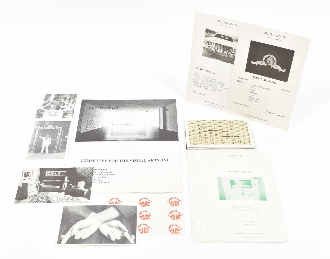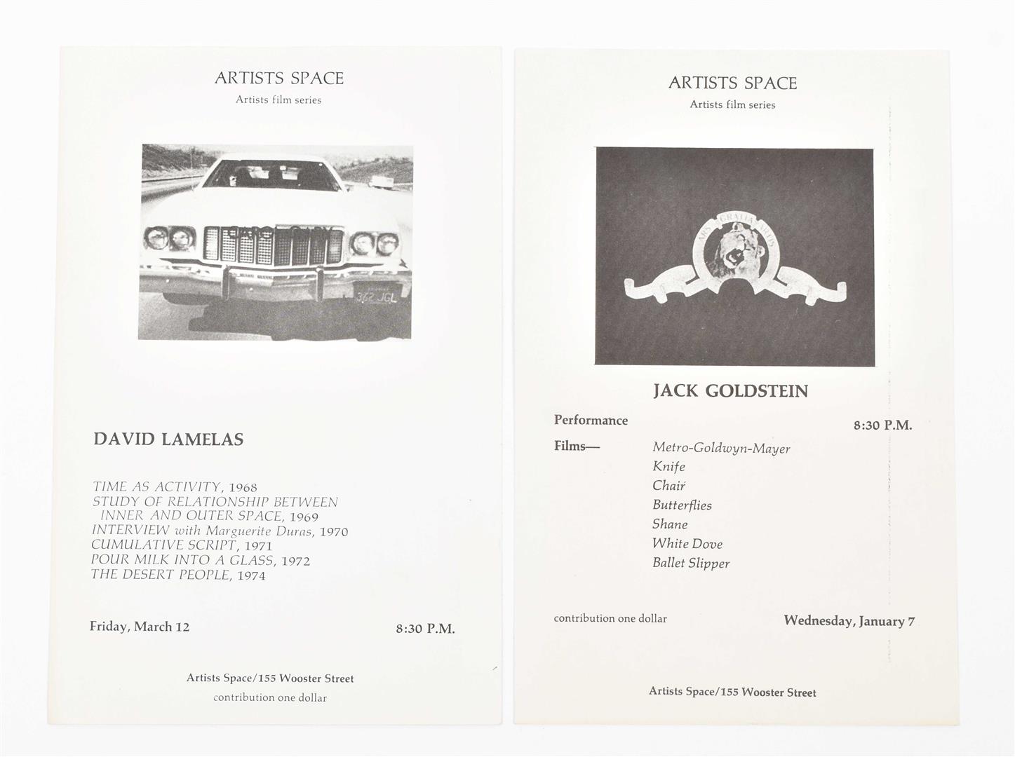 Set of 28 regular sized double sided postcards, and 7 large format cards from 1976 to 1979. Includes cards by Robert Longo, Michael Smith and Poppy Johnson from the 1976 Performance Series, as well as David Lamelas and Jack Goldstein from the 1976 Film Series. Other artists include Laurie Simmons, John Zorn, Patti Smith, Nancy Spero, Adrian Piper and many more. Added is a brochure published in season 1978/1979 by Artists Space/Committee for the Visual Arts Inc., 12 pp. (total 36)