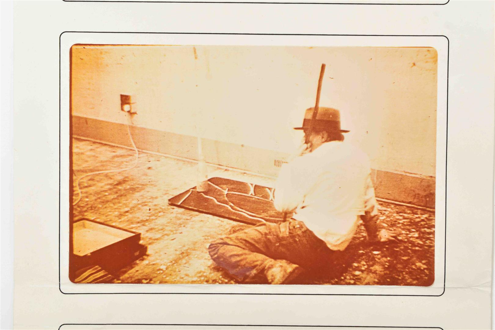 Photo documentation of the action performed during the Edinburgh International Festival in 1970 at Edinburgh College of Art. The performance was part of Strategy: Get Arts, a major exhibition of contemporary German art, the first to be shown in Britain since 1938, and co-organized by Richard Demarco Gallery. Light creasing on white stock, photos are fine.