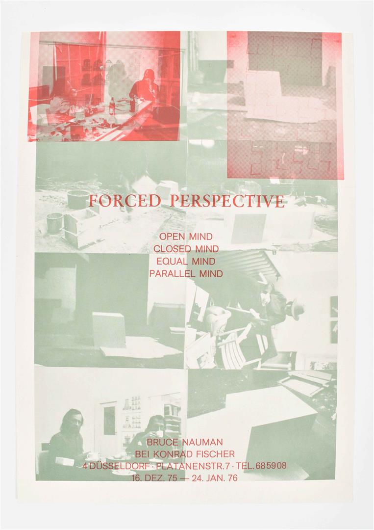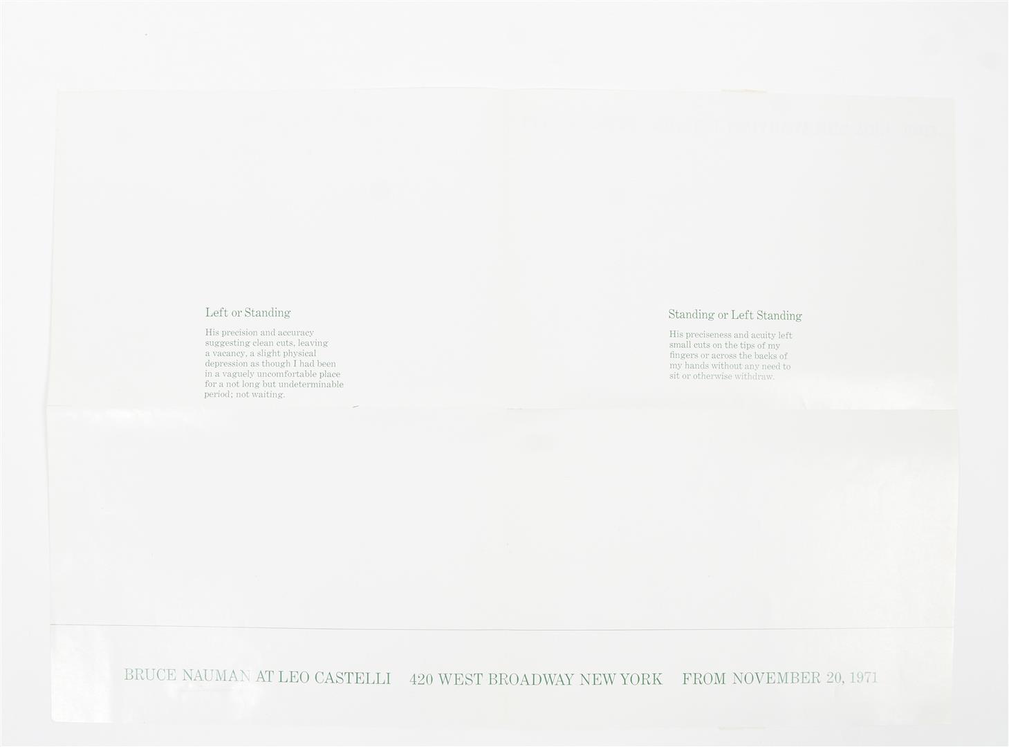 Lot of 11 announcements for Nauman shows including two amazing posters from Castelli, and a colour flyer for a Konrad Fischer show. (1) Left or Standing/Standing or Left Standing. Leo Castelli New York, Nov. 1971. Poster, 35.51 cm folded twice as issued, torn closure sticker, 2 cm incision along edge of horizontal fold, else fine. (2) Leo Castelli, Feb 1971. Thick folded card, 36 x 23 cm, features b/w images. (3) Forced Perspective. Konrad Fischer Dusseldorf, 1974. A4 colour printed, folded as issued.