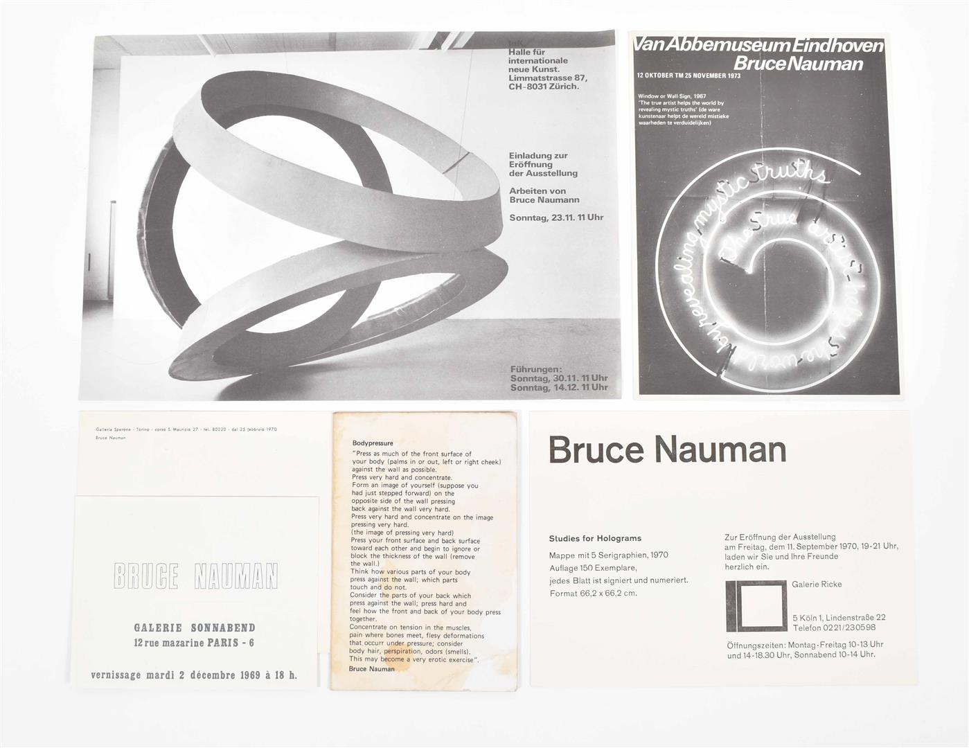 (4) Seven invitation cards by: Sonnabend Paris (1969), Sperone Turin, Galerie Ricke Cologne (1970), Konrad Fischer Dusseldorf (1971), Van Abbemuseum Eindhoven (1973), Group show Lijflijk Groningen, features Nauman's text 'Bodypressure' (heavily coffee stained), Wide White Space Antwerp (with pinholes) (1974), InK, Halle für Internationale neue Kunst Zurich (1980). (total 11)