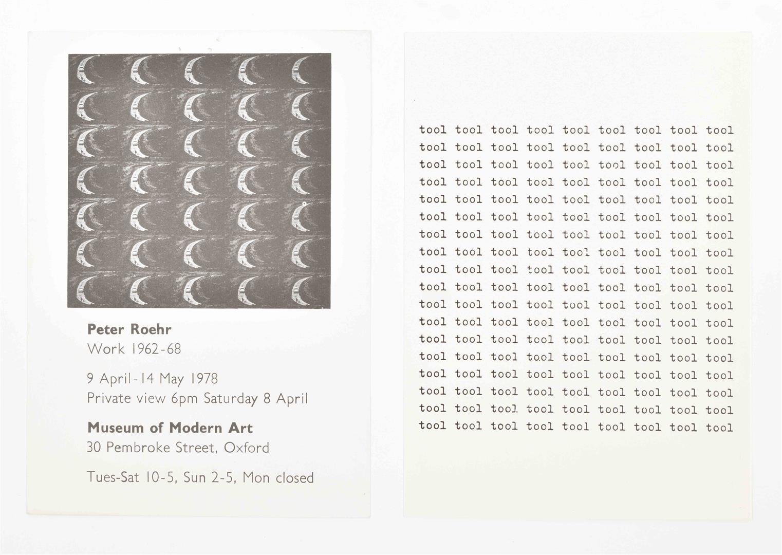 featuring exhibitions held after the artist's untimely death at the age of 24. Includes: (1) Various invitations by Paul Maenz hosting shows with works from the estate as well as book launches in 1971, 1977 (3 cards), 1981, 1985, 1988. (2) Other gallery and museum exhibition announcements from: Videogalerie Schum Dusseldorf (1971), Sperone Turin (1972), Annemarie Verna Zurich (1975), Van Abbemuseum Eindhoven (1977), Museum of Modern Art Oxford (with poster), Kunstmuseum Luzern (1978), Galerie Mueller-Roth Stuttgart (1989). (total 17)