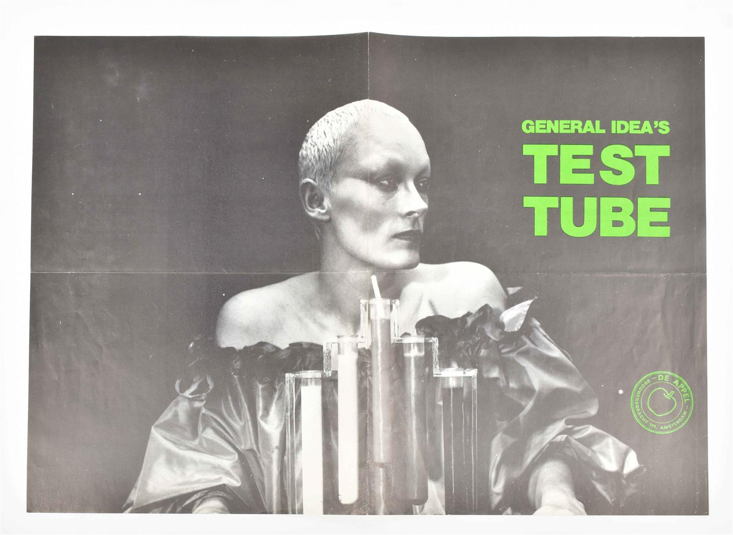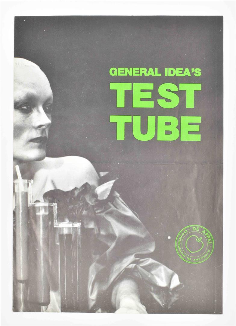 Test Tube was produced by De Appel in 1979, during General Idea's residency in Amsterdam. It was conceived as a program for television, mixing formats such as a news magazine, an infomercial, and a talk show presented from The Colour Bar Lounge. The core of the work is a soap opera–like narrative about the struggling artist Marianne, featured on the poster having a cocktail presented in a test tube. Light creasing, generally a fine copy. Rare.