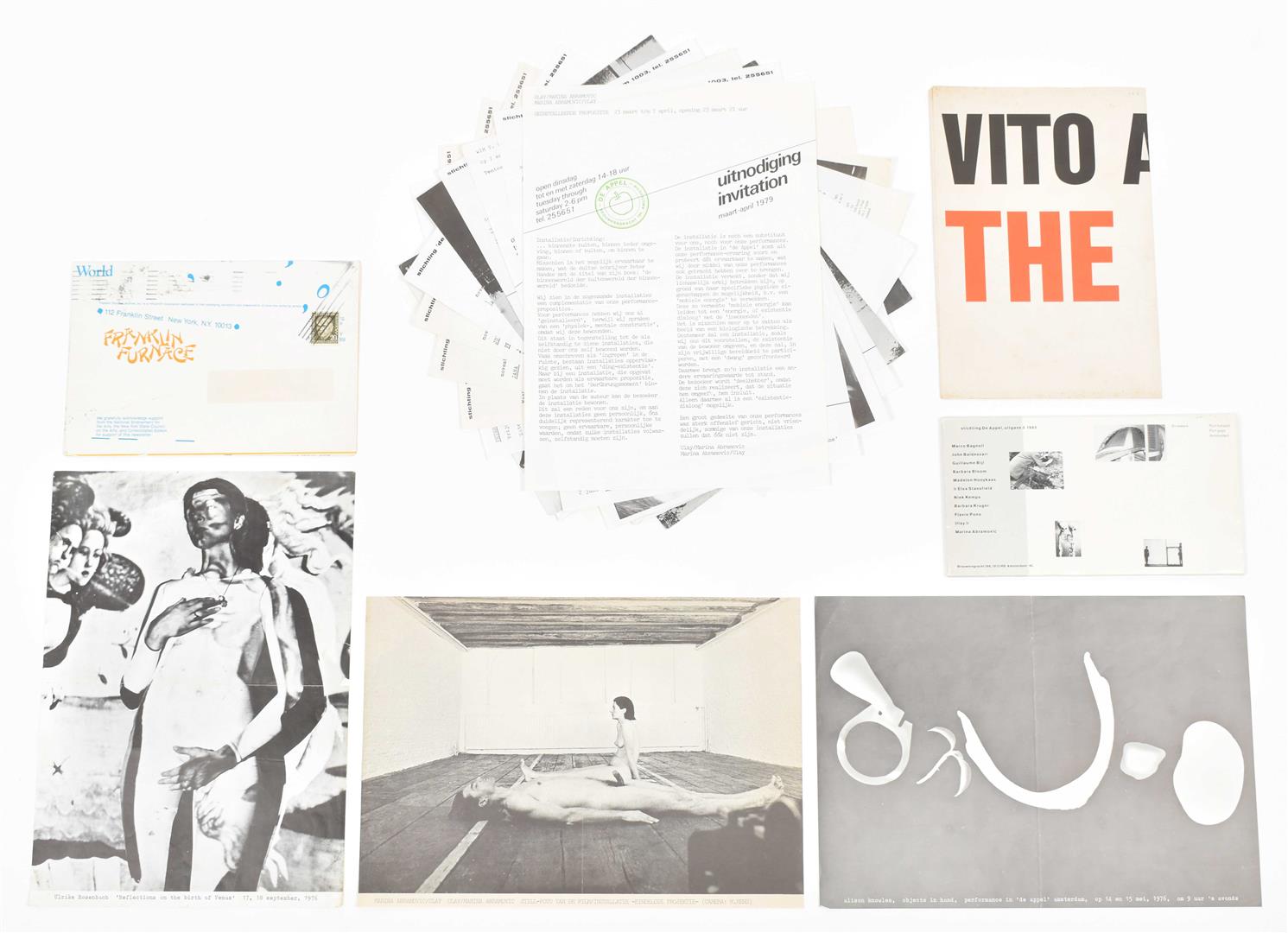 Twenty two documents from the legendary centre for performance, installations and video art founded by Wies Smals (1975 to 1983). Comprises mostly A4 exhibition flyers from the mid to late 1970s, with highlights such as Ulrike Rosenbach 'Reflections on the Birth of Venus' (1976), Alison Knowles 'Objects in Hand' (1976), Marina Abramovic & Ulay (1979).