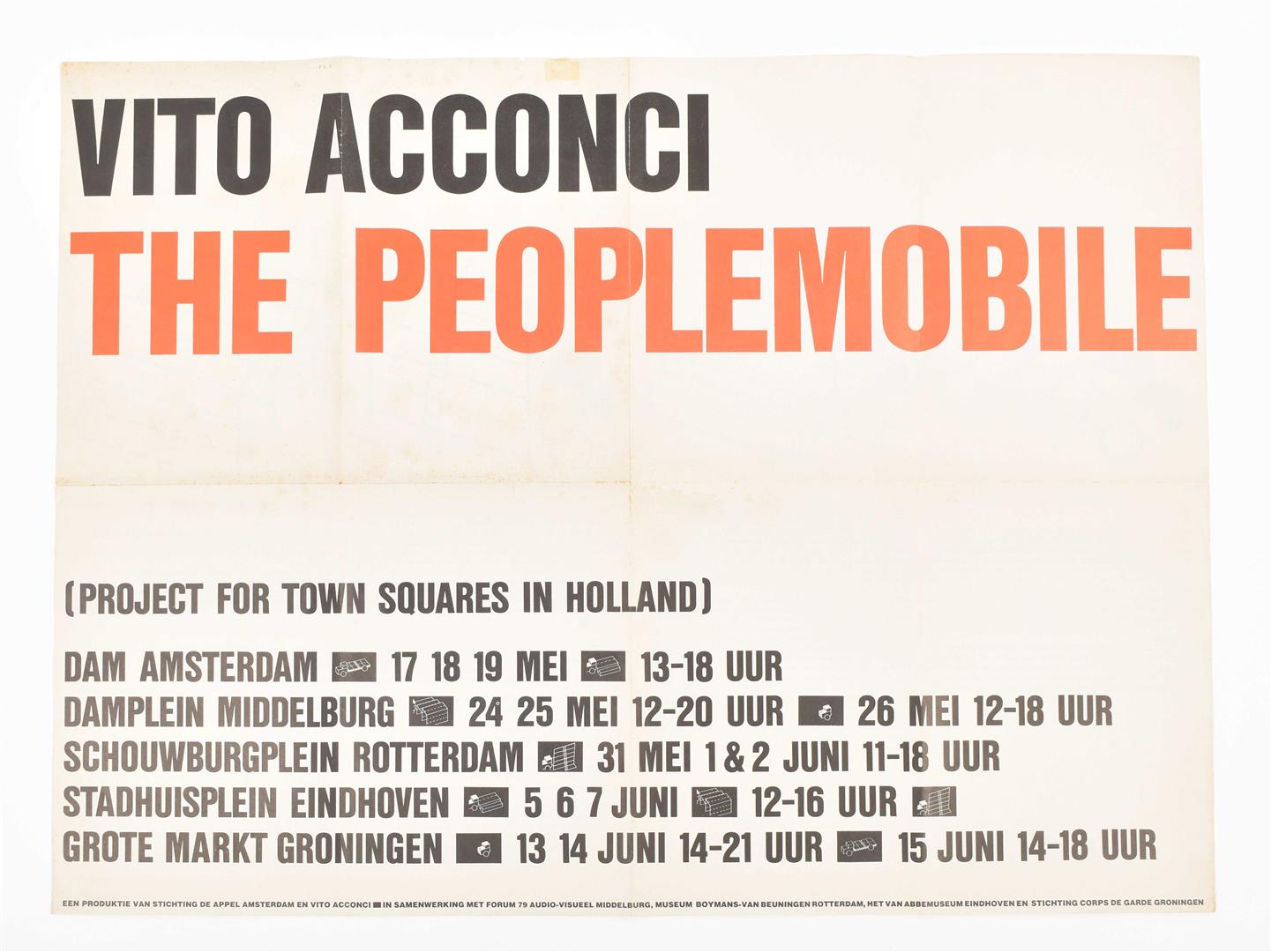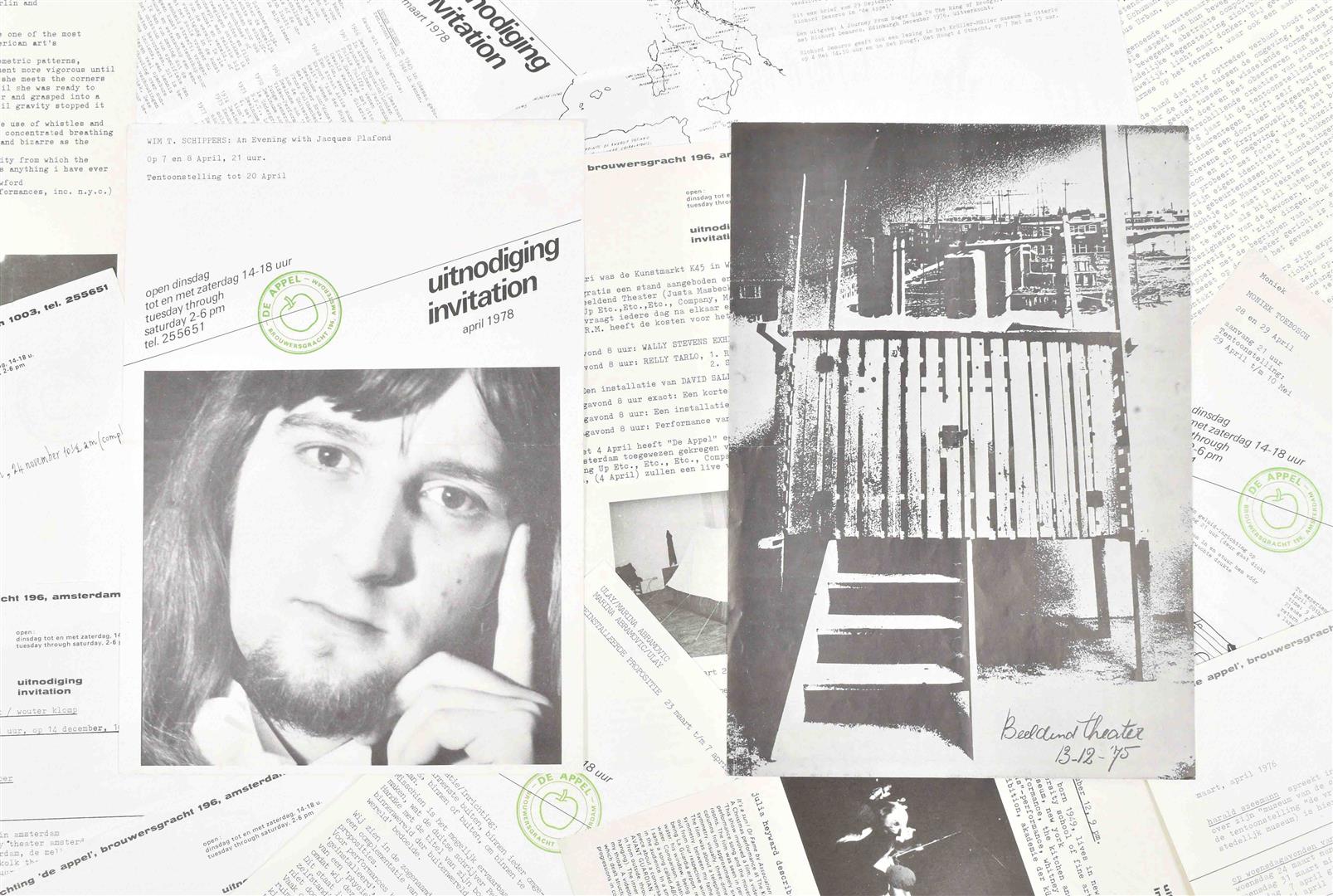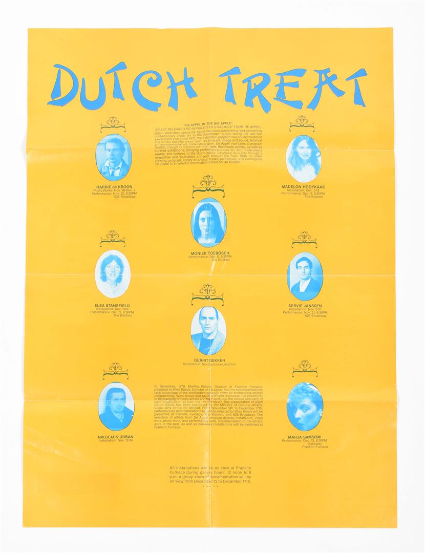 Special posters include: (1) Vito Acconci, The Peoplemobile; project for townsquares in Holland, 1979. 46 x 62 cm, folded 3 times. Pronounced age wear, small holes and tape repair (2 cm) on top margin. (2) Dutch Treat, an exhibition curated by De Appel/Wies Smals at Franklin Furnace, New York 1980. 56 x 40.5 cm, folded 3 times as issued, fine copy. (3) Also contains De Appel Bulletin 3 1985, an envelope containing artists' cards by John Baldessari, Barbara Kruger, Ulay/Abramovic et al. (total 22)