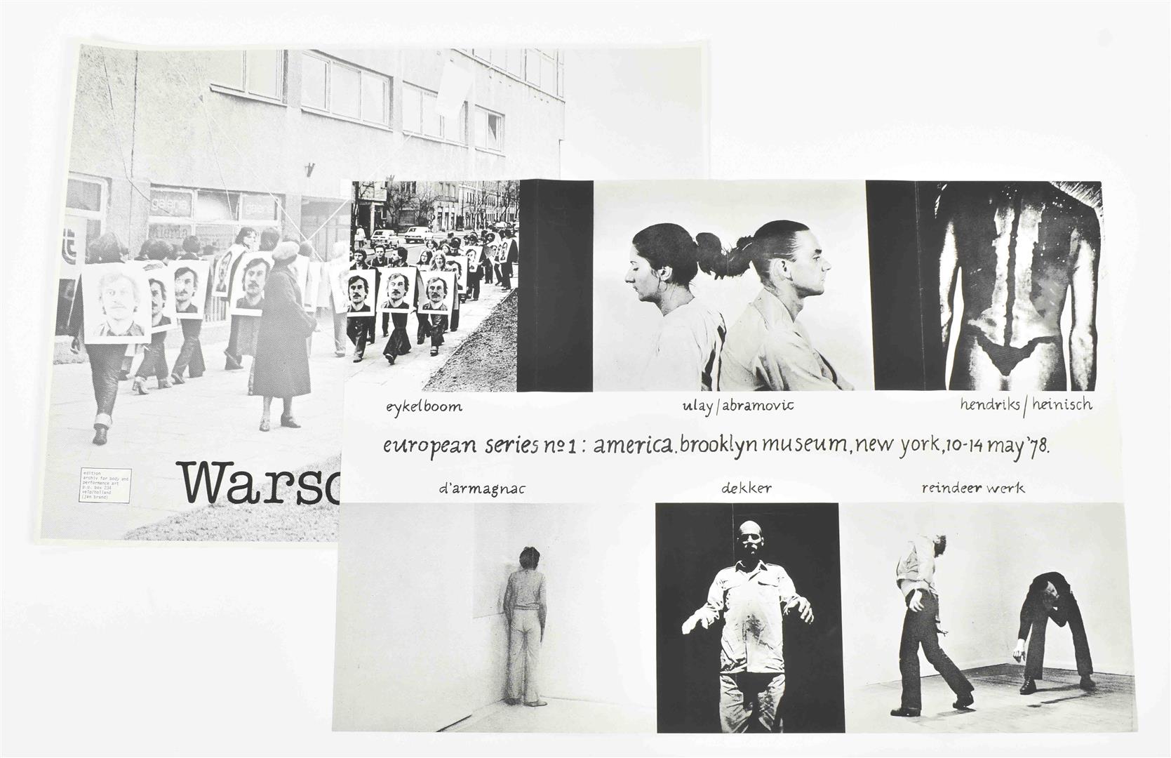 (2) European Series No.1: America. Announcement for a performance event at the Brooklyn Museum New York, 10-14 May 1978. Participating artists include Eykelboom, Ulay/Abramovic, Hendriks/Heinisch, d'Armagnac, Dekker, Reindeer Werk. Offset printed, 70 x 50 cm, folded three times. Creasing and some staple holes, generally a fine copy. (total 2)