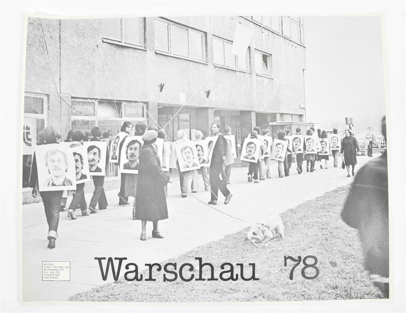 (1) Warschau 78. B/w offset printed poster, 60 x 48 cm, published by Jan Brand, Archiv for body and performance art, Velp. Photo documentation of a performance by Hans Eykelboom executed as part of the International Artists Meeting-Workshops Remont in Warschau, 1978. Very good copy. Rare.