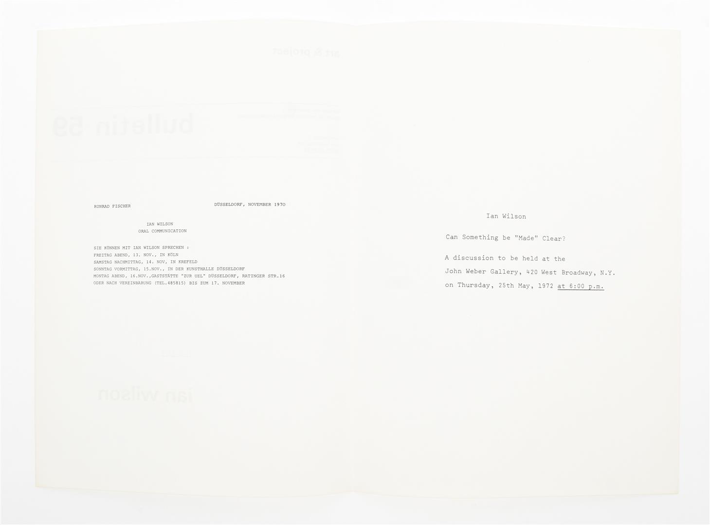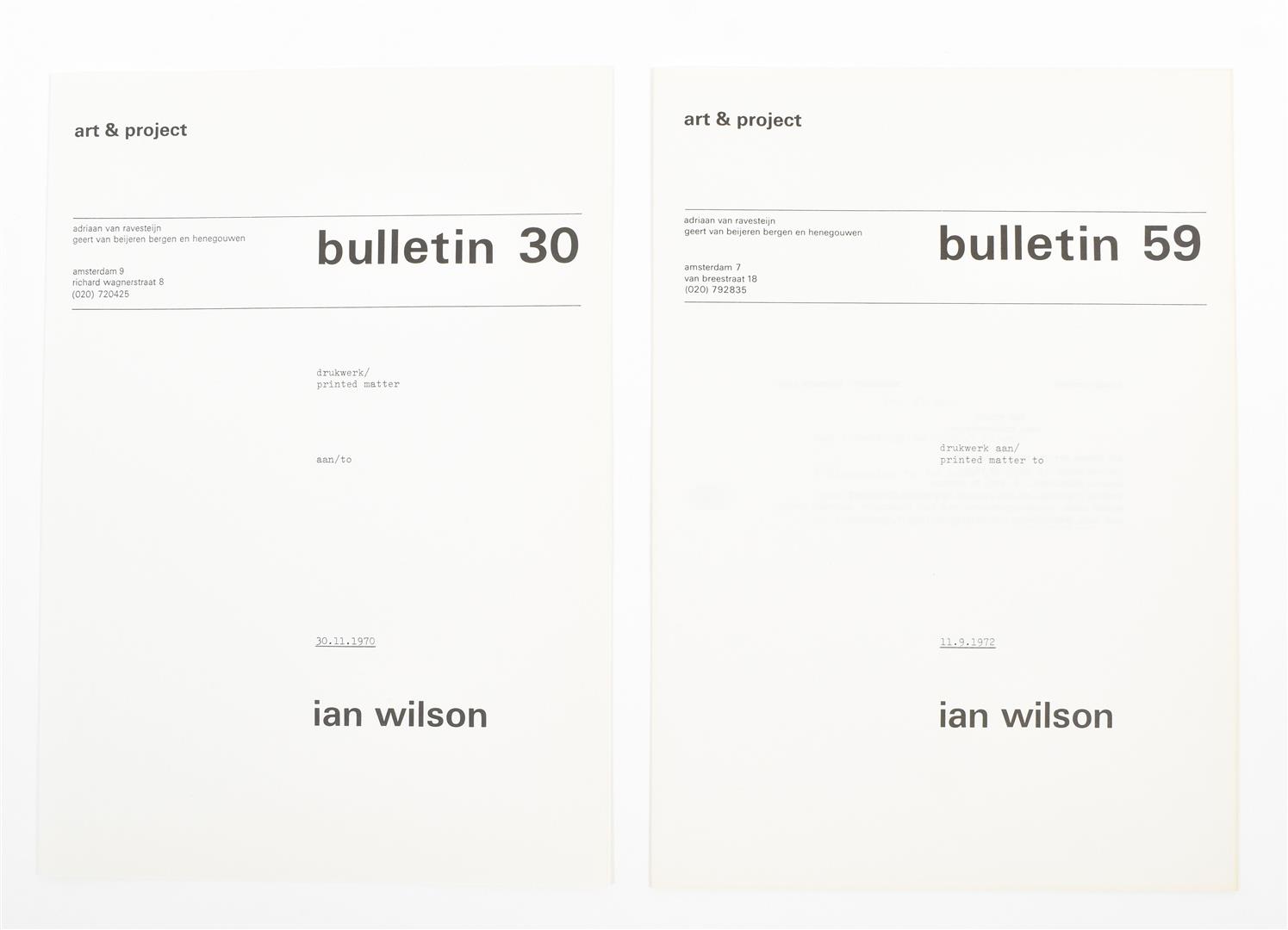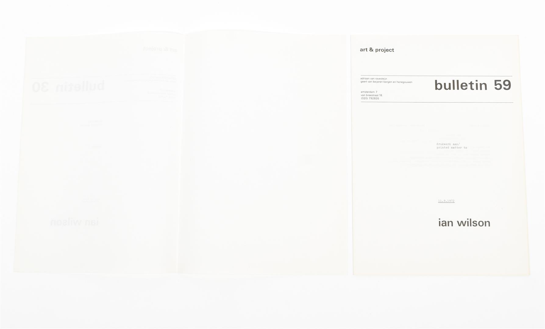 Two issues of the famous bulletin compiled by the artist. Published by Art & Project in Amsterdam. Single folded sheets, 29.5 x 21 cm, 4 pp. First edition of 800 copies. Both unmailed copies in very good state. (1) Art & Project Bulletin No.30, November 1970. Blank artists' contribution. (2) Art & Project Bulletin No.59, September 1972. Text piece, 2 artists' statements on center spread.