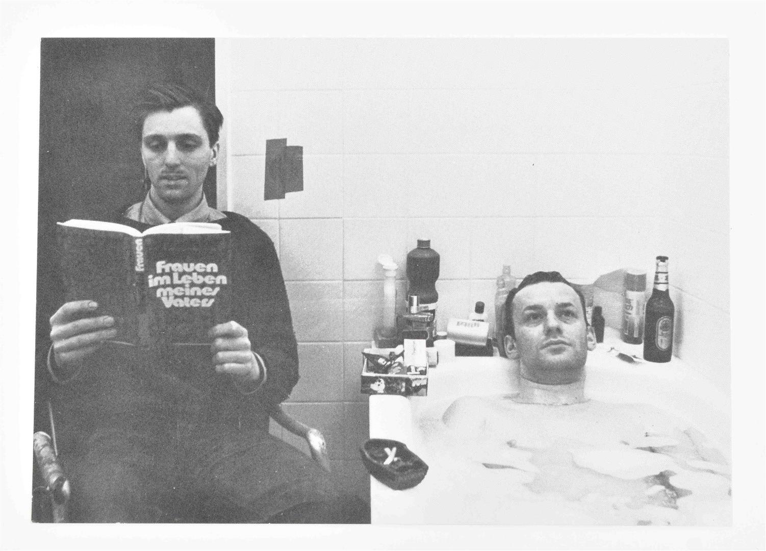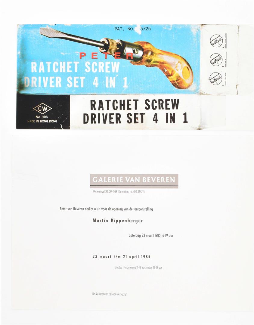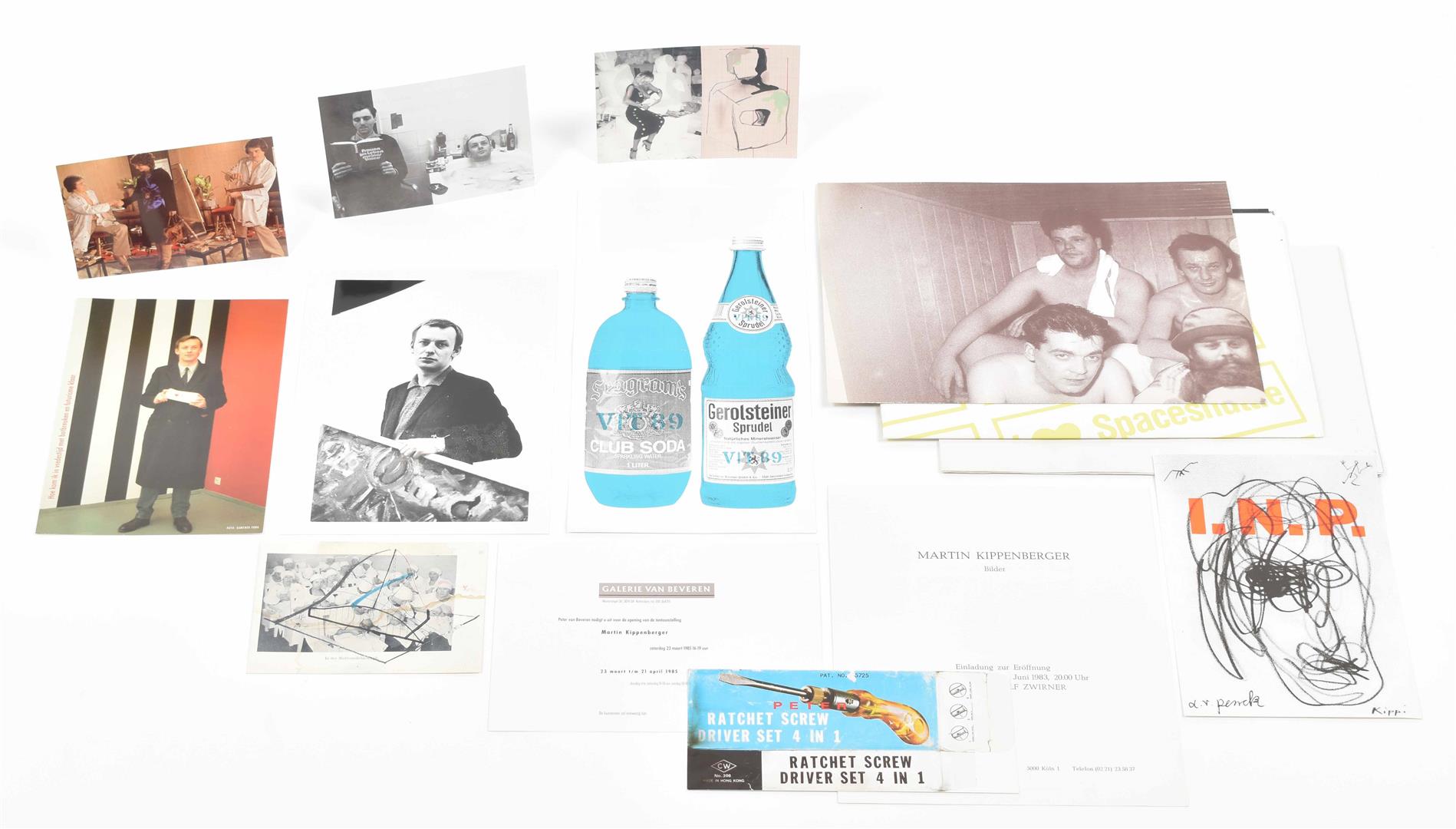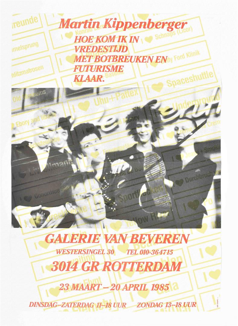 Entertaining set of 3 posters, 10 invitation cards and 1 b/w picture. (1) Large poster for artists' record 'Die Rache Der Erinnerung'. Portrait of six German painters, partly nude, in a sauna. Band members are Kippenberger, Markus & Albert Oehlen, Immendorff, Büttner and A.R. Penck. 43.5 x 60 cm, folded. Very good copy. (2) Exhibition poster for a Kippenberger show at Galerie van Beveren March 23 - April 20 1985, Rotterdam, 'Hoe kom ik in vredestijd met botbreuken en futurisme klaar'. Silkscreen, colour printed, 85 x 59 cm. Folded in 8 parts. Rare, very good copy.