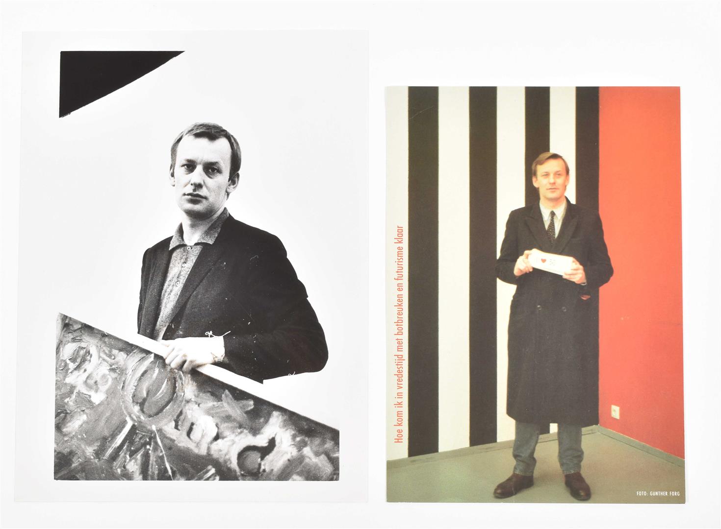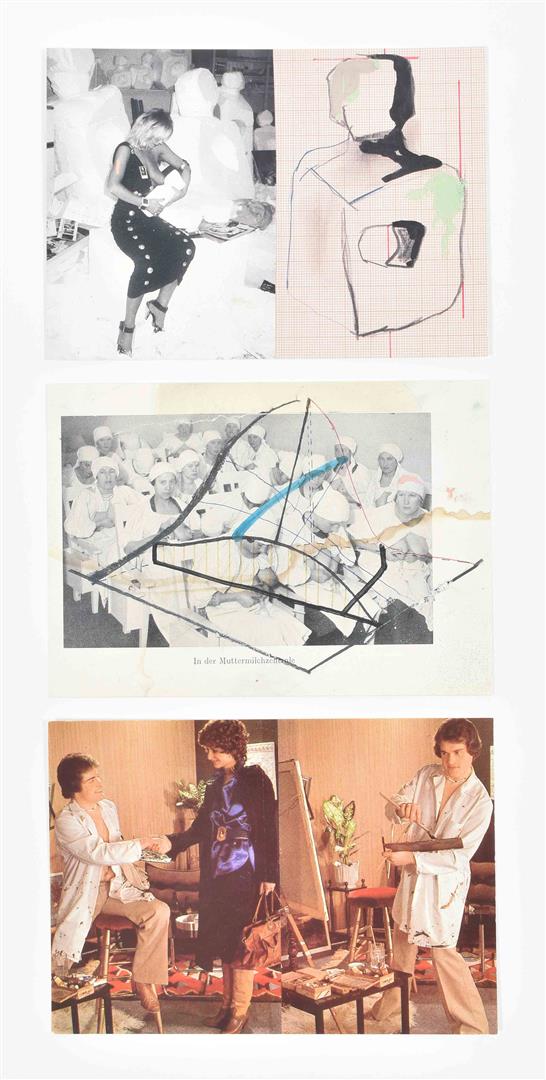 (3) Kippenberger zum Thema Fiffen, Faufen und Ferfaufen. Exhibition poster for Studio F Ulm, 1982. Colour offset, 60 x 84 cm, folded in 8. Very good. (4) B/w photo portraying a young Kippenberger, holding a painting. 24 x 18 cm, unknown photographer. Invitation cards include: (5) Three cards by Max Hetzler Stuttgart, 1984, 1987 and 1989. (6) Two different cards for the same Kippenberger show at Galerie van Beveren Rotterdam, 1985. Includes a rare artists' card, 21 x 15 cm, featuring a portrait of the artist made by Günther Förg. (7) More cards from: Rudolf Zwirner Cologne, Dany Keller Munich, Galerie Klein Bonn (all 1983), Barbel Grässlin and Heiner Ehrhardt (both Frankfurt 1985). (total 14)