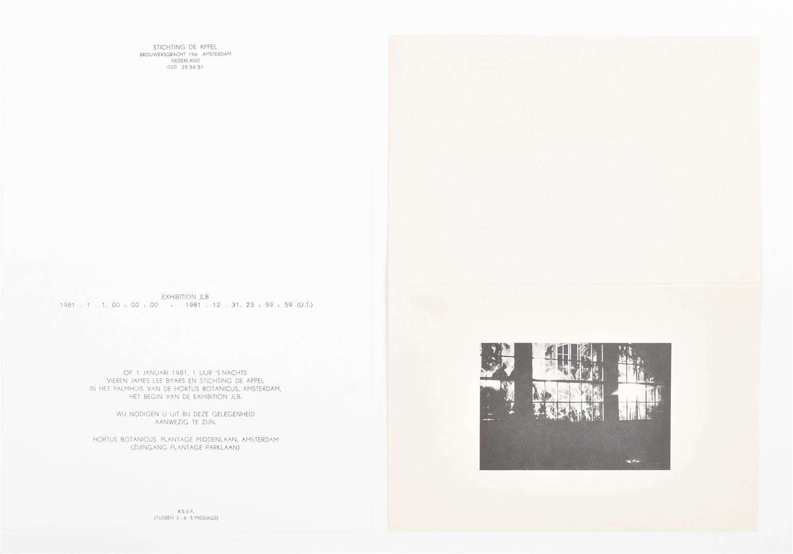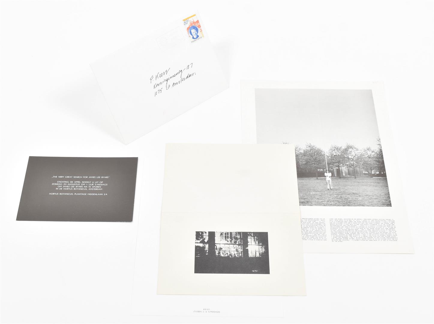 (2) Two folded sheets regarding a JLB event taking place on January 1 1981 at 1 a.m. in the Amsterdam Botanical Gardens, organized by De Appel. One sheet is a personal invitation to join the event (sent in the envelope added in this lot), the other one contains a summary of the event. (3) The Very Great Search for James Lee Byars. Double sided postcard printed white on black, published in conjunction with a James Lee Byars performance at the Hortus Botanicus on August 23, 1981, organized by De Appel. This copy addressed to Helen van der Mey. (total 5)
