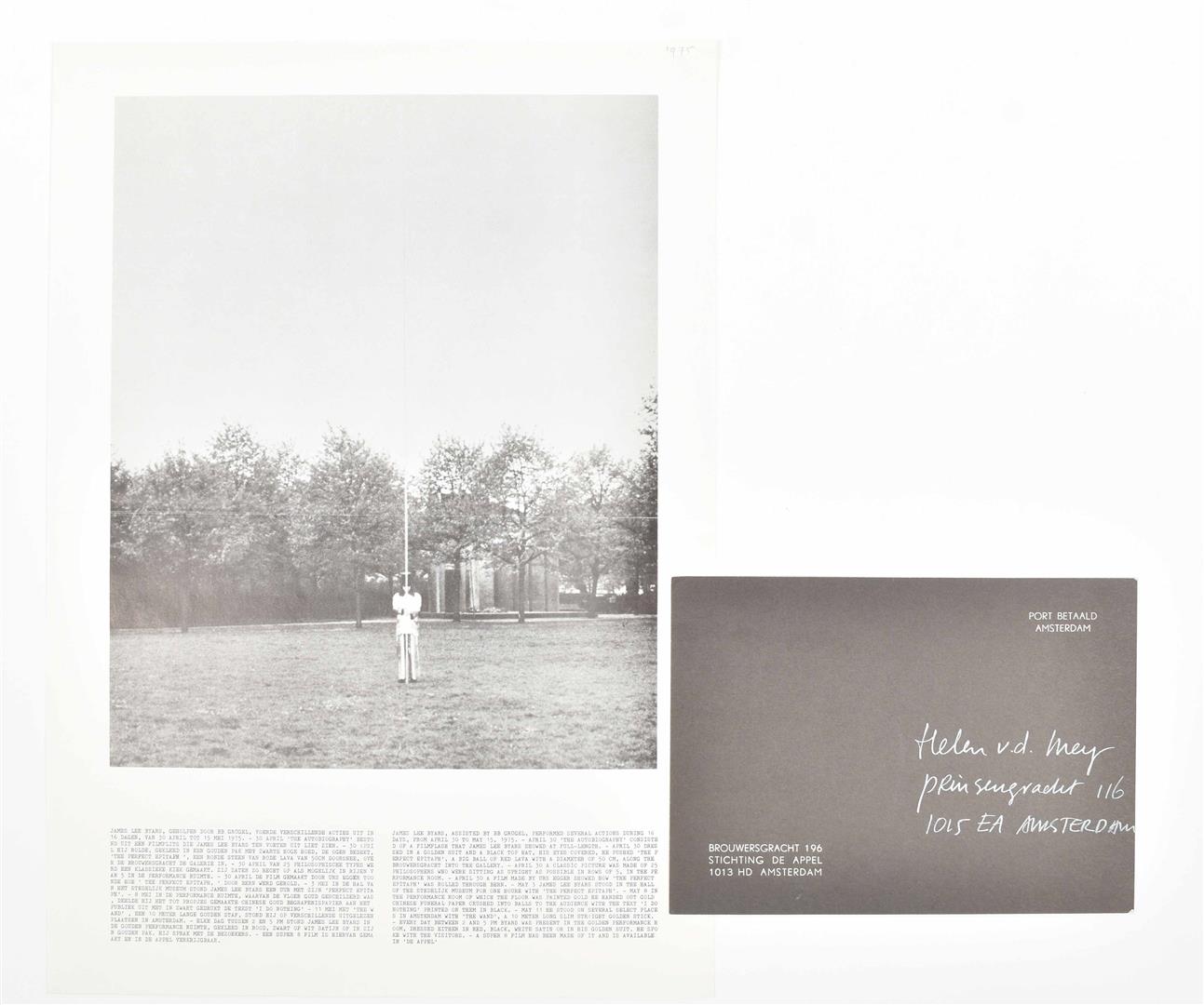 (1) Folded A4 sheet, listing James Lee Byars actions that took place in Amsterdam between April 30 - May 15 1975. Shows a b/w image of the artist holding a golden stick during one of the actions. Stamp of De Appel on verso.