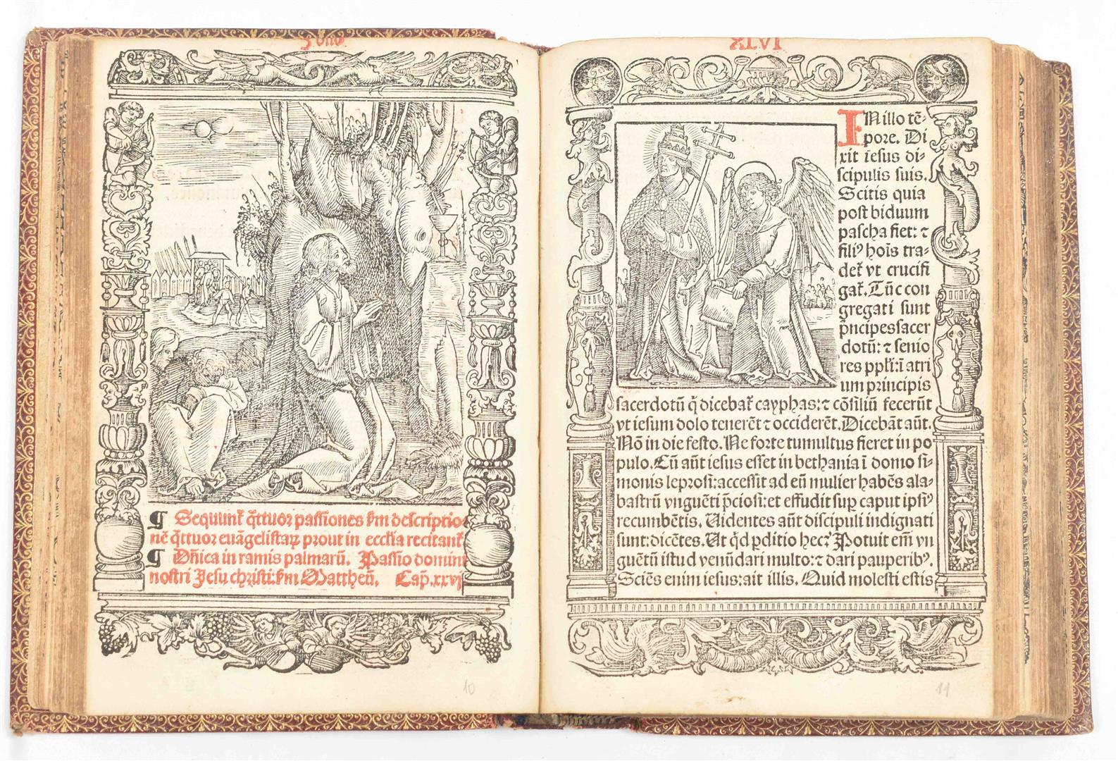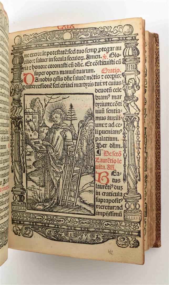 ut tabulam in huius calce annexa[m] intue[n]ti pate[n]tissim[u]m erit. Printed by Johannes Clein. Lyon. 1518 [for Anton Koberger, Nuernberg]. Sm. 8vo, 19th cent. red mor., gilt edges w. blind stamped round lining, gilt title on spine, line border w. sm. ornamental corners, marbled endpapers w. typogr. line borders. Text in red and black. Illustrated title in woodcut [Virgin Mary w. Child], kalendarium, prayers, the life of Brigitte and index; all in woodcut illustrated borders (some of these w. year 1515), (38) p., 209 folio leaves (=418 p.), (2),(1) p.