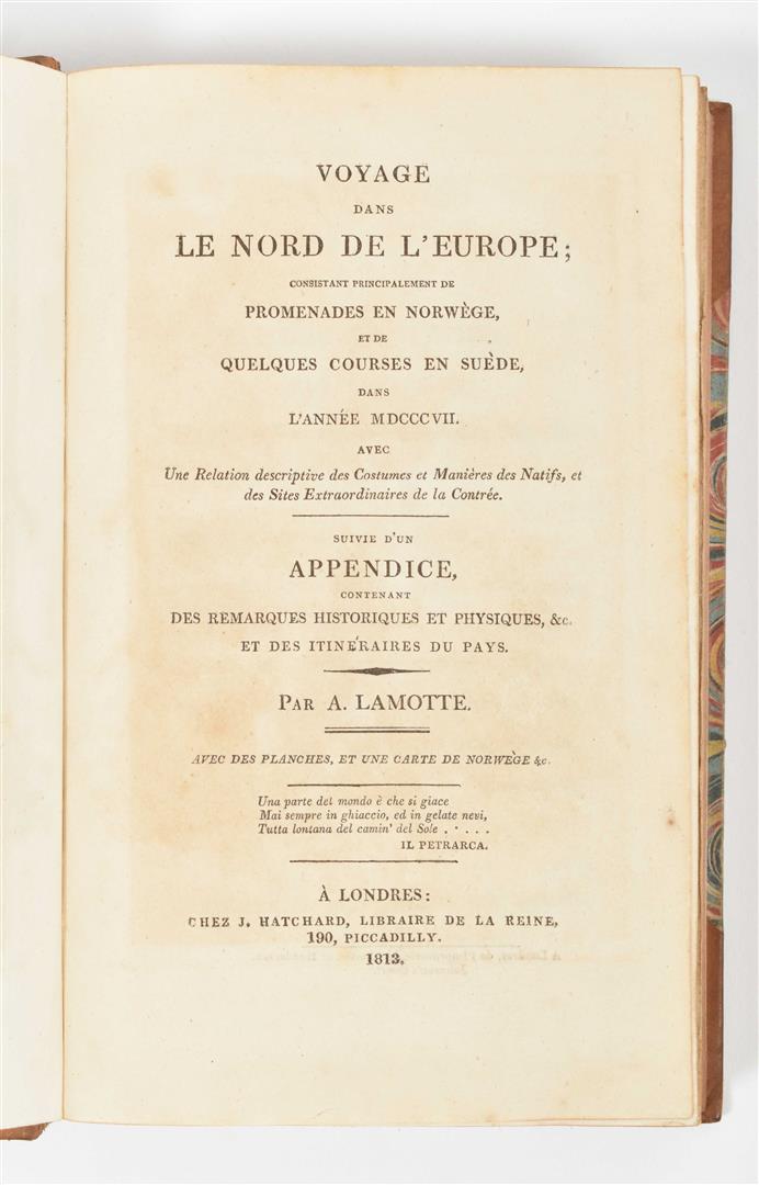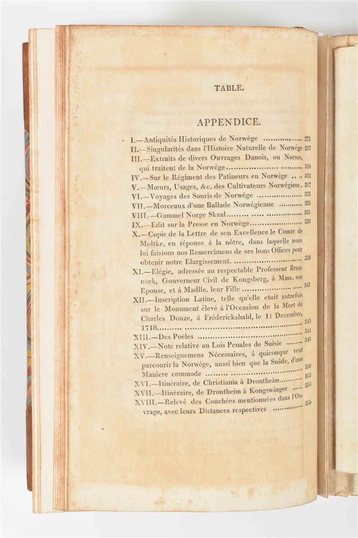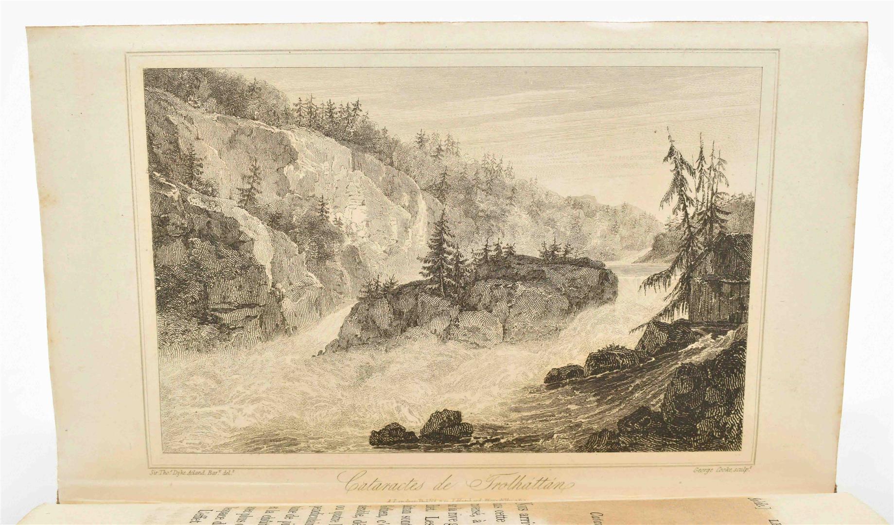consistant principalement de promenades en Norwège, et de quelques courses en Suède (...). London, J. Hatchard, 1813. 1st ed. (26),356 p. Complete w. frontisp., engr. title-p., fold. map of southern Norway (on linen), and 12 engr. plates. Hcalf w. marbled paper boards, gilt title on spine. 8vo.