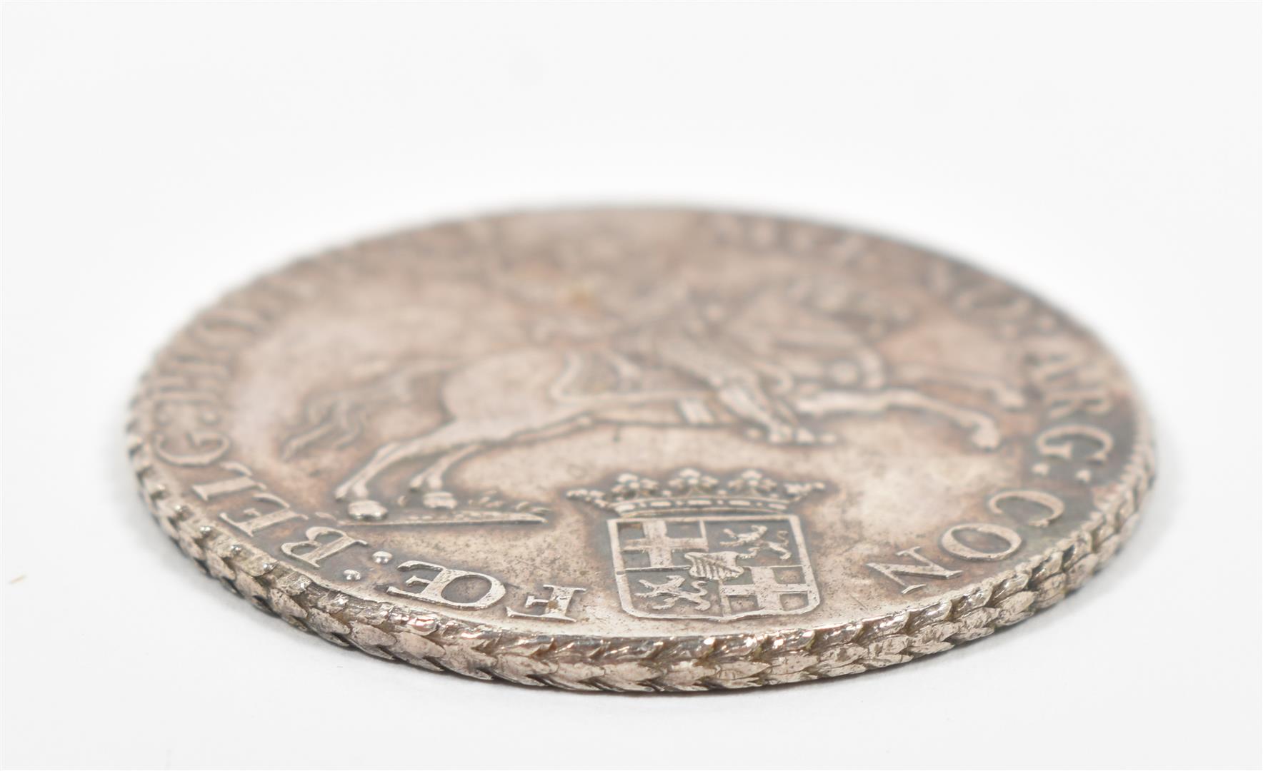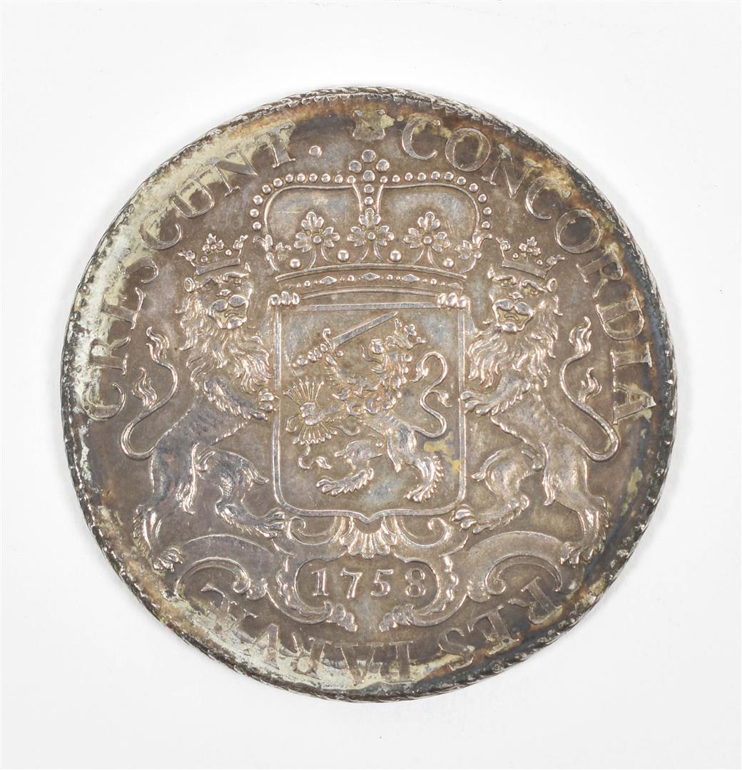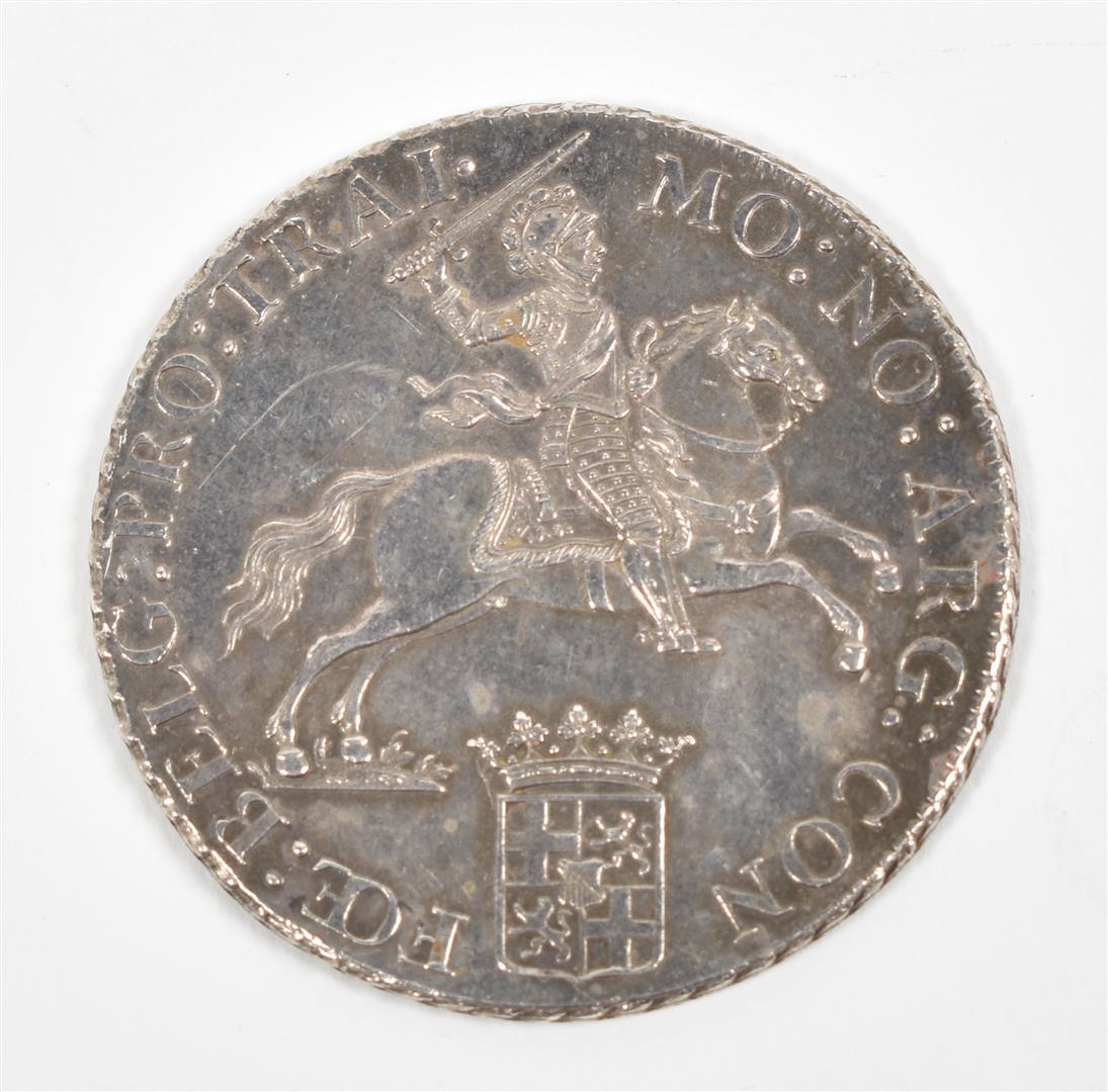 Silver, 43 mm, 1758. Armoured knight riding a horse and brandishing a sword, crowned coat of arms of the province of Utrecht below. Reverse w. crowned coat of arms of the United Provinces, w. lion supporters, date in cartouche below. In 1659 the Dutch states started production of this 'silver rider' ducaton; they were minted until 1798.