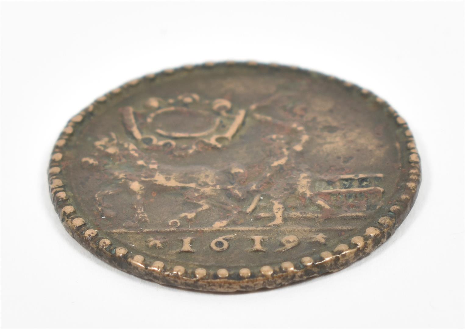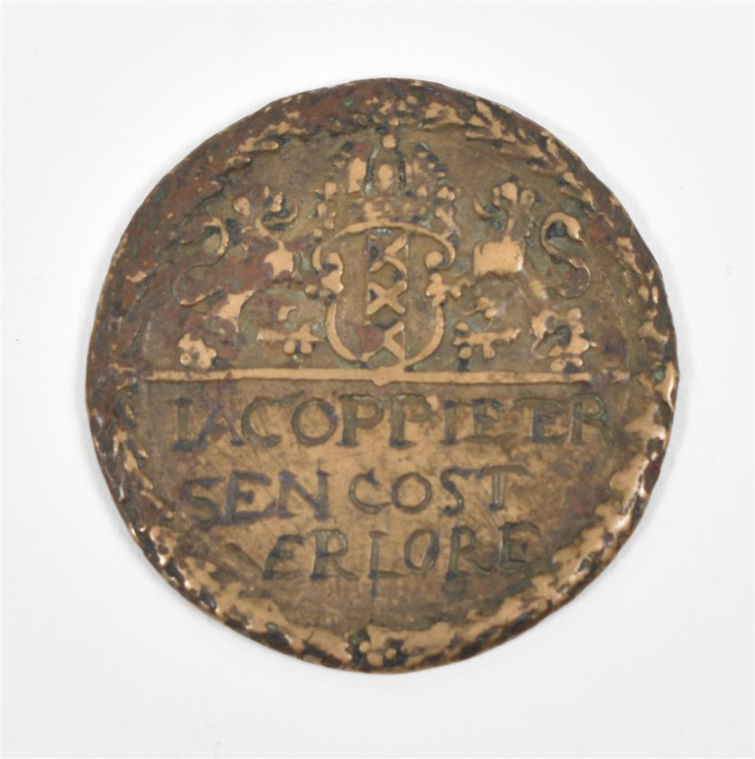 Brass coin, 1619. 30mm. Possibly Amst. region. W. name of Jacop Pietersen Costverlore.