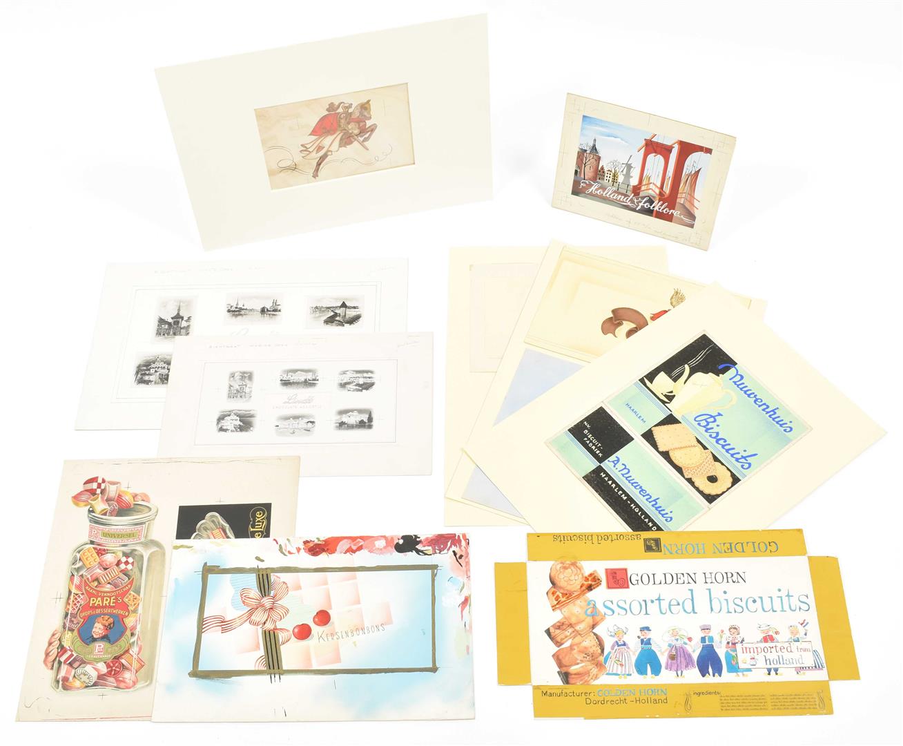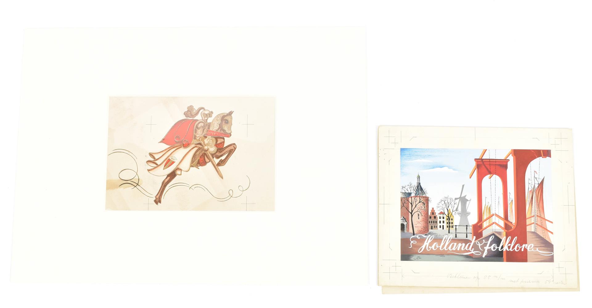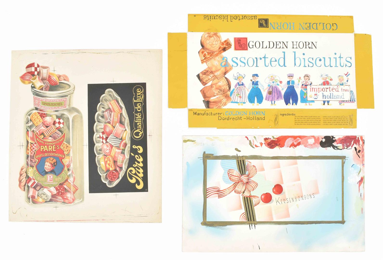(1) "Golden Horn assorted bisquits". Design in gouache and collage, for the cover of a box for Golden Horn, Dordrecht, ca. 1950, total size 22 x 39.5 cm. (2) "Nuwenhuis Biscuits". Fold. design in gouache for the cover of a box for N.V. Bisquitfabriek A. Nuwenhuis, Haarlem, ca. 1950, total size 27 x 19 cm, mounted at upper margin. (3) "Holland folklore". Original design in gouache on board, ca. 1950, total size 18 x 22 cm (incl. borders w. annotations in pencil. Very fine, brightly coloured design.