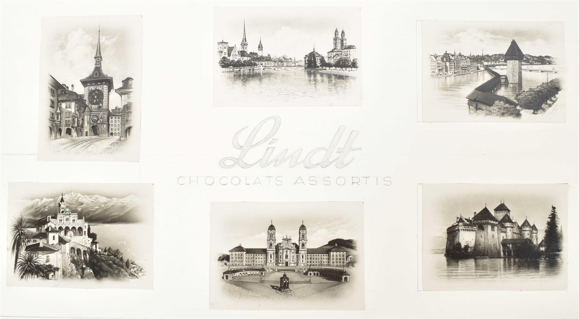 -and 11 others, incl. 2 designs in diff. sizes for boxes of Lindt Chocolats assortis, both incoporating the same 6 photogr. views. Added: an earlier col. lithogr. illustration for Paré fabriek van drops & Dessertwerken. (total 15)
