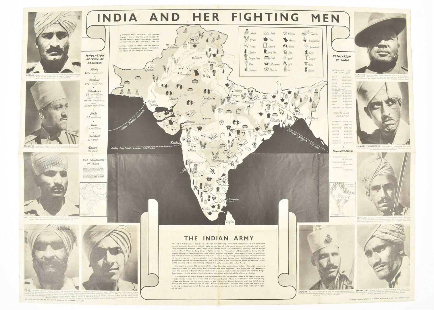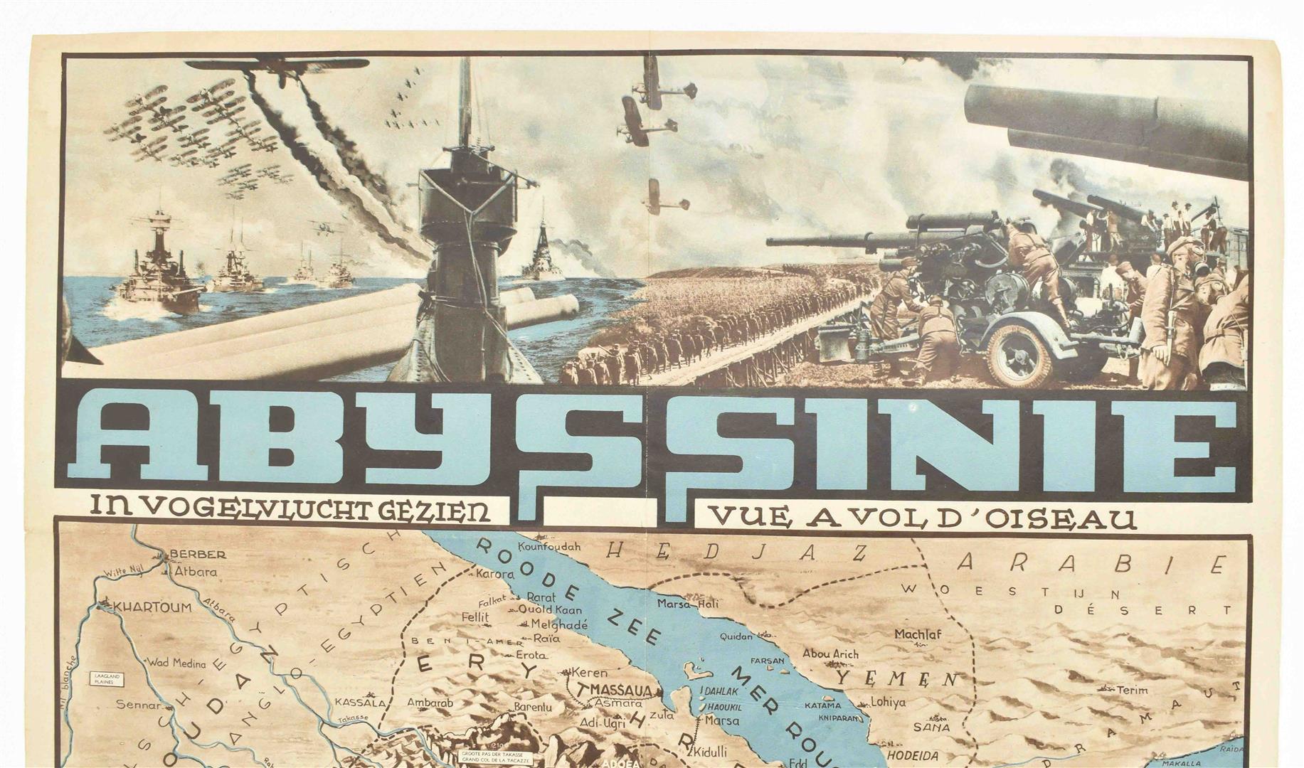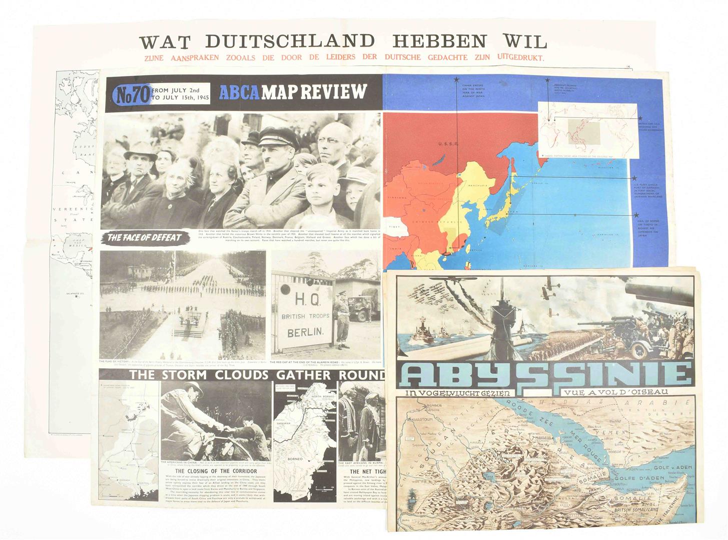 1930s and 40s. (1) Abyssinië in vogelvlucht gezien, w. photos of the most important leaders of the time. Des. by W. H. Seghers. Antwerp, Patria N.V., 1935. 55 x 88 cm. (2) Wat Deutschland hebben wil. Large map of the countries Germany wanted to occupy. London, Stanford's Geographical Establishment, 1930s. 76 x 112 cm. (3) Informative 2-sided poster about the Indian army in 1945. London, Fosh and Cross LTD, (1951?). 76 x 100 cm.
