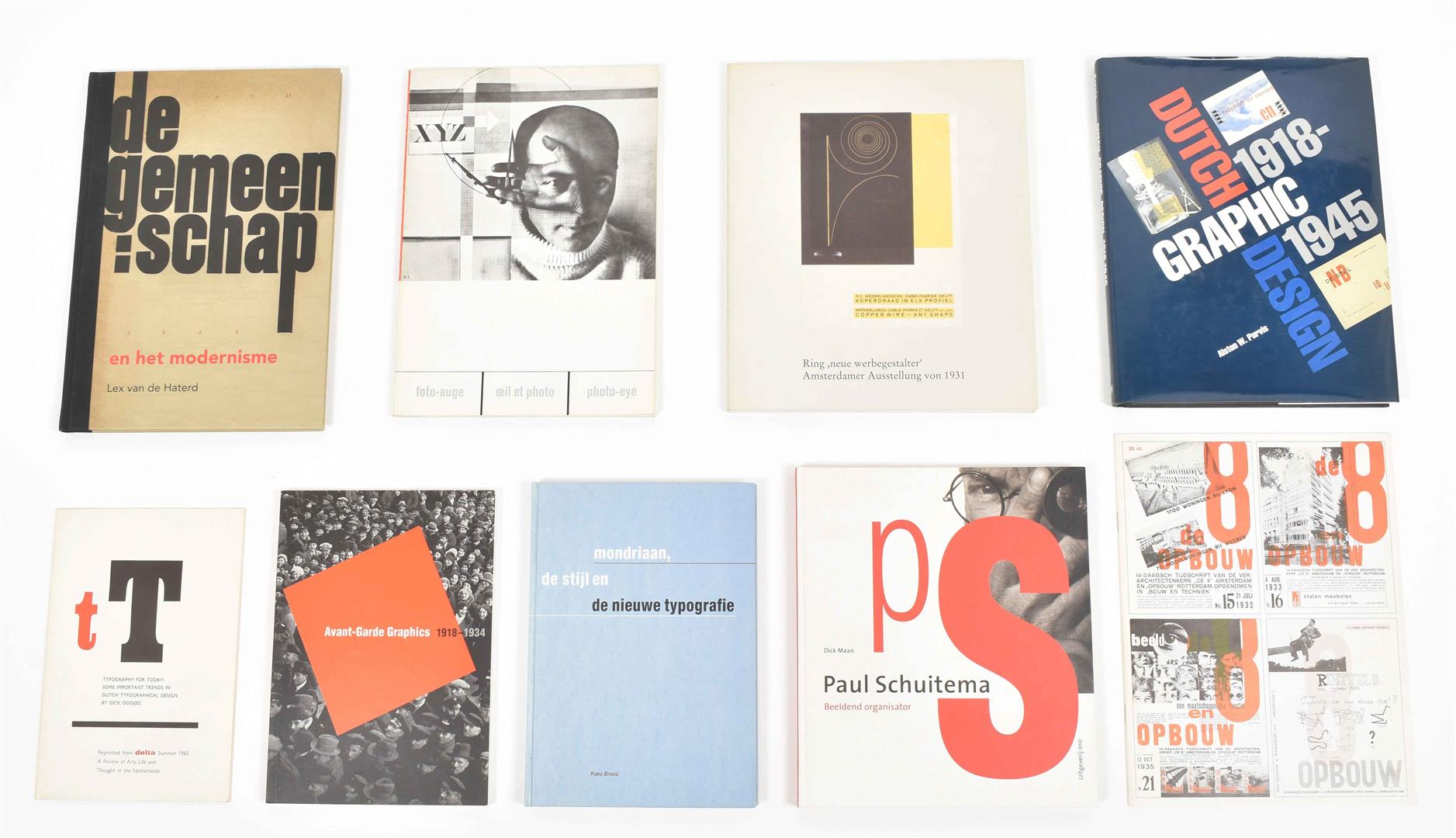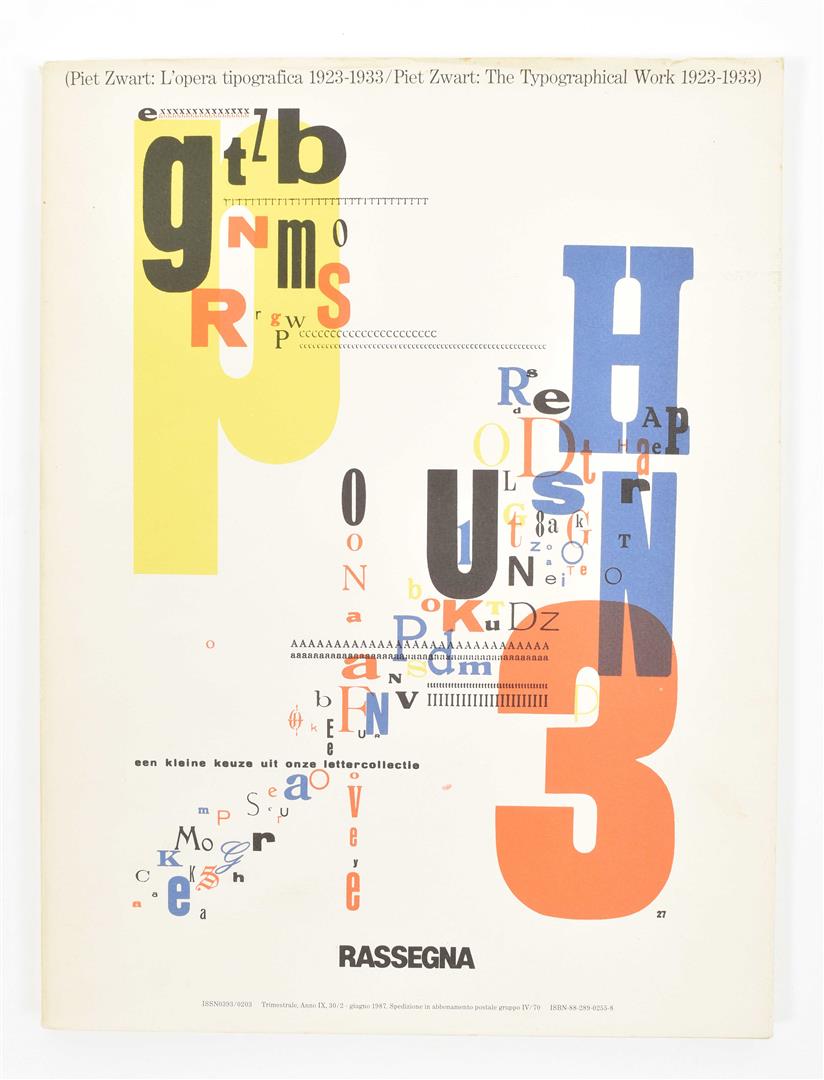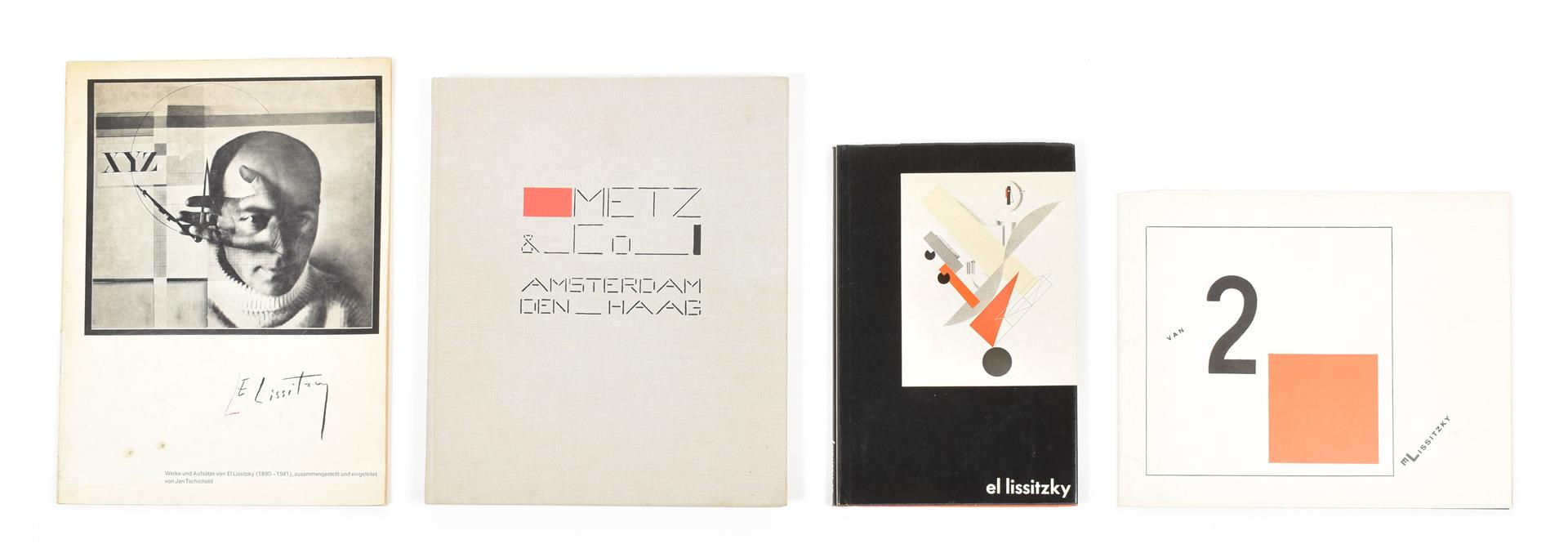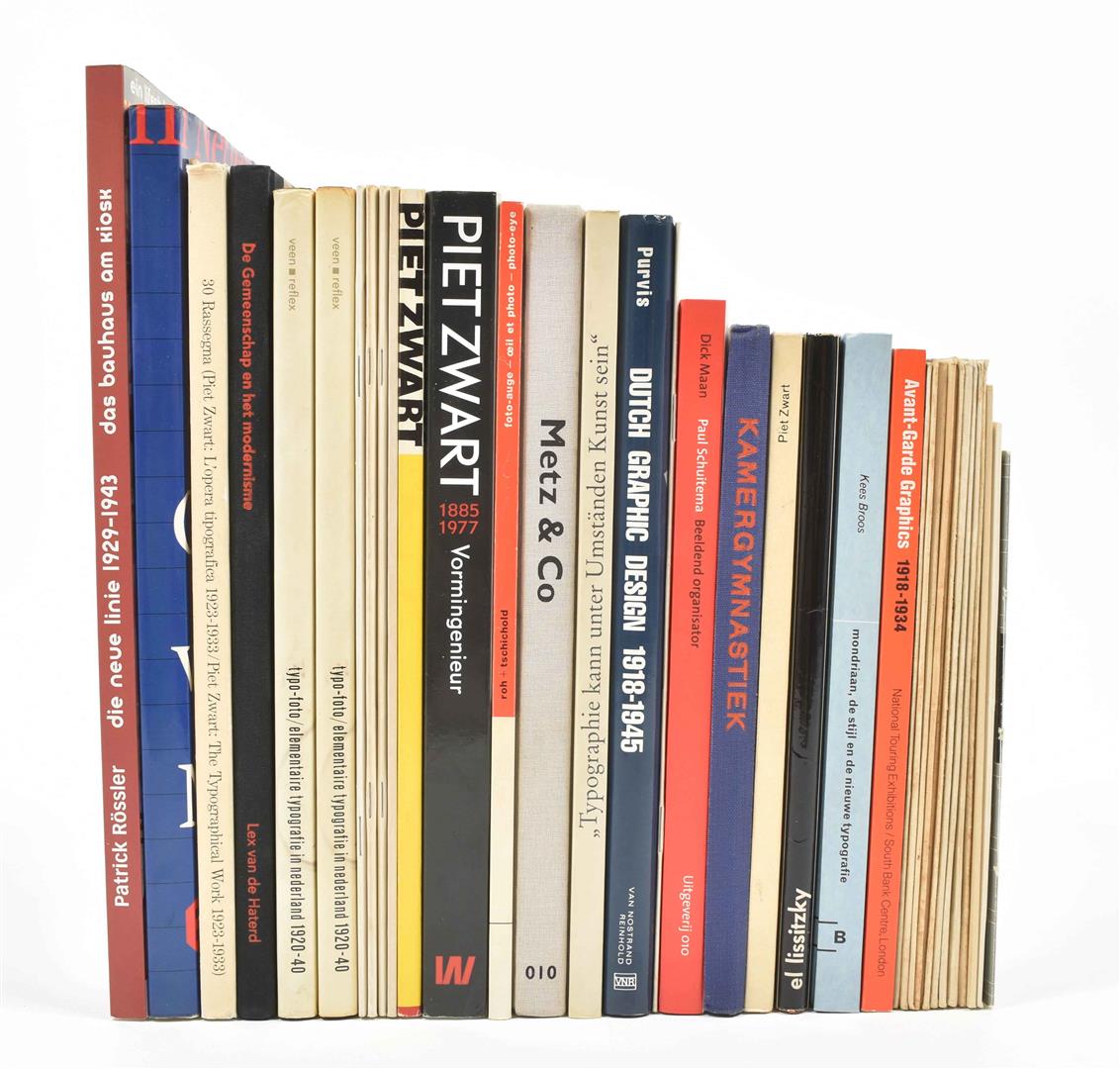 (1) Piet Zwart: L'opera tipografica 1923-1933/ Piet Zwart: The Typographical Work 1923-1933. N.pl., Rassenga, n.d. Sc w. ill. dust-j. (2) Piet Zwart. Ed. Fridolin Müller, introd. by Peter F. Althaus. Teufen, Miggli, 1966. Hc. (3) Tegen de lust. Piet Zwart Prijs 1991. Sc. -and 3 other works des. by/ on Zwart, incl. Kamergymnastiek voor iedereen w. 10 posters. (4) El Lissitzky. Worden van twee kwadraten in 6 konstrukties. Maastricht, Gerards & Scheurst, 1985. Unnumb. copy (of 50). Cordbound in cardboard wr. -and 2 other works about Lissitzky. (5) Petra Timmer. Metz & Co de creatieve jaren. Rott., 010, 1995. Cl. -and 16 others.