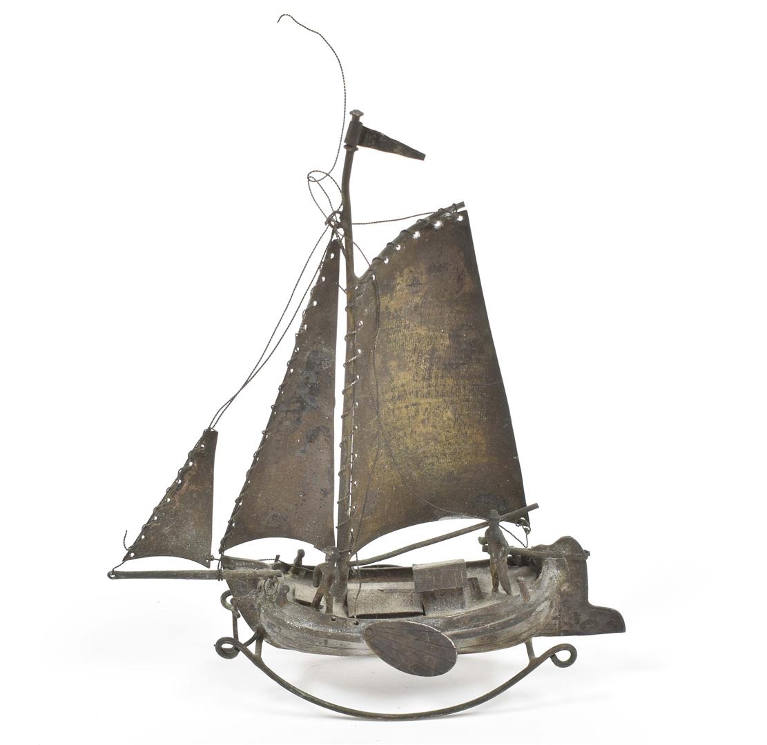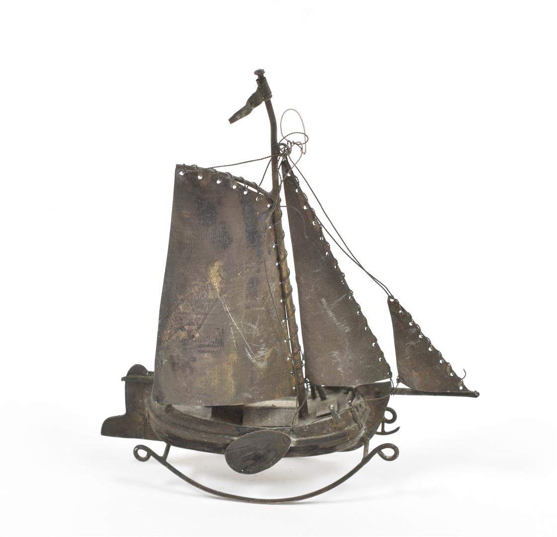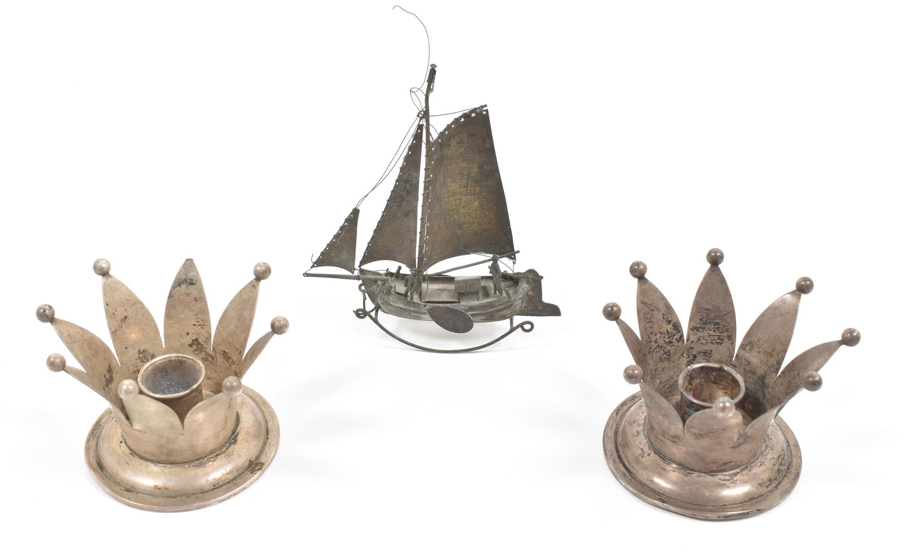 (1) 2 matching crown candlestick holders (1 sl. dam.). Both 7 cm tall. (2) Rocking model ship. 13.5 cm tall.