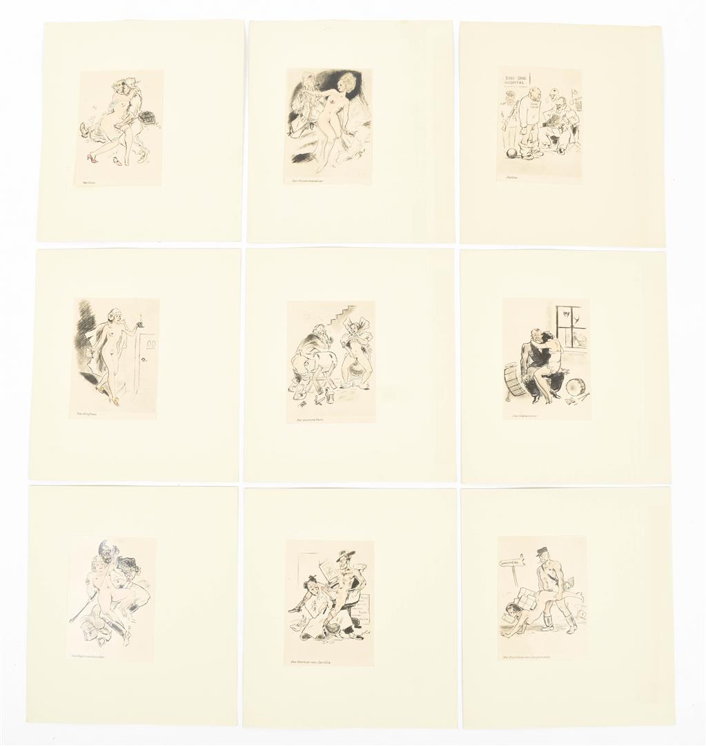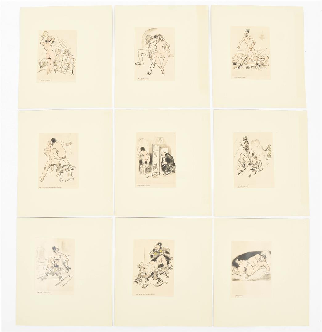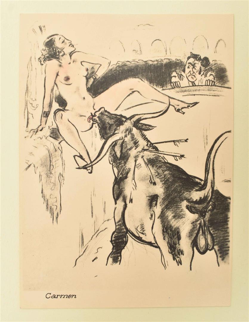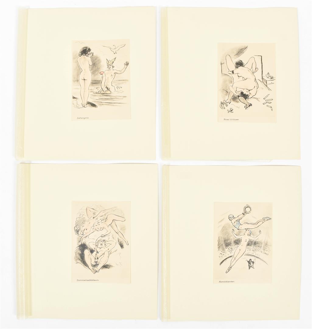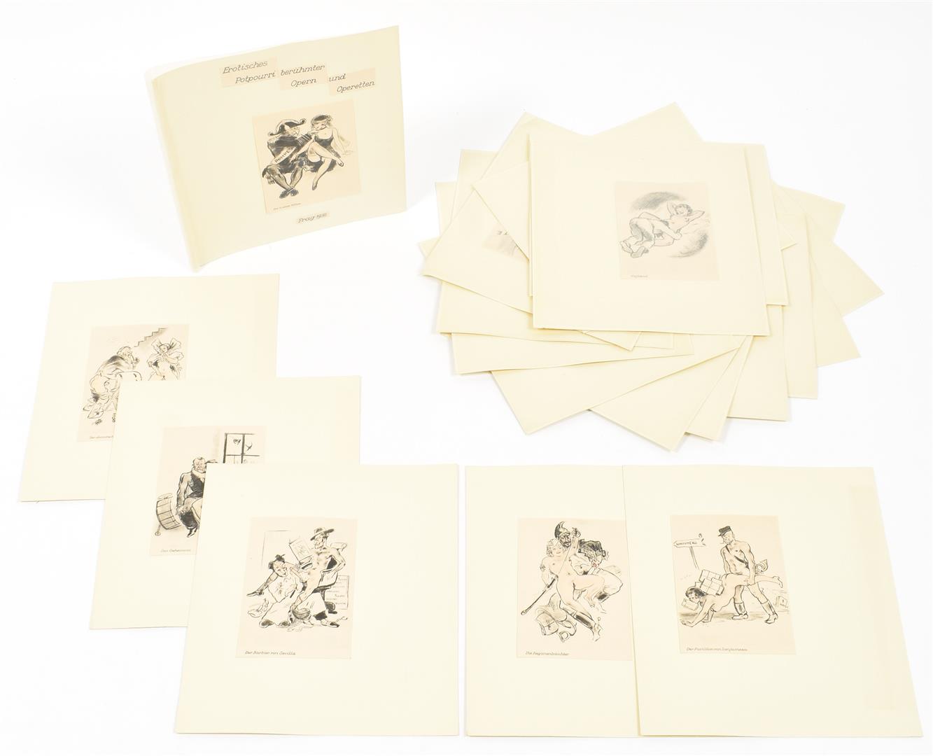 Anon. Prag 1932. Photographic reproduction, 2nd half 20th cent. of 46 ills. after (unknown?) drawings of erotic twists of famous operas and operettes such as Der rasende Roland, Sommernachtstraum, Carmen, der Feuervogel, Lohengrin etc. Mounted on 23 thick (late 20th cent.) loose paper leaves, taken from another album (traces of dark paper at verso). Each photo ca. 15.5 x 11 cm.