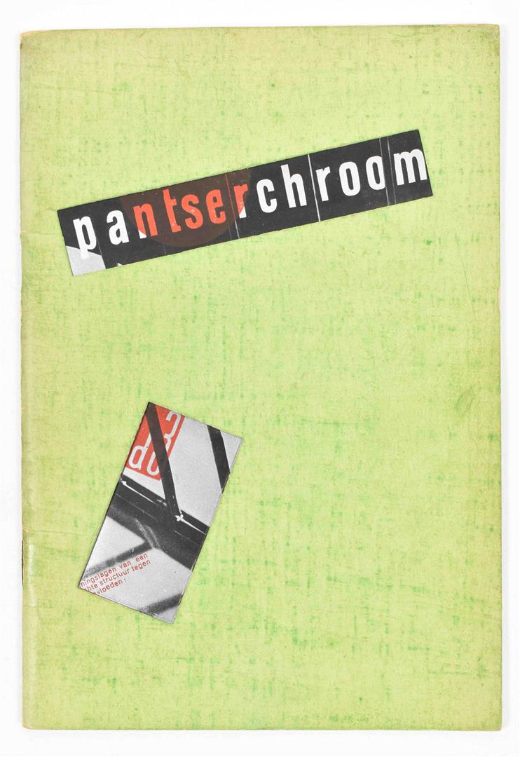 Paul Schuitema, Arie Verbeek, W. van Gelderen, Ir. J. van Ettinger. Fotografie Dick Elffers en Valdemar Ellenbaas. Typografie Dick Elffers. Rott., D3, n.d. (ca. 1930), (32) p., num. photogr. ills., orig. stapled green wr. covering metallic wr. w. photomontage by Elffers, w. 2 small windows in frontwr. showing the word "Pantserchroom", the mark D3 and part of the photomontage.