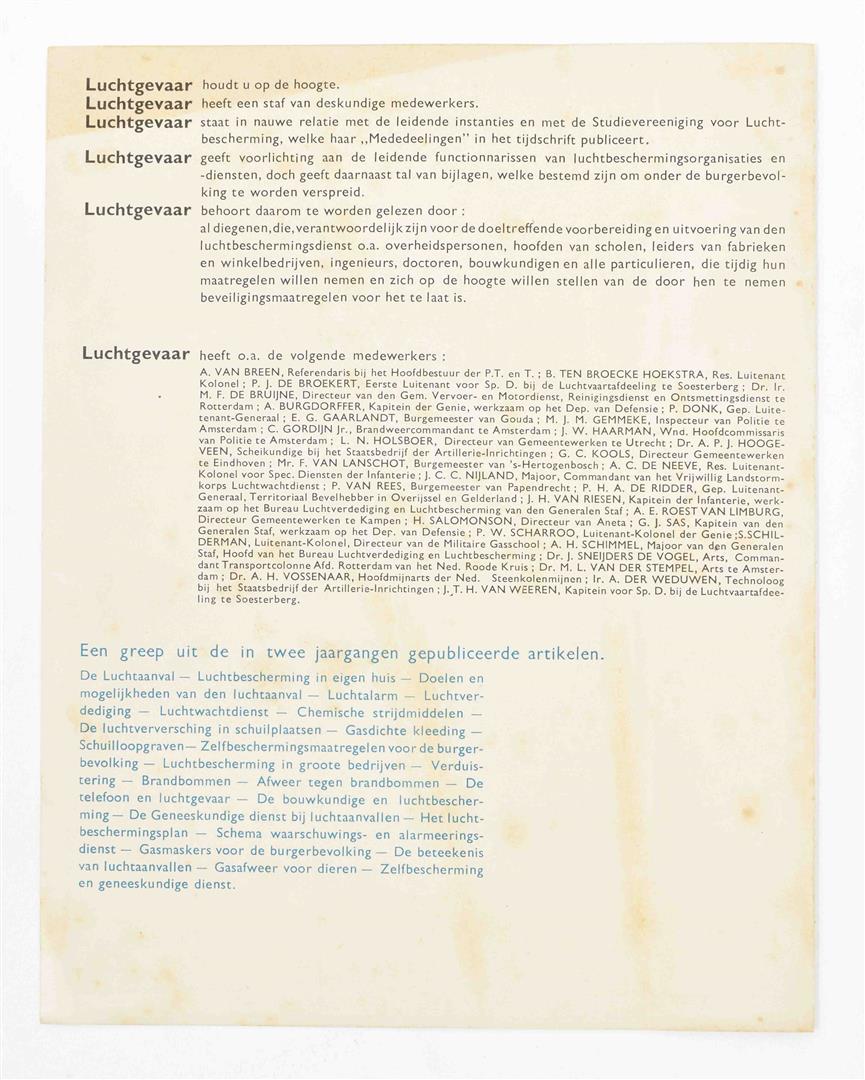 Luchtgevaar. Maandtijdschrift voor Luchtbescherming. Abonnementsprijs per jaar 4 gld. Prospectus for the periodical, bifolium, 19.7 x 25.2 cm (unfolded), Leyden, A.W. Sijthoff, n.d. (1935), w. photomontage and typography by Piet Zwart.