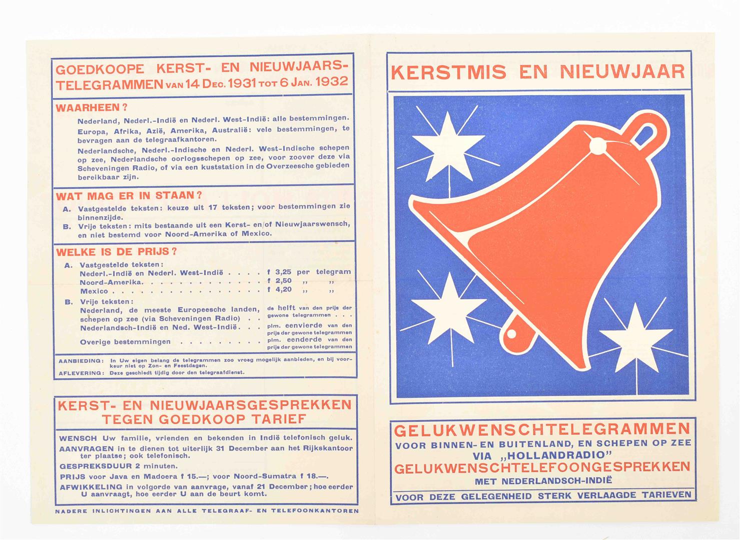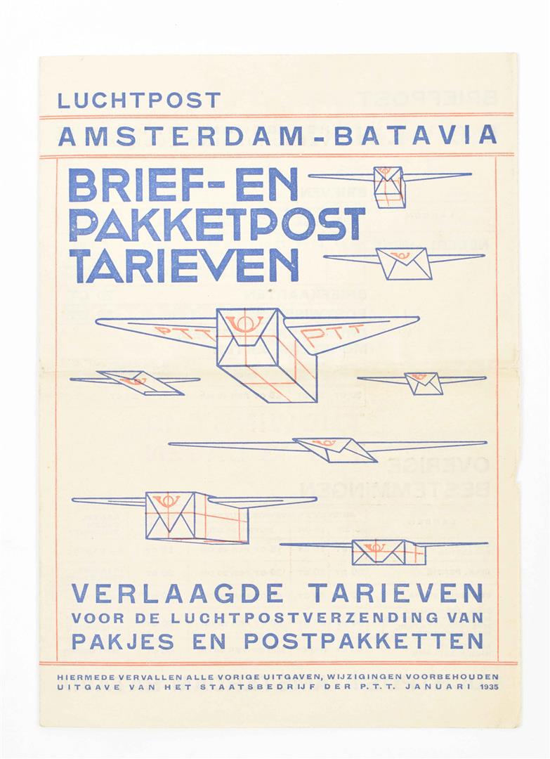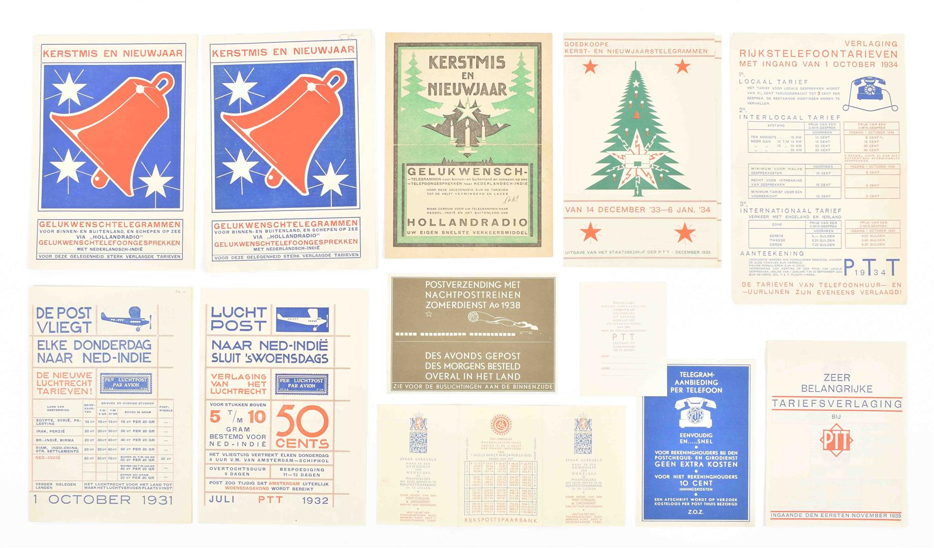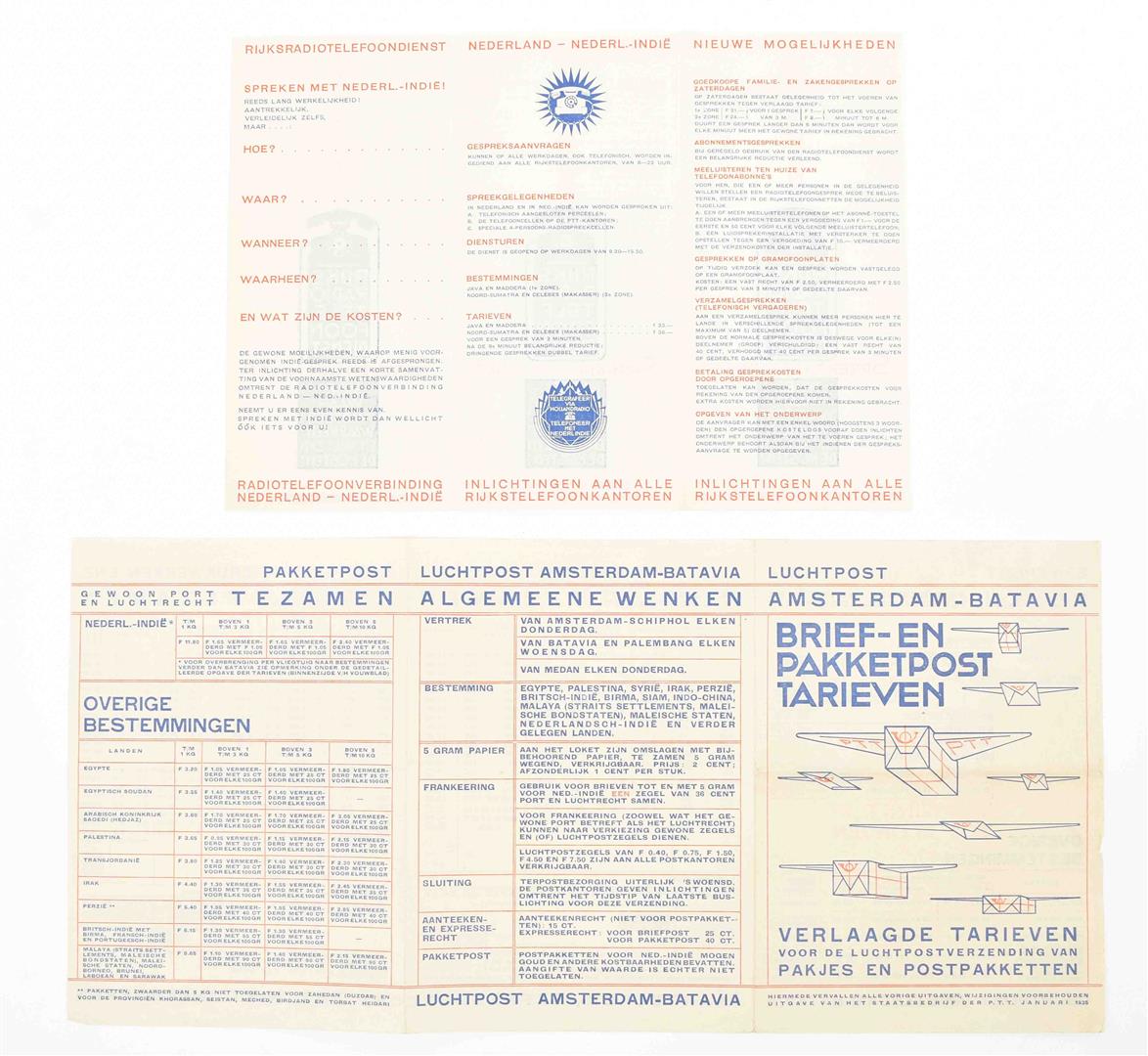 (1) Rijksradiotelefoondienst 1935. (2) Luchtpost Amsterdam-Batavia ca. 1934 (3) Brochure 'Een spoedbericht naar Ned-Indië of Ned-West Indië?', 1938 4 p.