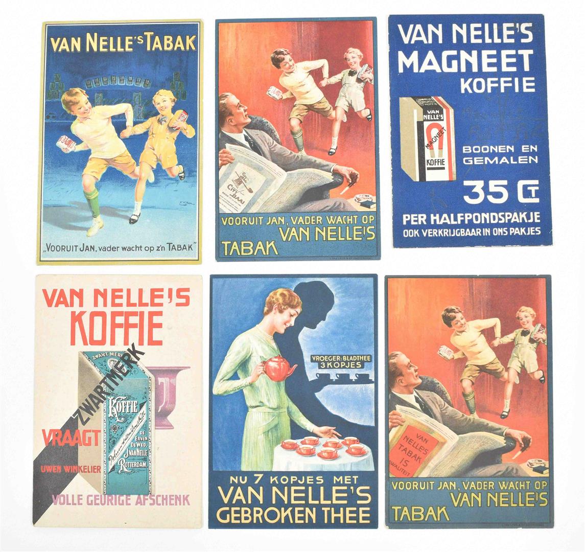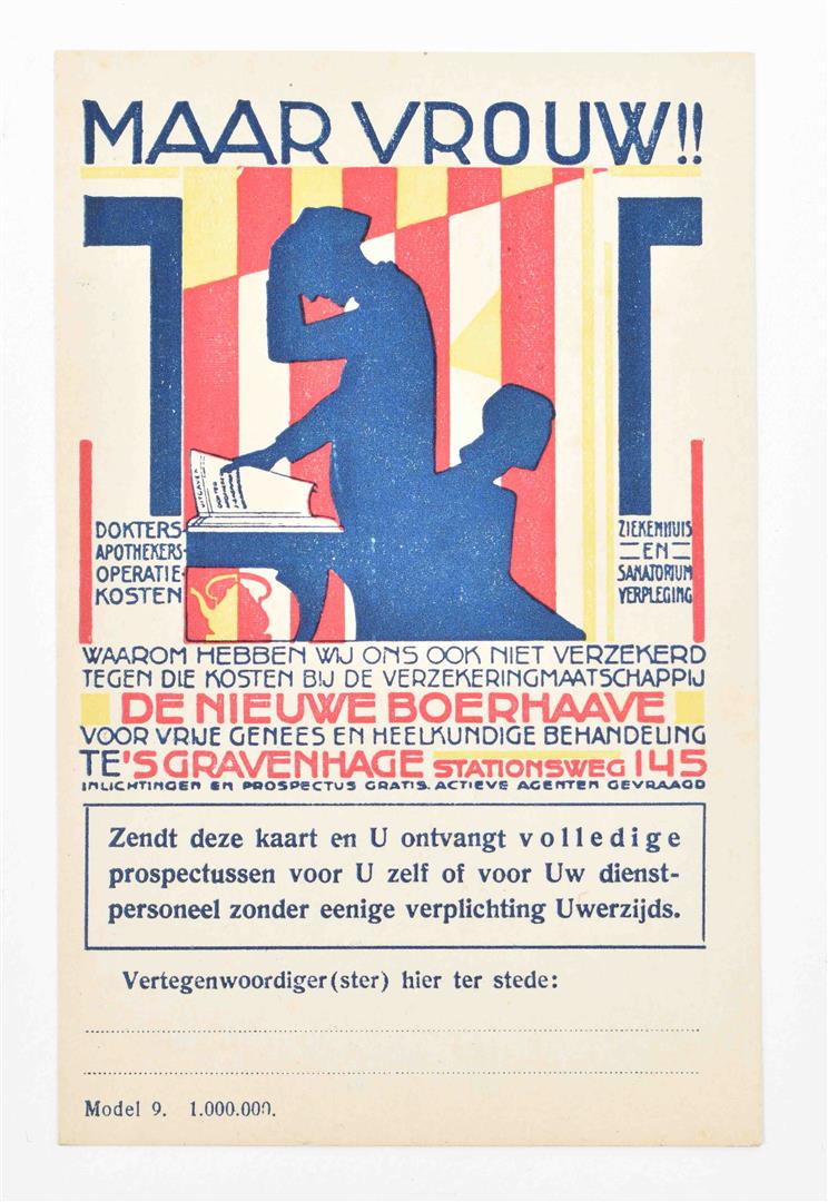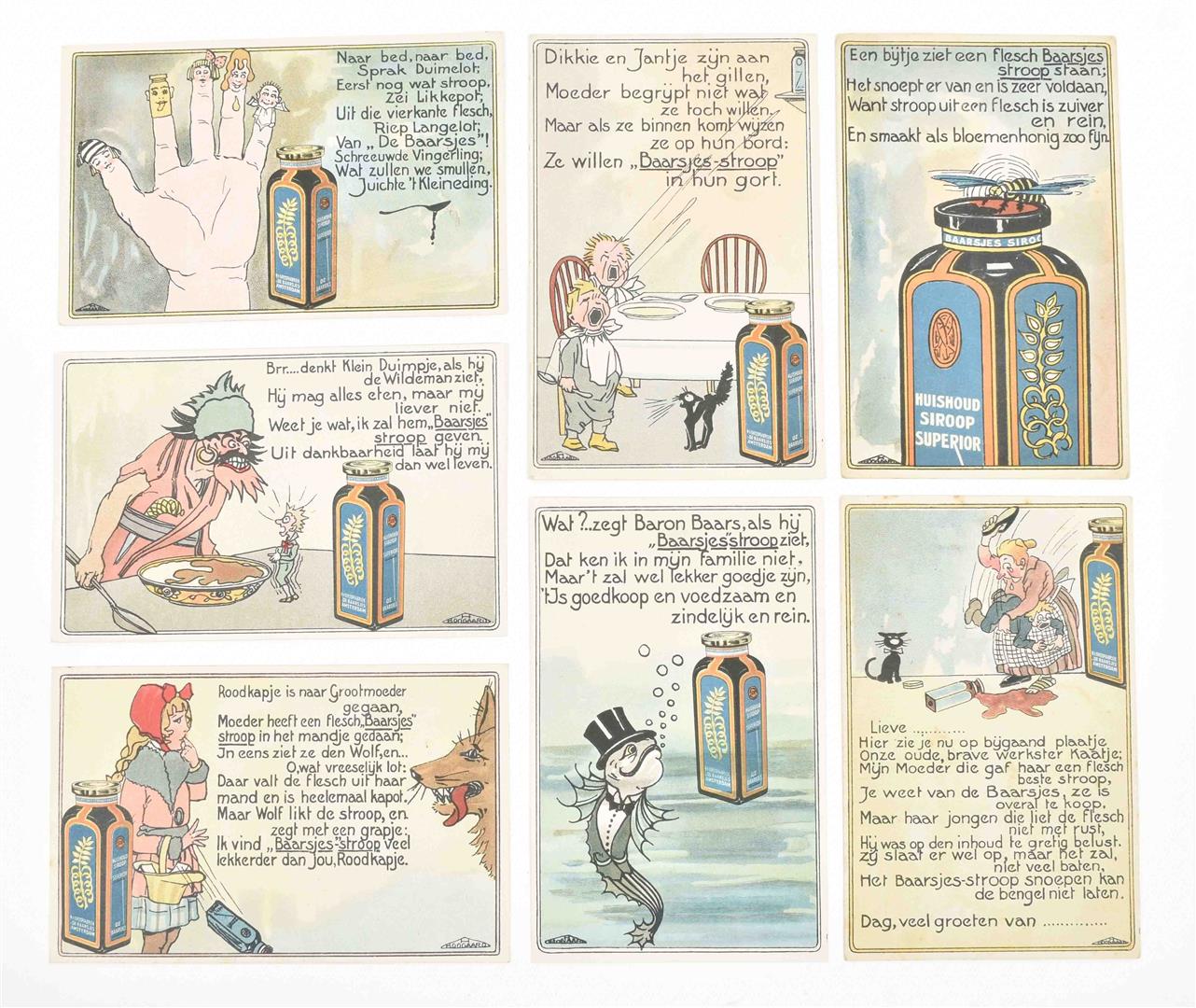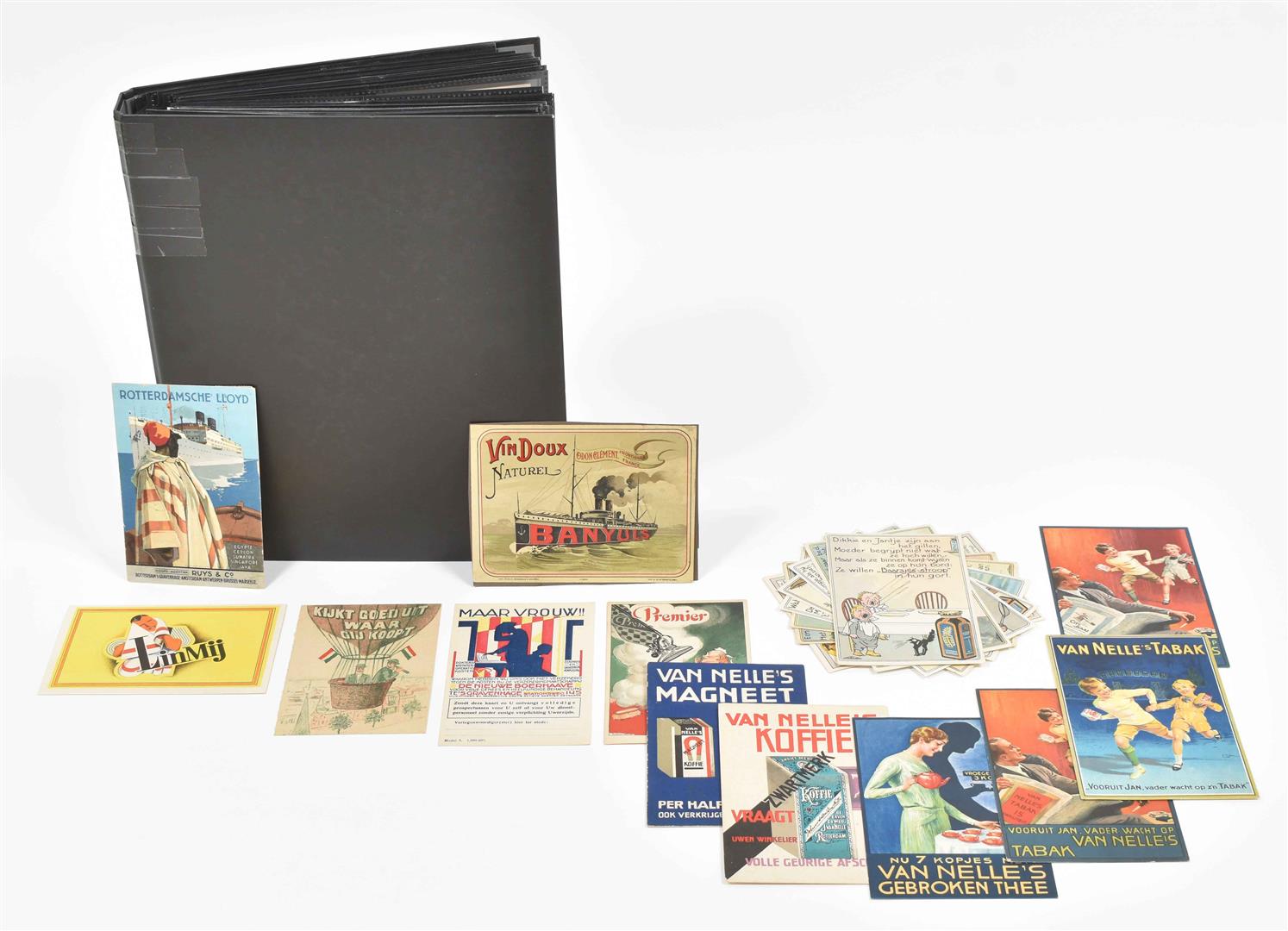 With cards from De Nieuwe Boerhaave; Olympiade Amsterdam 1928; Viruly Zeeppoeder; van Nelle' Tabak, Coffee and Tea; Hoek & Co's drop uit de blikken trommel, Amsterdam. -and various Cacao companies, ferry companies etc. Designs by a.o Willy Sluyter, Alfred Ost, Rie Cramer, Ella Riemersma, etc. Splendid collection.