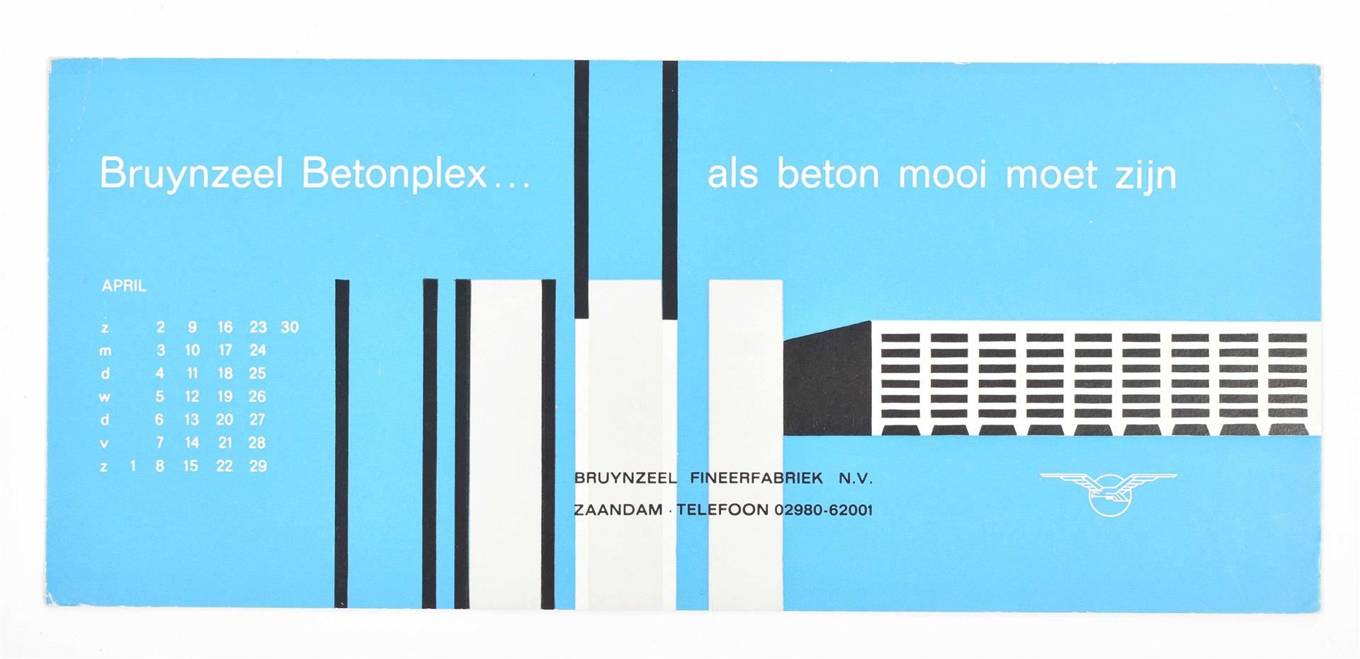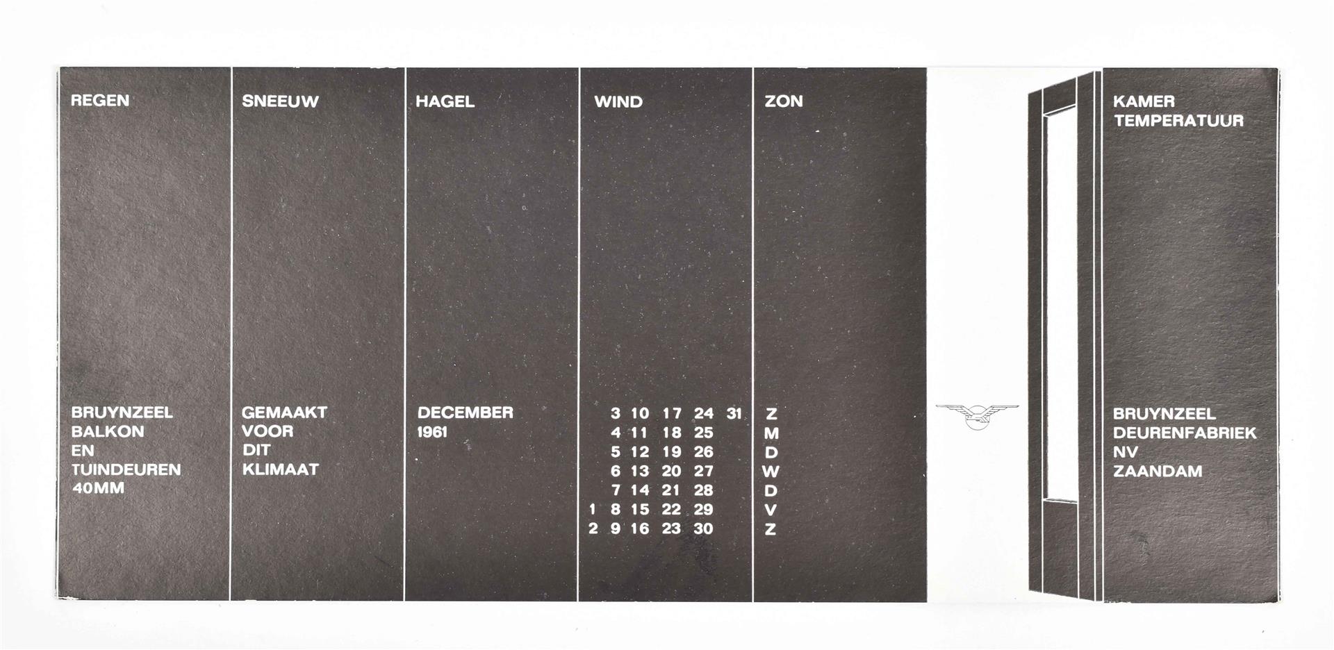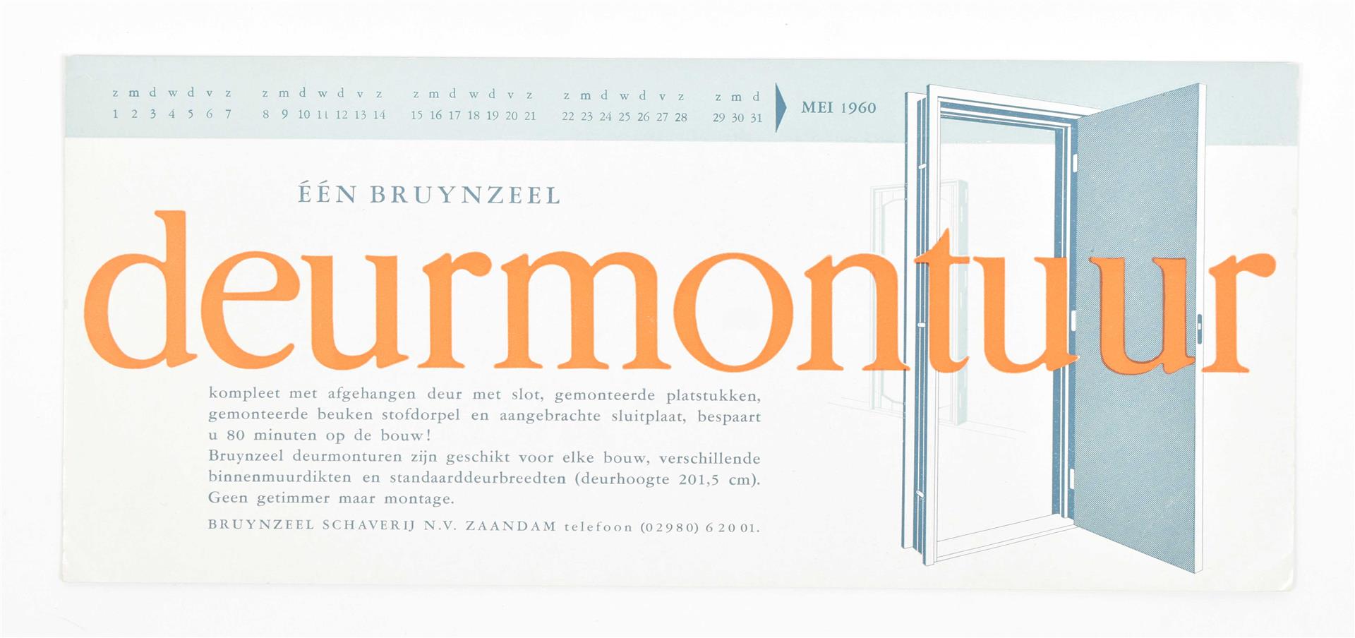 Comprises: (1) "Bruynzeel Betonplex... als beton mooi moet zijn" (April 1960 (?)). (2) "Één deurmontuur kompleet met afgehangen deur met slot (...) bespaart u 80 minuten op de bouw!" (Mai 1960). (3) "Bruynzeel Struktakasten vereenvoudigen en versnellen de bouw" (Sept. 1960, w. (vague) annotations in ballpoint). (4) "Regen, sneeuw, hagel, wind, zon, kamertemperatuur. Bruynzeel balkon en tuindeuren 40 mm, gemaakt voor dit klimaat" (Dec. 1961). (total 4)