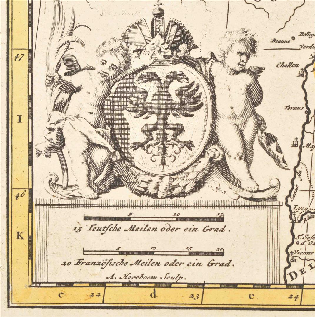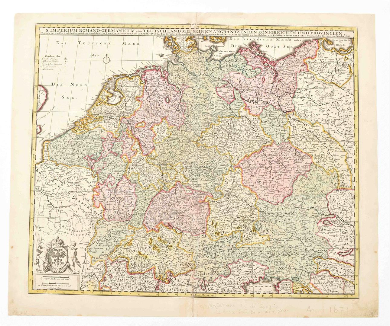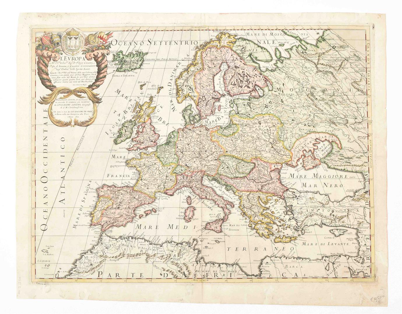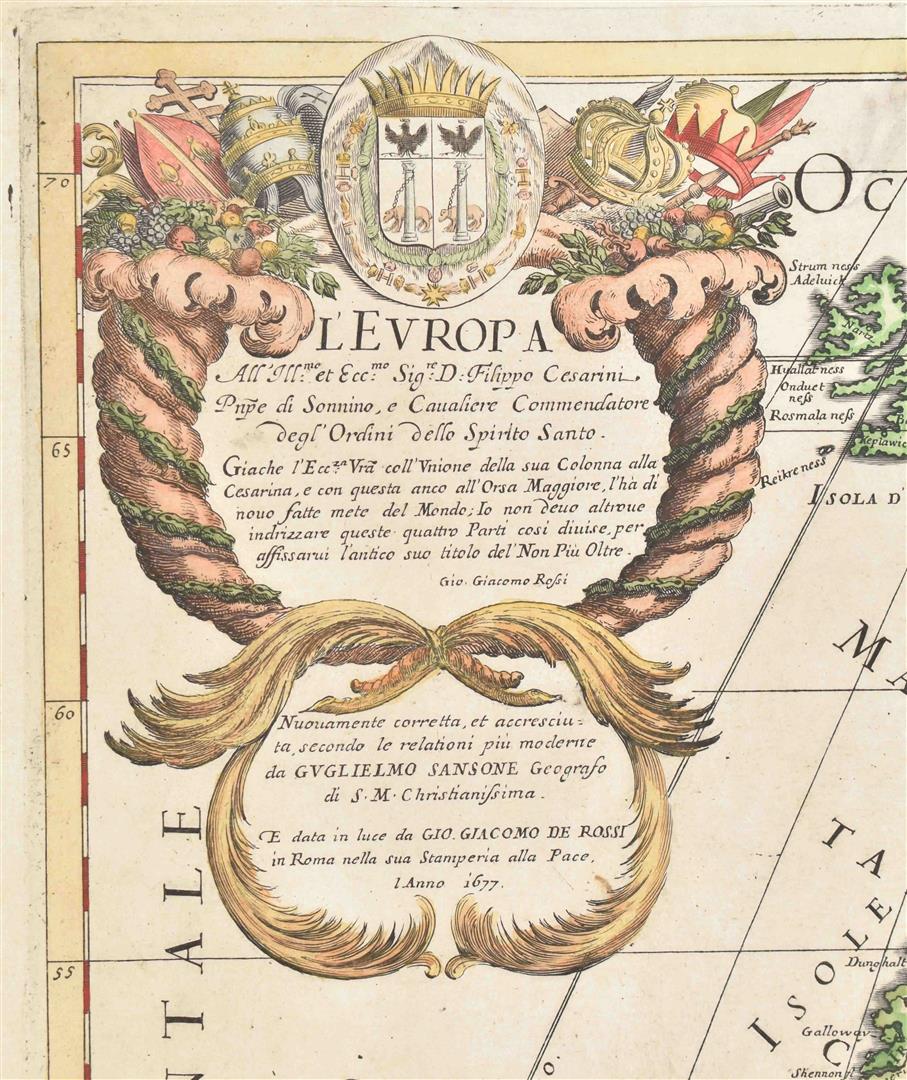 secondo le relationi piu moderne da Guglielmo Sansone Geografo di S.M. Christianissima. E data in luce da Gio. Giacomo de Rossi in Roma nella sua Stamperia alla pace l.Anno 1677. [The Rossi Europe map after Sanson]. 41 x 55 cm. Doubled w. japan paper, col., cartouche w. coat of arms, title, dedication and author. (2) L'Europe divisée en ses principaux Etats, par le Sr Robert de Vaugondy, fils de M. Robert Geographe ordinaire du Roy. 1751. 48 x 58 cm, col. in outline, cartouche w. title and author and table w. scales. Some notes outside the map image. (3) S. Imperium Romano-Germanicum oder Teutschland mit seinen angräntzenden Königreichen. Amst., N. Visscher, ca. 1680. 47 x 57 cm, col., title on top, coat of arms, scales. Some notes w. pencil. Restored.