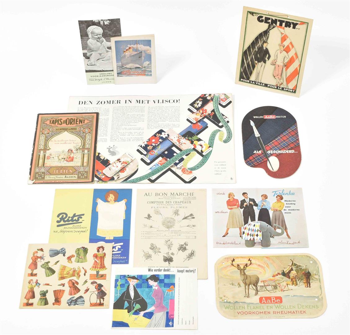 Var. countries, ca. 1885-1970. Incl. a.o.: (1) Etablissements E. Vallon, Paris. Linge de maison. Paris, Kadar, n.d. (ca. 1930), 30 (col.) plates and price list, (24 p.), orig. cord-bound wr., 4to. Rare trade catalogue on tablecloths, issued by "La plus importante fabrique Française de linge de maison." (2) 1er Janvier 1885. Prix-courant des cotons a tricoter de F. d'Aoust & Frères, Bruxelles. Brussels, 1885, (12) p. (incl. orig. stapled wr.), sm. 8vo. Annotations in pen. (3) Ekelenburg, T. van. Geknipt voor U uit de lusthof van textiel. Enschede, N.V. Stoomweverij Nijverheid, n.d. (ca. 1960), 32 p., w. mounted samples of cloth and w. ills., des. by A. van Dijl-Engels, orig. stapled pict. wr. Extremely rare, no other copies traced. (4) Wat draagt Parijs? Paris, Cosette Lucien Vogel for Vliscofabrieken, n.d. (ca. 1929), 12 p., col. ills., orig. stapled wr., sm. 4to. (5) Boutique Vliëre, Amst. Fold. invitation card des. by J. Sark, ca. 1965, unfolded measuring 23 x 26.5 cm. (6) Powe, H., ed. More Rhyme & Reason. London, Spottiswoode, Ballantyne & Co, n.d. (ca. 1930), des. by L. & R. Curtis, (18) p., ill. throughout, orig. stapled stiff paper wr., 4to. With labels and loosely inserted postcard of the firm Wiener Werkstätte in Amsterdam.