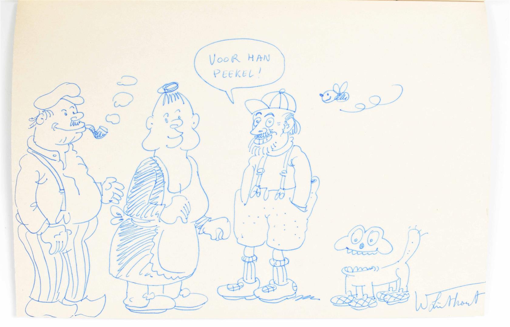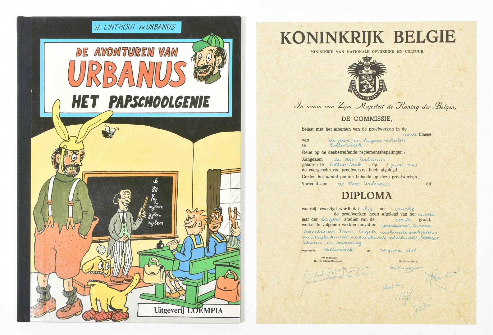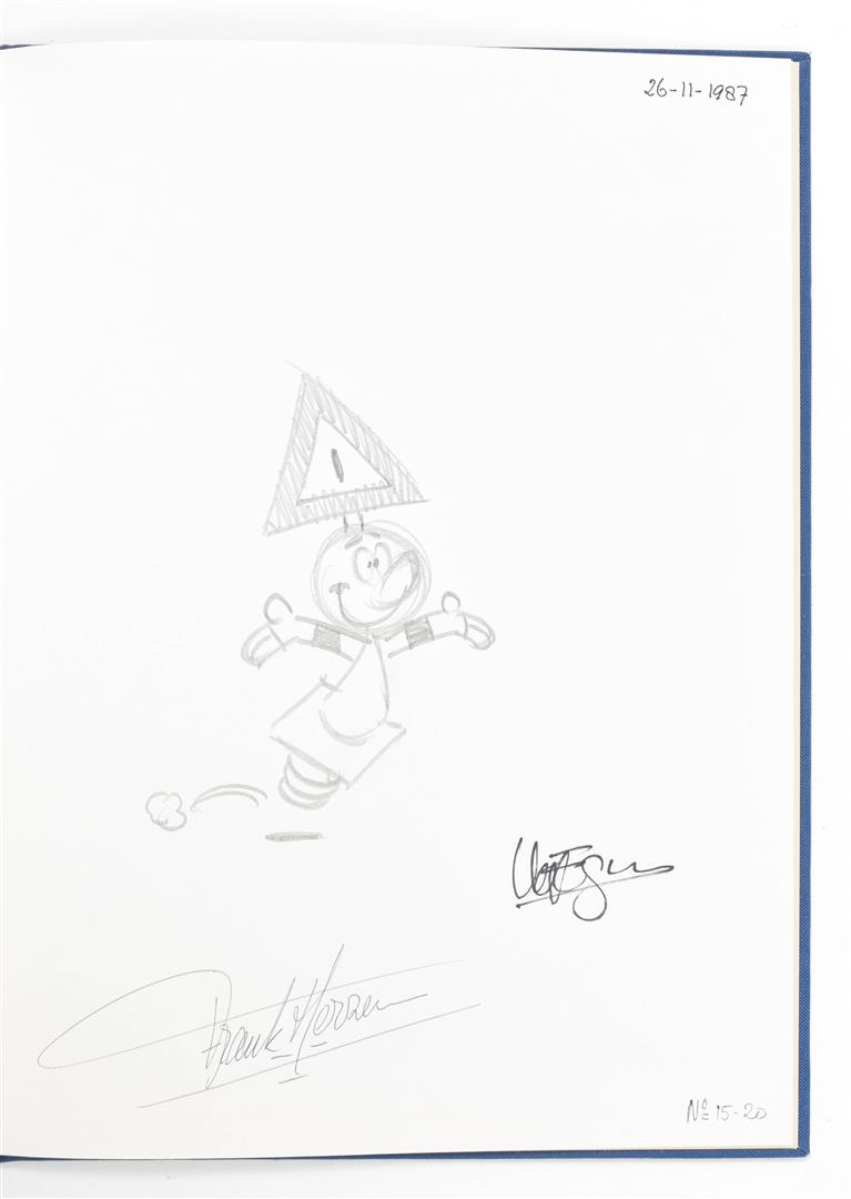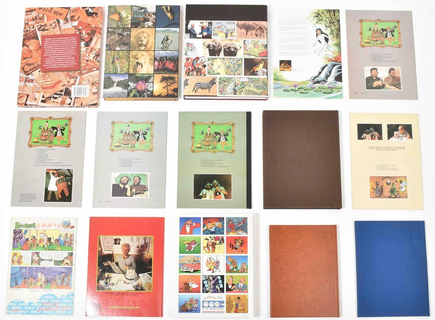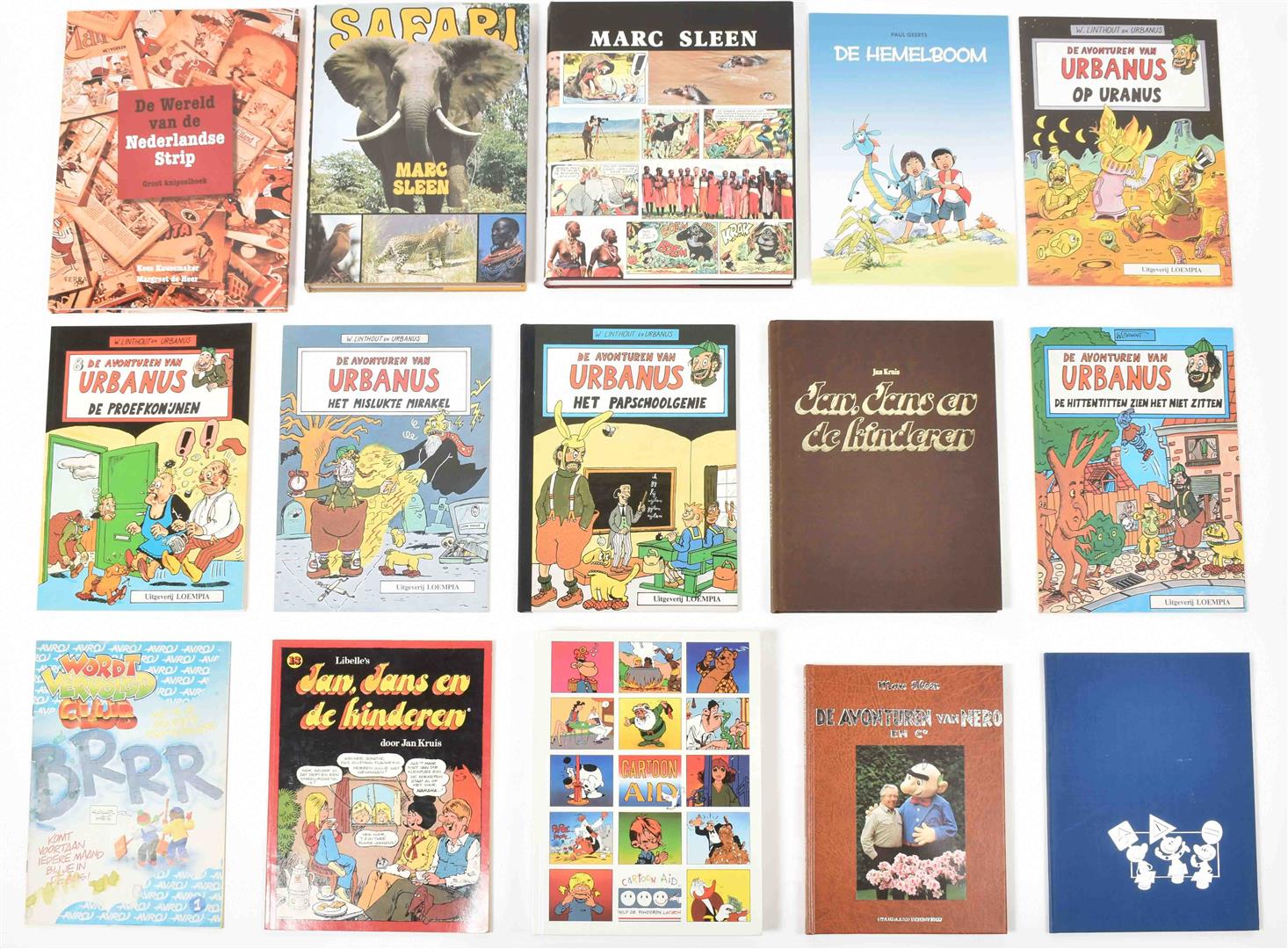 (1) De Avonturen van Urbanus. Loempia, 1983. No. 2. Sc. Dedicatory drawing signed by W. Linthout inside upper cover, one signed by Urbanus lower inside cover. -and 3 other Urbanus sc nos. from the 1980s. (2) Idem. 1984. No. 3. Cloth-backed pictorial boards. W. inlay, signed by Linthout and Urbanus upper flyleaf, numb. 67/400 in pen. (3) Sleen, M. De Avonturen van Nero en Co. Standaard, 1985. No. 4. Faux leather w. mounted plate. W. 2 inlaid themed maps to a party hosted by Mady and Marc Sleen and a signed dedication to Peekel by Sleen, dated 16 May 86 ("Aan Han Peekel, die me eindelijk in Nederland zal doen doorbreken. Zeer hartelijk"). -and 2 other works about Sleen. (3) Kruis, J. Jan, Jans en de kinderen. Joop Wiggers, 1978. Vol. 1. Gilt cl. Sm. dedicatory drawing of the rode kater upper flyleaf and signed dedication to the Peekel family by Kruis on title-p. -and a sc 1983 publ. w. a signed dedication by Kruis upper flyleaf. (4) Cartoon Aid. 1989. Hc. W. dedicatory drawing signed by Robert van der Kroft, dated 9.5.'92. (5) Geerts, P. De Hemelboom. 2006. Signed dedication by Geerts upper flyleaf. (6) Het Bordenvolkje. Standaard, 1987. No. 1. Cl. w. silver dec. Signed dedicatory drawing by Frank Herzen upper flyleaf. -and 2 others.