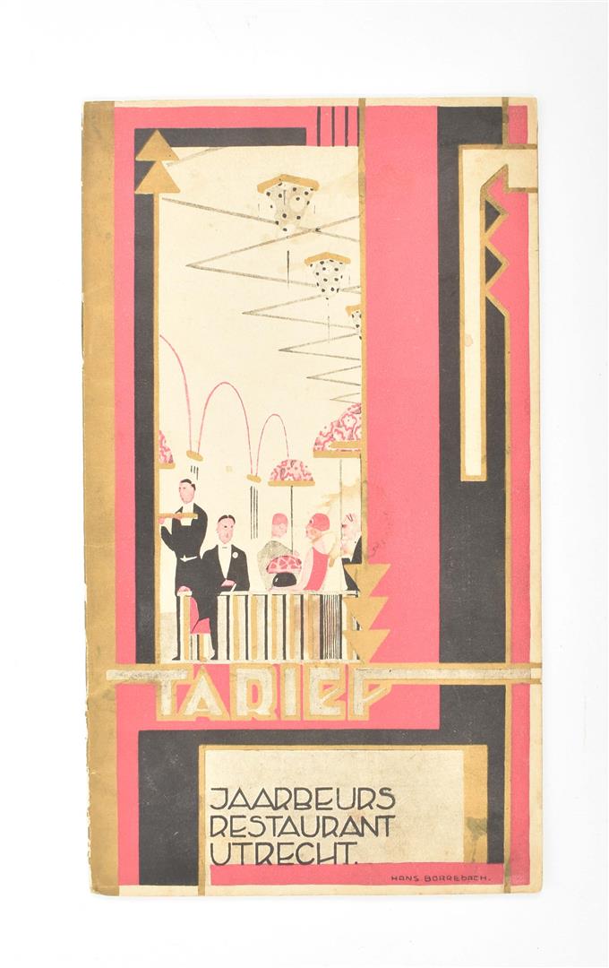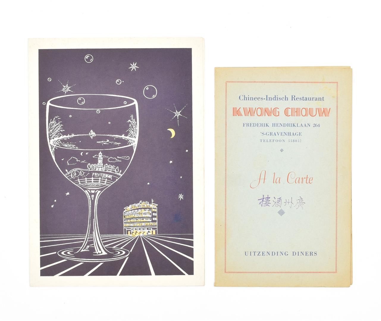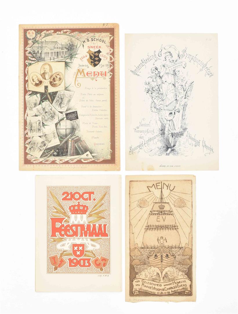 Mostly Dutch and pre-1940s, incl. shape cards and orig. designs in gouache. Comprising a.o.: (1) "Promotie-Partij van Mr. A.M. Snouck Hurgronje 12 juni 1907". Fold. card in the shape of a pike, printed in Leiden by Ed. IJdo. (2) "H.B. School te Sneek 1864-1889". Col. lithogr. card w. mounted photogr. for a dinner held on 5 Sept. 1889, printed in Utrecht by Stoomdrukkerij "De Industrie" J. van Druten. (3) "Zilveren bruiloft J.F.W. Conrad en S.A. Conrad geb. van Kerkwijk Hotel Funckler 27 october 1878". Shape card printed by Emrik & Binger in Haarlem. (4) "Menu u 10 Avril 1892". Col. lithogr. card in the shape of a painter's palette. (4) "Haarlem 26 october 1911". Calligraphic card, the words aligned in the shape of a cat. (5) "Jaarbeurs Restaurant. Nederlandsche Jaarbeurs Internationaal". Brochure w. wr. des. by Studio MW, ca. 1930.