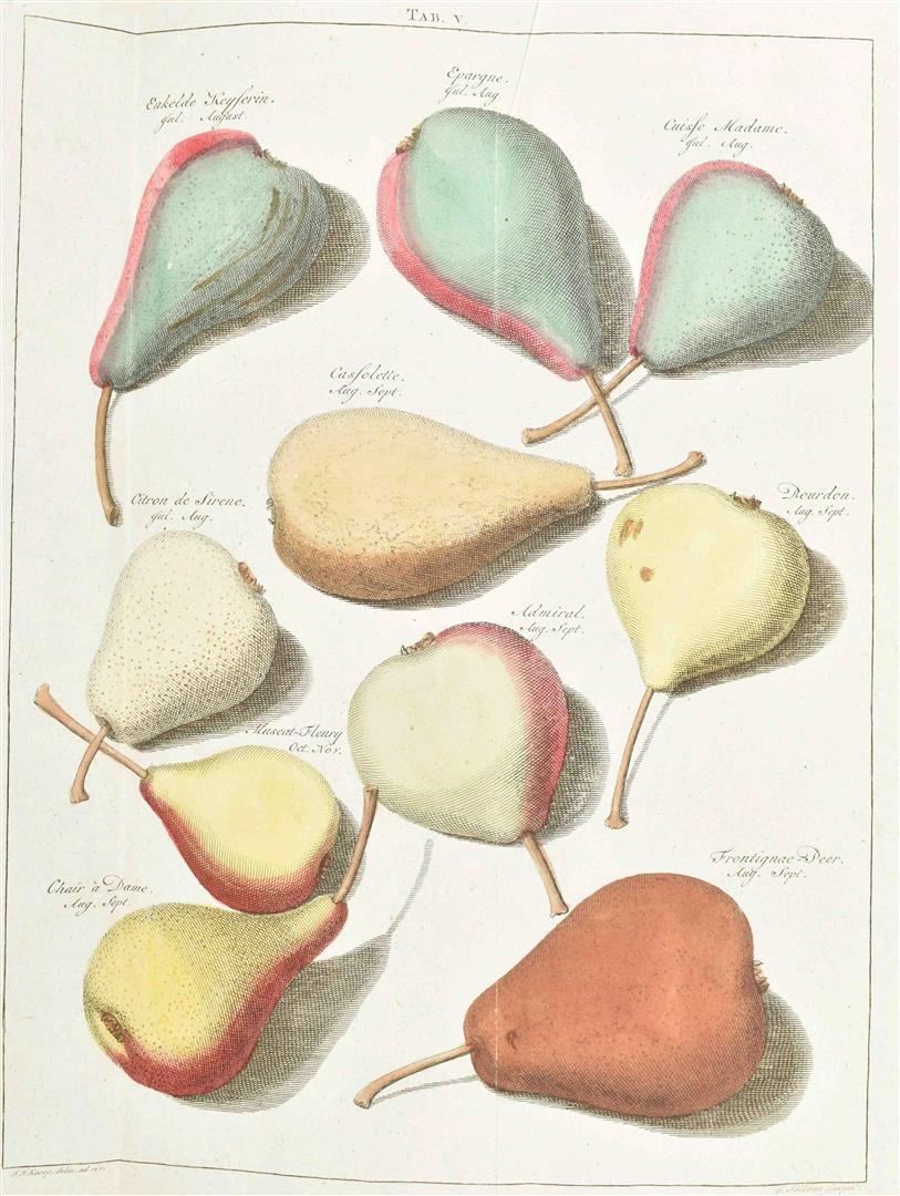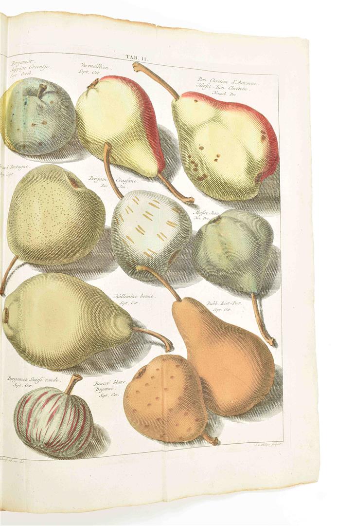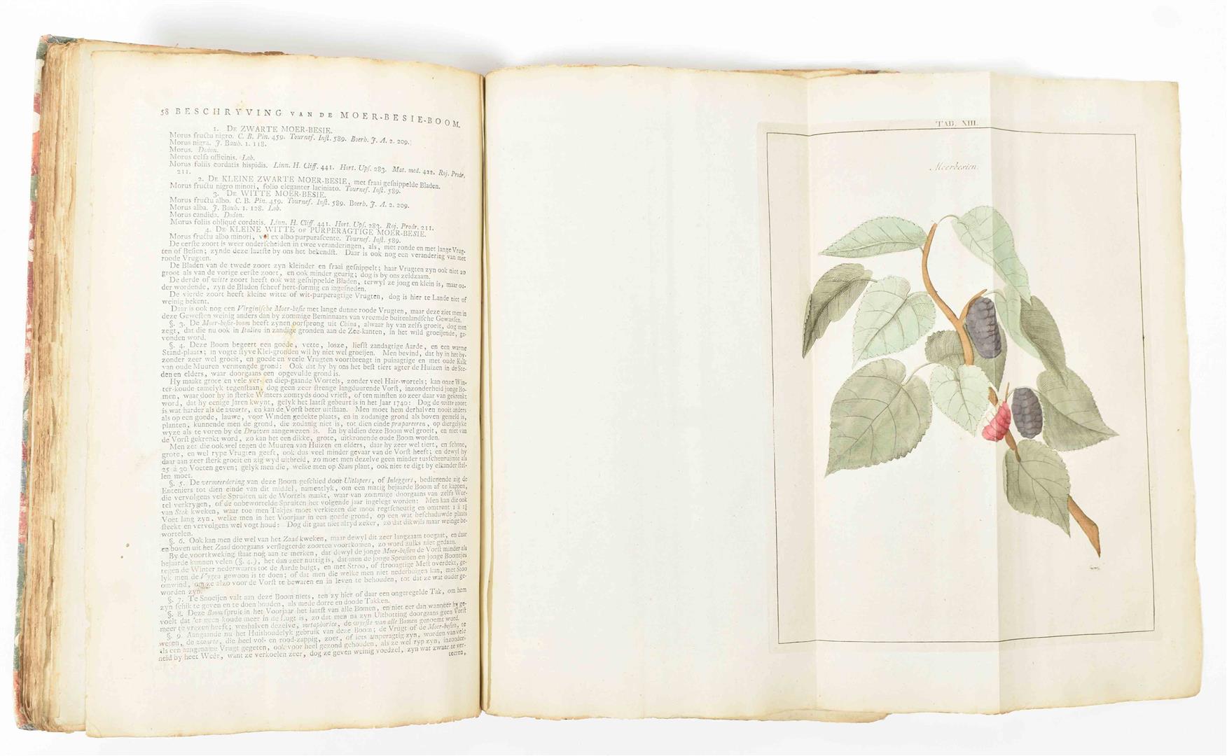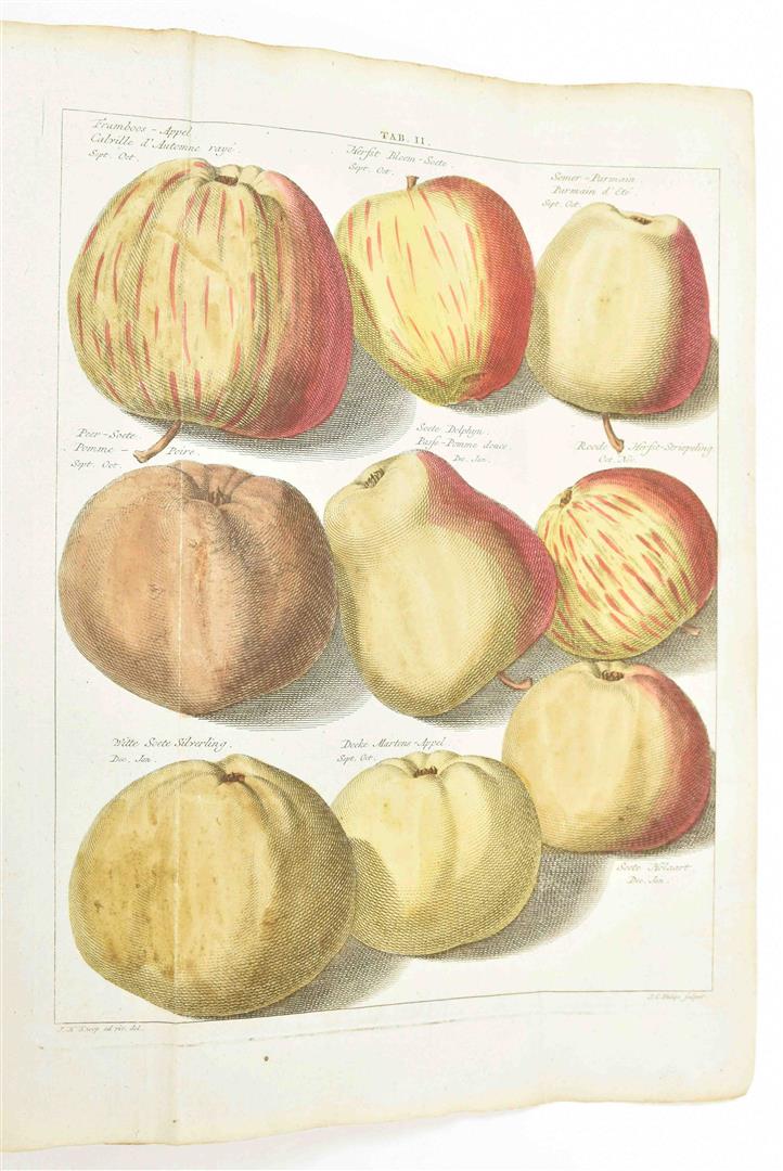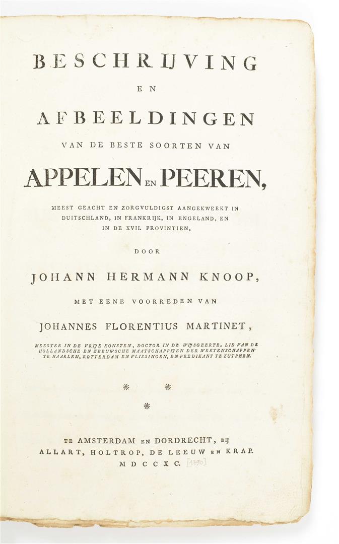 meest geacht en zorgvuldigst aangekweekt in Duitschland, in Frankrijk, in Engeland, en in de XII. Provintien. Door Johann Hermann Knoop, met eene voorreden van Johannes Florentius Martinet. Amst. & Dordrecht, Allart et al., 1790. Bound w.: Beschrijving van vruchtboomen en vruchten & Beschrijving van de plantagie-gewassen, die men in hoven aankweekt (...). 3 parts in 1 vol. VIII,36; (2),68; (2),87,(4) p. Complete w. a total of 39 handcol. engr. by J. Folkema and J.C. Philips in the 1st and 2nd parts, each part w. letterpress title-p., untrimmed. Hcalf w. marbled paper boards, ribbed spine w. mor. letterpiece.