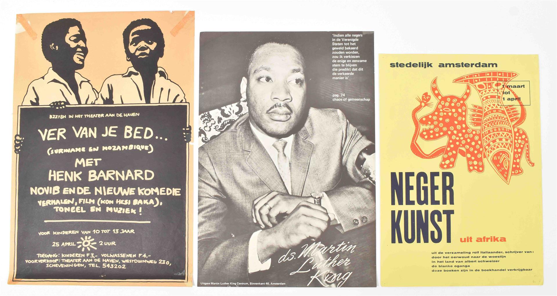 55 x 38 cm, Amst., Martin Luther King Centrum, ca. 1970. A few folds. Rare poster, quoting Martin Luther King: "Indien alle negers in de Verenigde Staten tot het geweld bekeerd zouden worden, zou ik verkiezen de enige en eenzame stem te blijven die predikt dat dit de verkeerde manier is. Pag. 74 chaos of gemeenschap." -and 3 others.