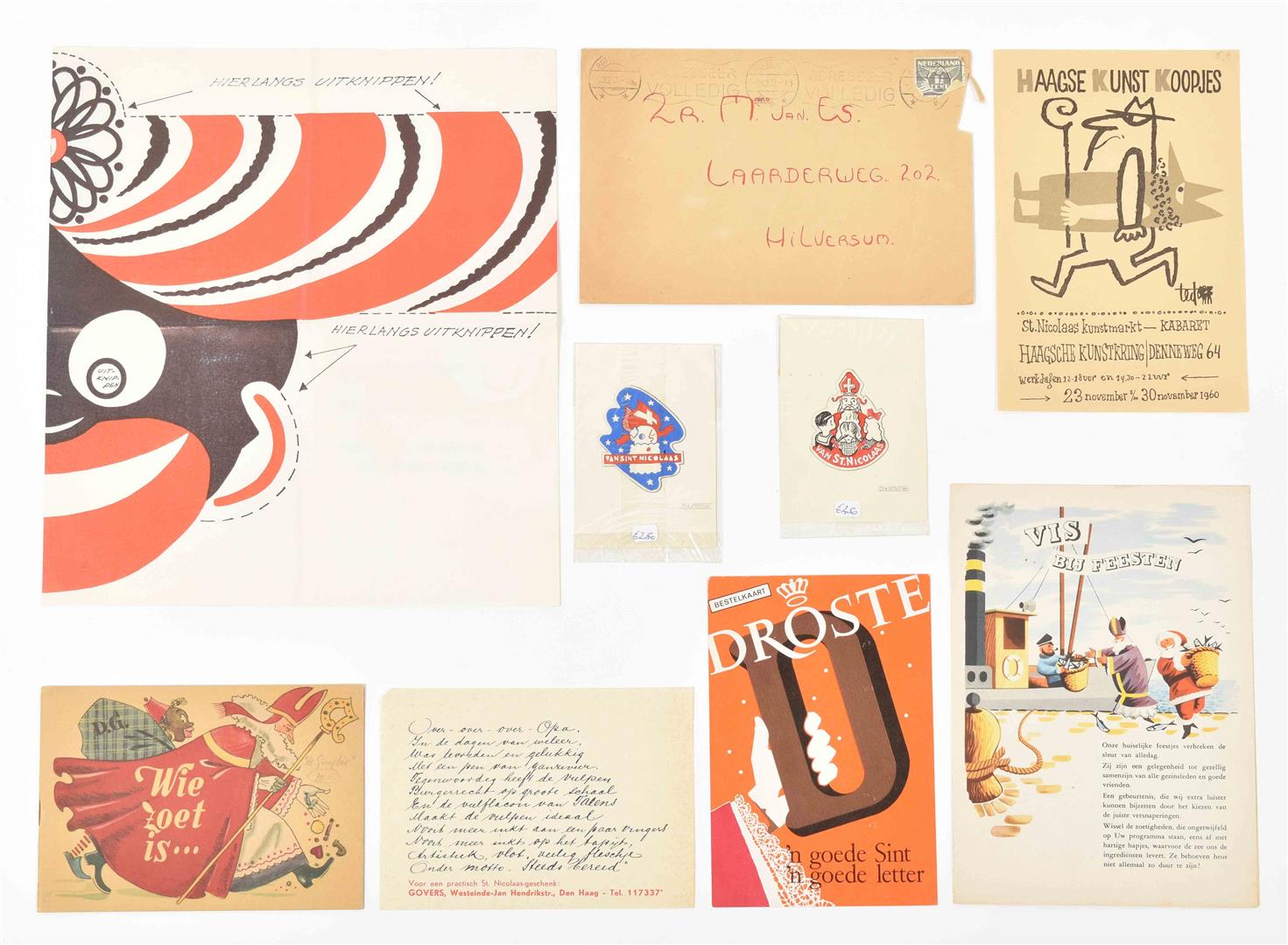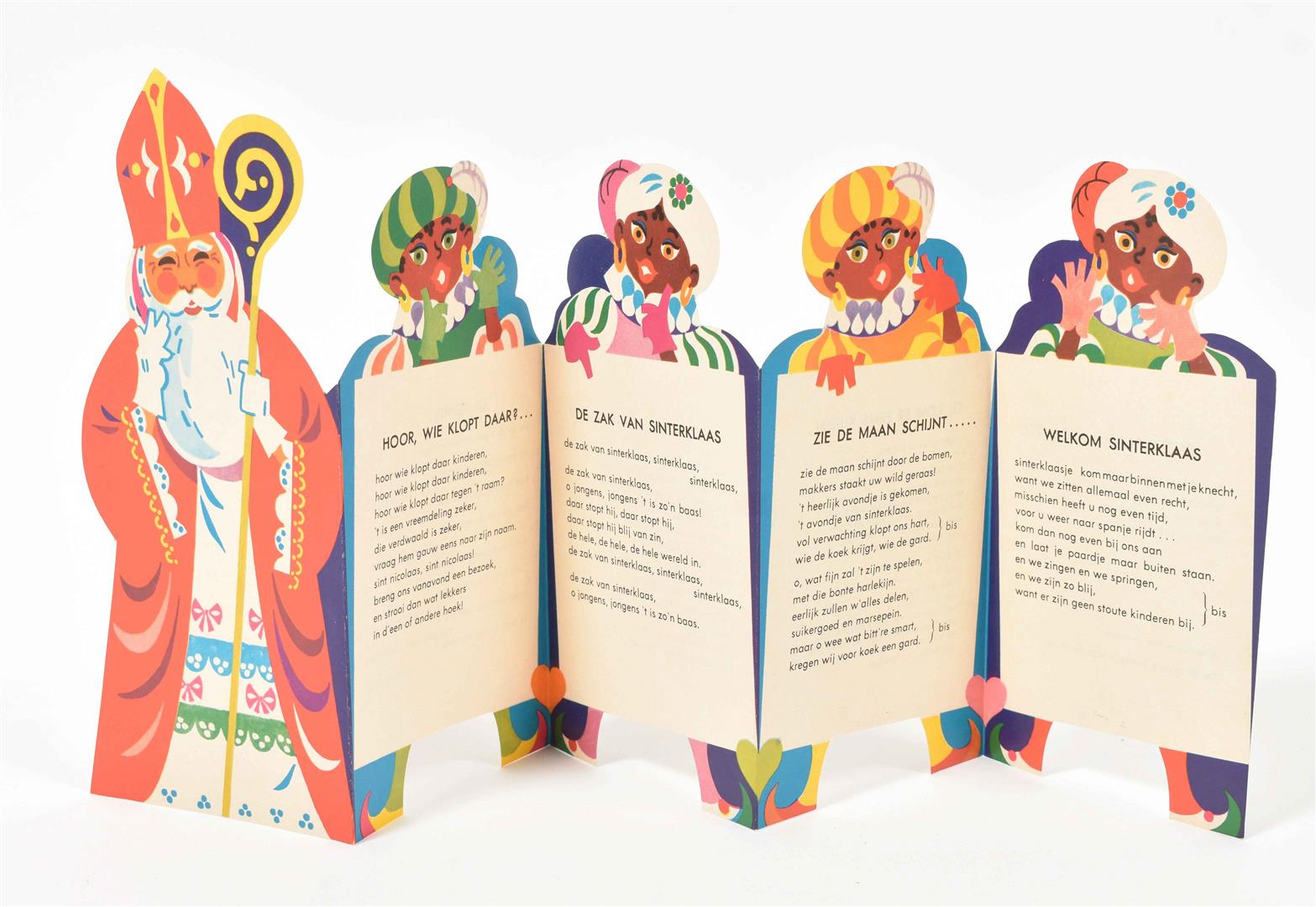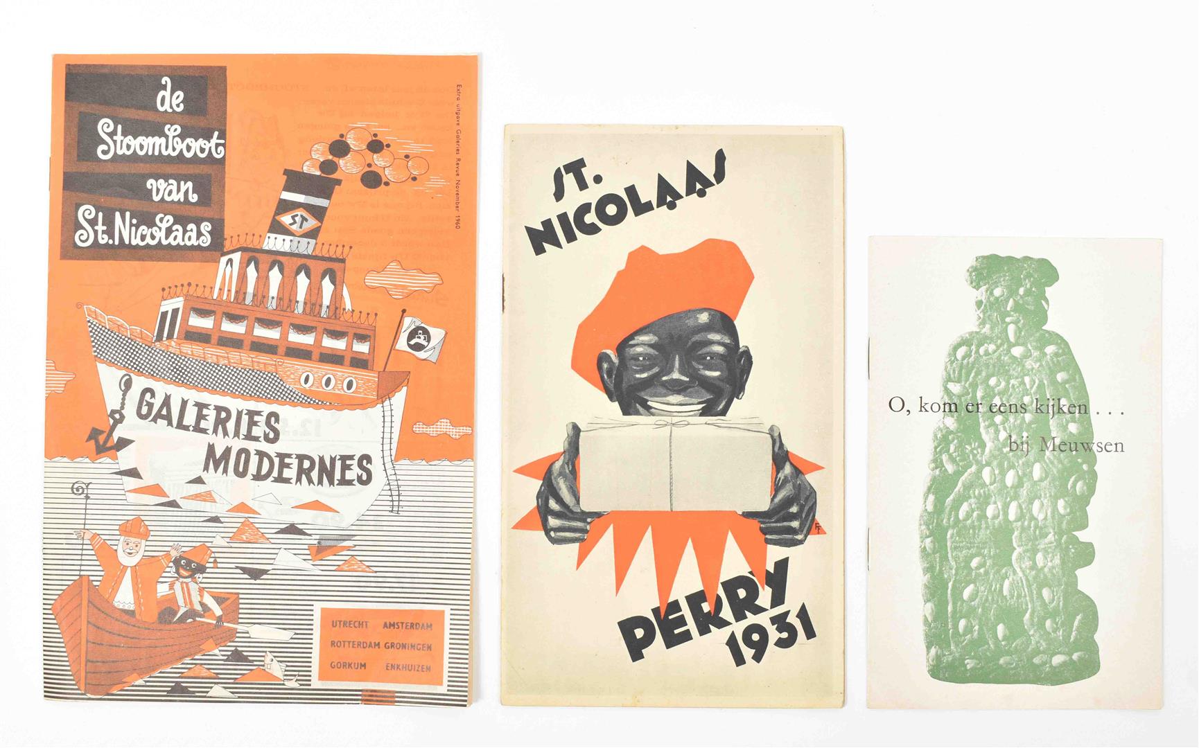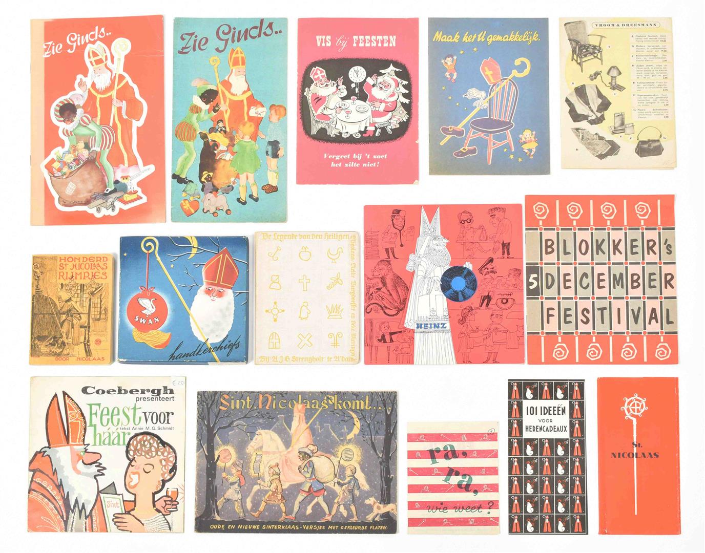 All but a few Dutch, ca. 1930-70, comprising commercial flyers, children's booklets, masks, vinyl singles, etc. A small but varied collection. (1) Burgdorffer, N. De legende van den heiligen Nicolaas. Amst., A.J.G. Strengholt, n.d. (1942), (24) p., col. ills. by O. Wieringa. (2) De Gruyter's Snoepje van de Week. Elke Week een Verassing. Unused stiff paper mask depicting Zwarte Piet, 18.5 x 22.5 cm. (3) O, kom er eens kijken... bij Meuwsen. Advertorial booklet, (8) p. (incl. wr.), w. 6 photogr. ills., stapled. Using a black model posing as Zwarte Piet in 2 ills. (4) SWAN handkerchiefs. Square cardboard box, 15 x 15 cm, w. 3 fold. linen handkerchiefs in var. col. (5) Blokker's 5 december festival. Advertorial booklet, issued November 1961, (24) p. (incl. wr.), richly ill., orig. stapled wr., sm. 4to. -and approx. 25 others, incl. 2 shaped issues of De Gruyter's Snoepje van de Week (1x movable), R. Campert, Fabels voor Dokters (booklet w. loosely inserted flexible vinyl record, issued by Heinz, ca. 1965), St. Nicolaas (booklet issued by Nieuw-Engeland "de zaak aan 't Koningsplein te Amsterdam", 25 Nov. 1936), Maak het u gemakkelijk (booklet issued by Peerless, 1960), De stoomboot van St. Nicolaas (booklet issued by Galeries Modernes, "extra uitgave Galerie Revue November 1960"), 5 December Geschenken (booklet issued by Vroom & Dreesmann, Dec. 1950) and St. Nicolaas. Perry 1931 (booklet).
