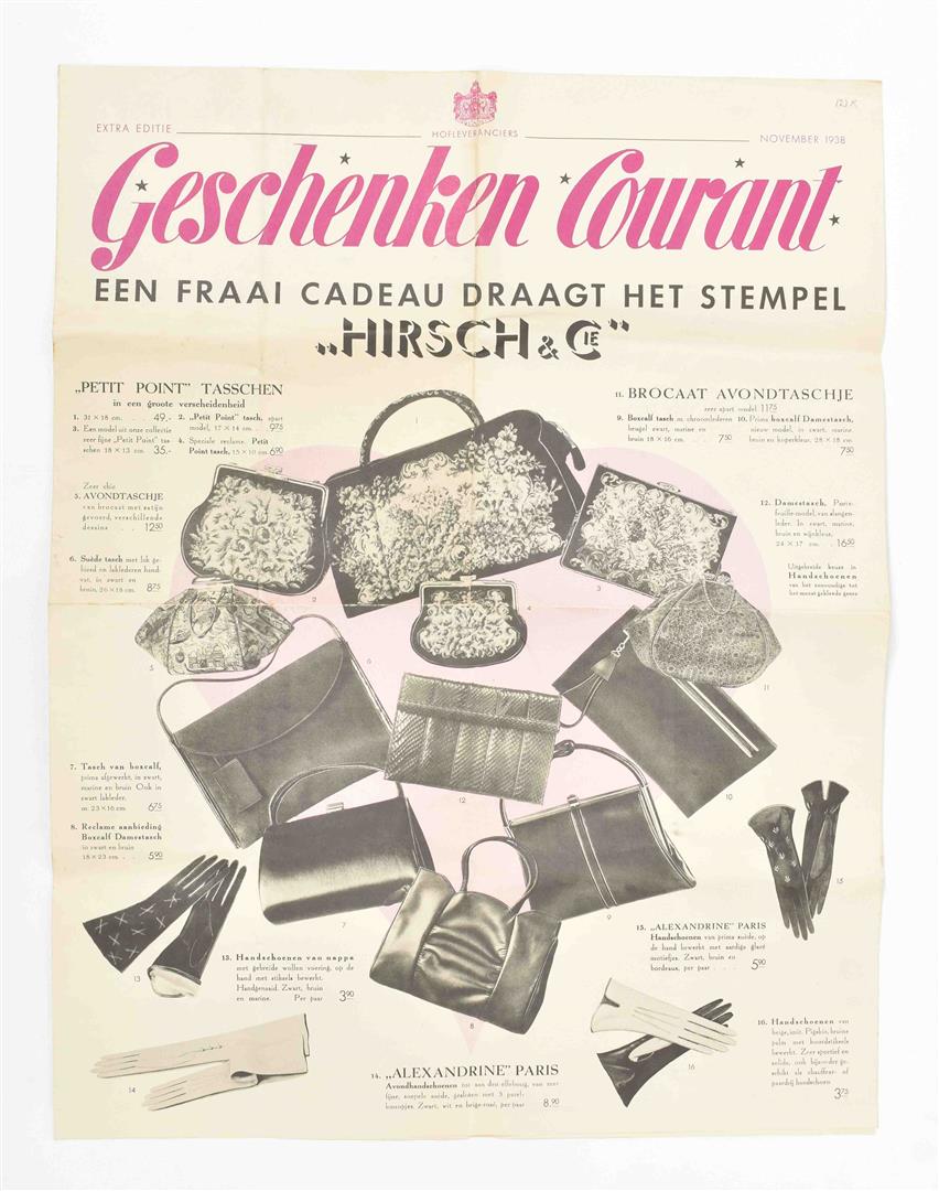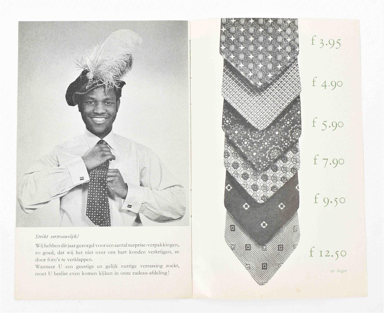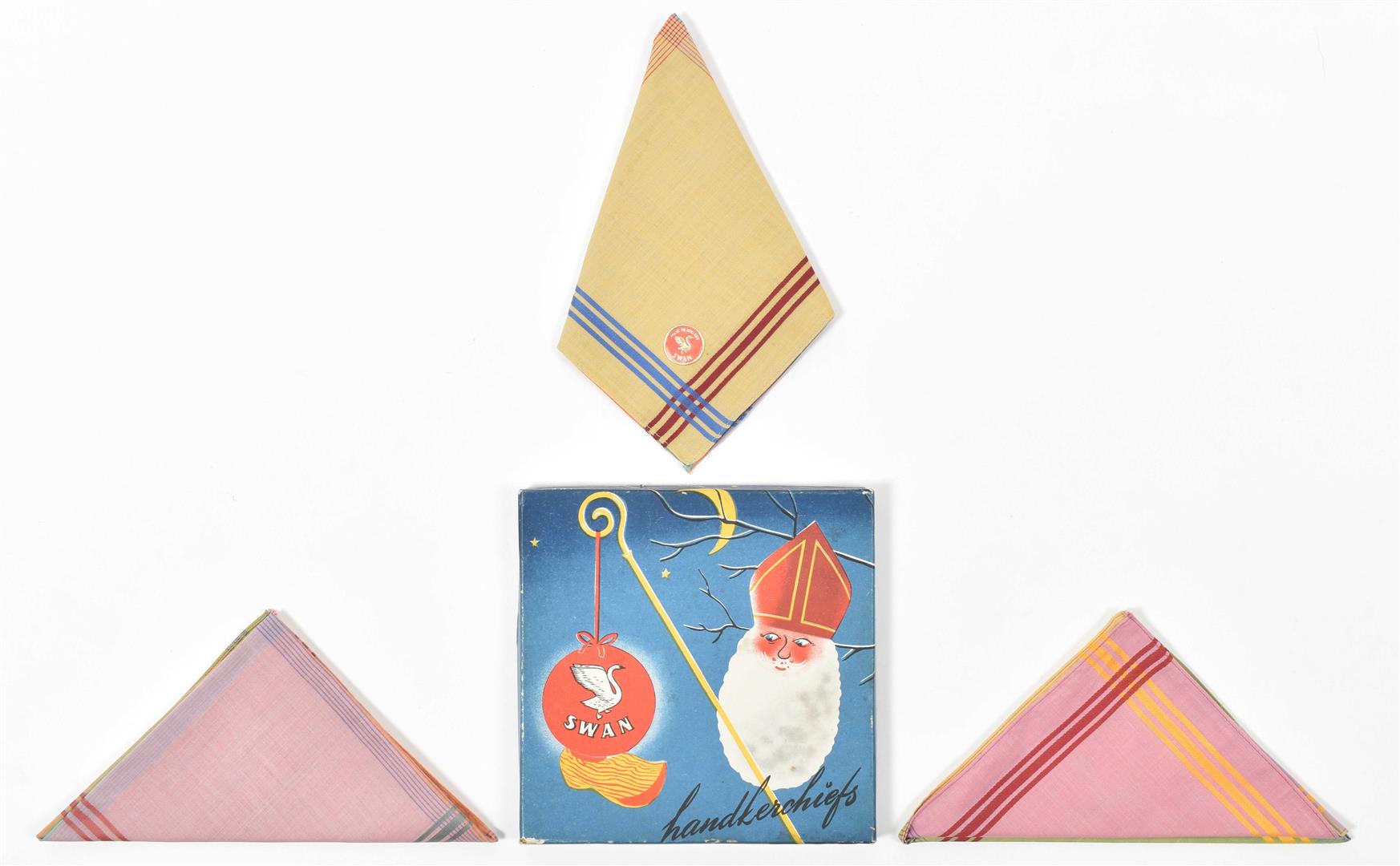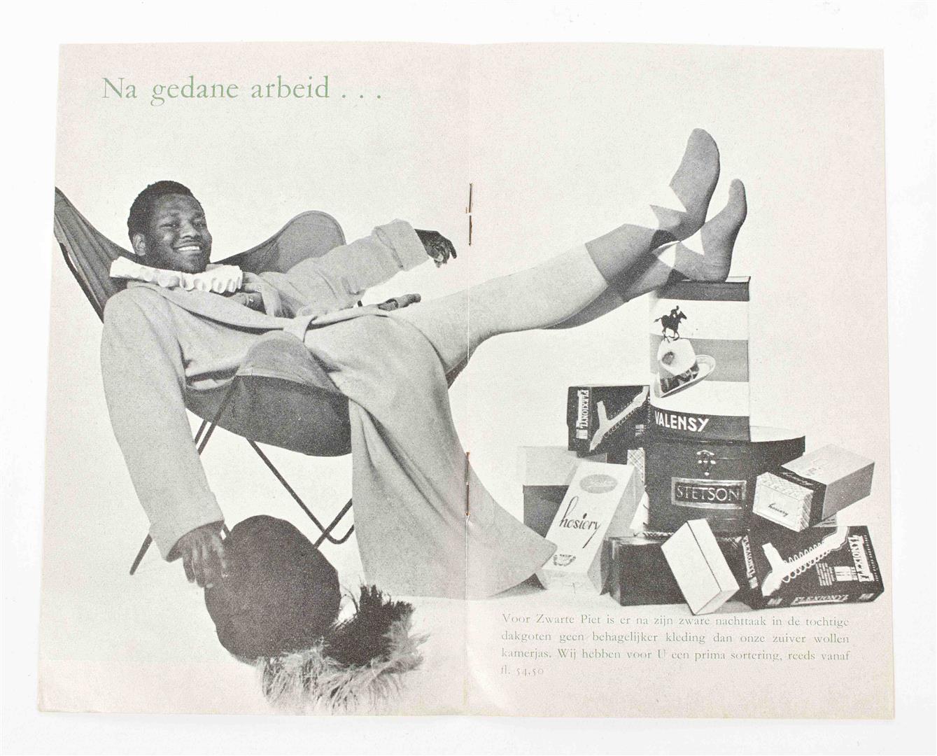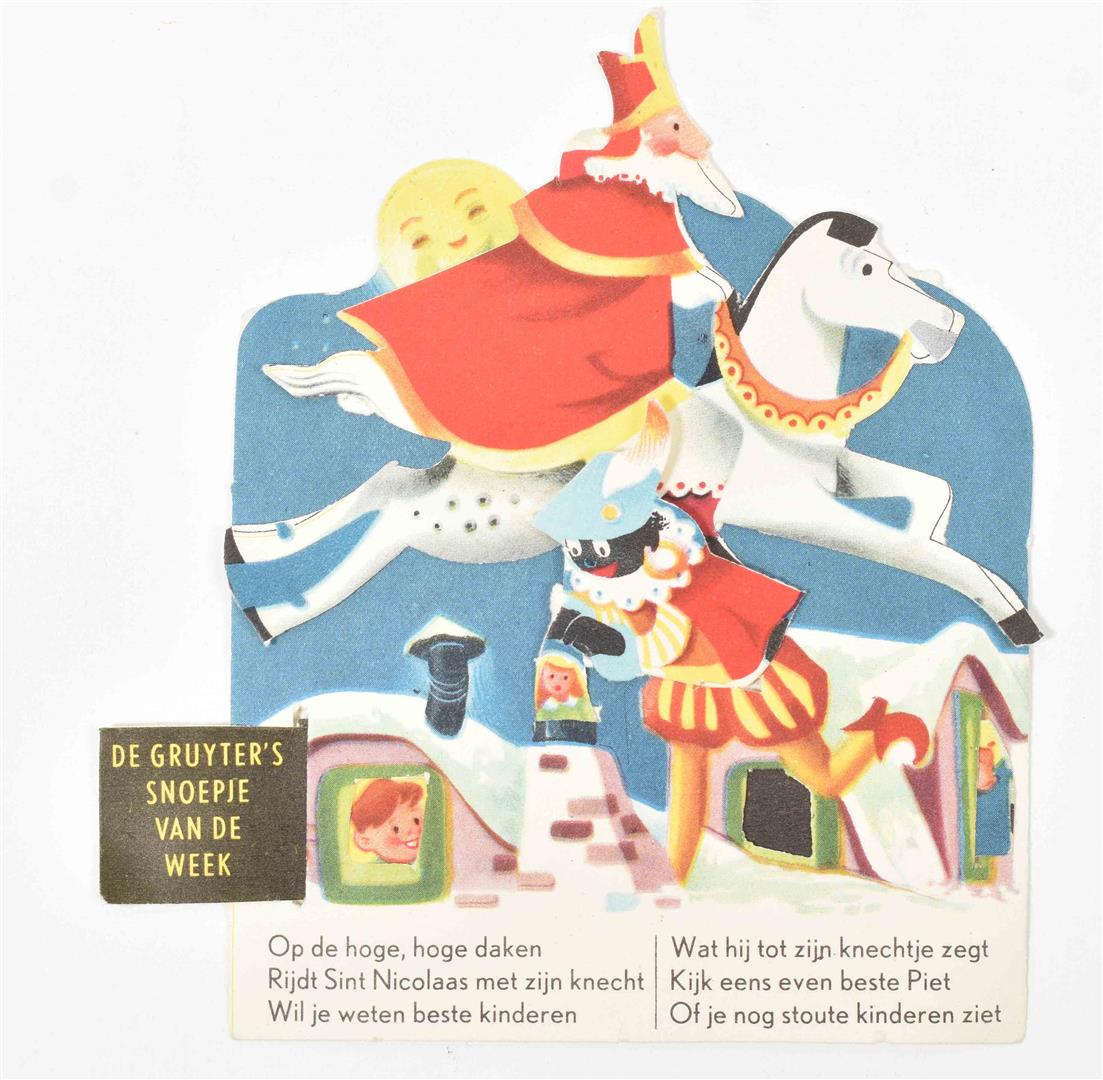 All but a few Dutch, ca. 1930-70, comprising commercial flyers, children's booklets, masks, vinyl singles, etc. A small but varied collection. (1) Burgdorffer, N. De legende van den heiligen Nicolaas. Amst., A.J.G. Strengholt, n.d. (1942), (24) p., col. ills. by O. Wieringa. (2) De Gruyter's Snoepje van de Week. Elke Week een Verassing. Unused stiff paper mask depicting Zwarte Piet, 18.5 x 22.5 cm. (3) O, kom er eens kijken... bij Meuwsen. Advertorial booklet, (8) p. (incl. wr.), w. 6 photogr. ills., stapled. Using a black model posing as Zwarte Piet in 2 ills. (4) SWAN handkerchiefs. Square cardboard box, 15 x 15 cm, w. 3 fold. linen handkerchiefs in var. col. (5) Blokker's 5 december festival. Advertorial booklet, issued November 1961, (24) p. (incl. wr.), richly ill., orig. stapled wr., sm. 4to. -and approx. 25 others, incl. 2 shaped issues of De Gruyter's Snoepje van de Week (1x movable), R. Campert, Fabels voor Dokters (booklet w. loosely inserted flexible vinyl record, issued by Heinz, ca. 1965), St. Nicolaas (booklet issued by Nieuw-Engeland "de zaak aan 't Koningsplein te Amsterdam", 25 Nov. 1936), Maak het u gemakkelijk (booklet issued by Peerless, 1960), De stoomboot van St. Nicolaas (booklet issued by Galeries Modernes, "extra uitgave Galerie Revue November 1960"), 5 December Geschenken (booklet issued by Vroom & Dreesmann, Dec. 1950) and St. Nicolaas. Perry 1931 (booklet).
