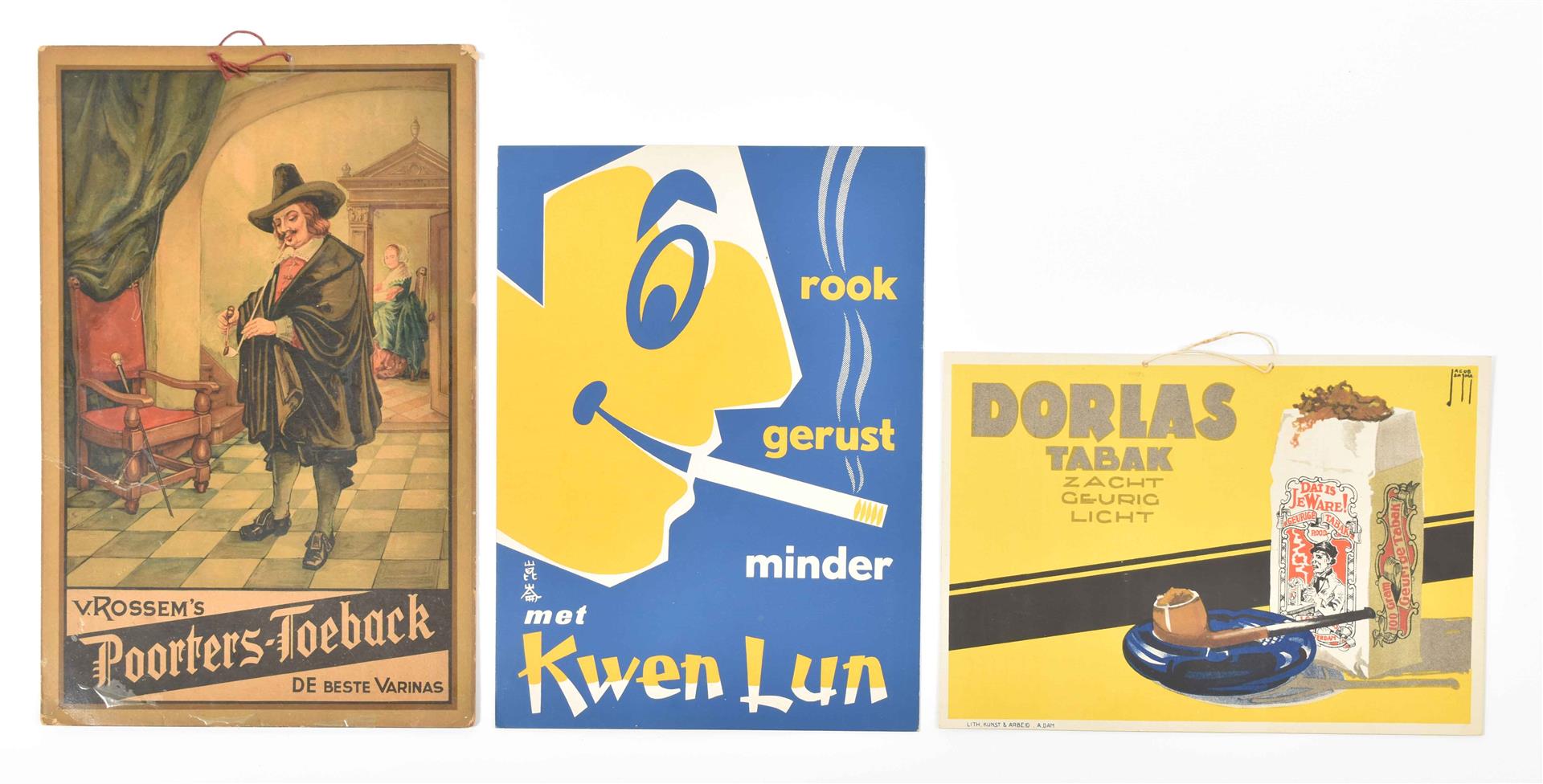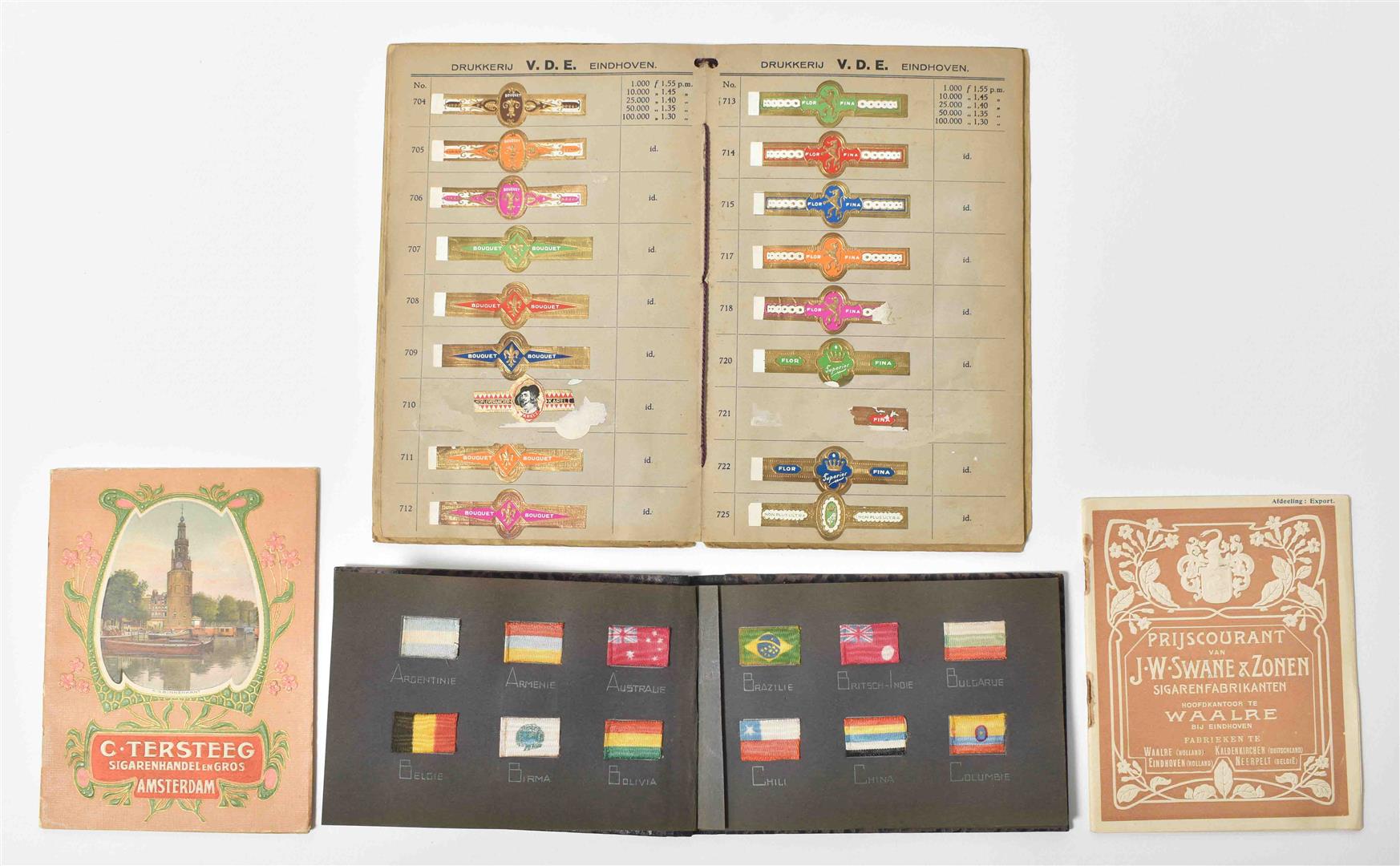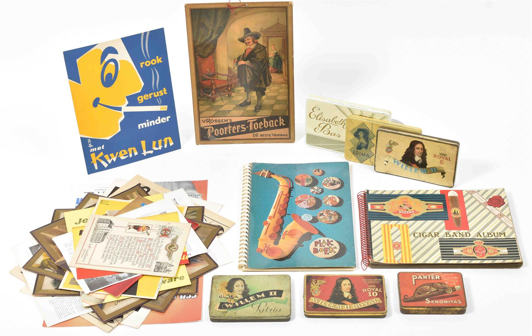 Var. countries, ca. 1900-80. Incl. a.o.: (1) Prijscourant van C. Tersteeg. Sigarenhandel en gros. Amsterdam. Binnenkant 7. 1907-1908. Amst., J. Vas Dias & Co, (1907), 36 p., many ills. of cigars, orig. stapled embossed col. lithogr. wr. One leaf loose, otherwise fine. (2) Prijscourant van J.W. Swane & Zonen sigarenfabrikanten. Hoofdkantoor te Waalre. N.pl., n.d. (ca. 1905), 32 p., num. ills. of cigars, factories etc., orig. embossed tinted lithogr. wr. Stapled removed, rust stains. W. stamp of representative on inside front wr. (3) Trade catalogue of P.C.C. Hajenius, Amst./ The Hague, ca. 1930, 36 p., num. ills., w. loosely inserted "Prijscourant". (4) Turmac. Olympiade herinnering. Booklet commemorating the 9th Olympiade (Amst. 1928), w. 73 (of 74) mounted miniature cl. flags of the countries and Turmac and the Olympic flag, orig. gilt-lettered cloth-backed boards, sm. 8vo. (5) V. Rossem's Poorters-Toeback. De beste Varinas. Col. lithogr. cardboard display, 35 x 22.5 cm, w. hanging thread. Sm. defects. (6) Rook gerust minder met Kwen Lun. Offset cardboard display printed in blue and yellow, 30 x 22 cm, w. fold stand at the back. (7) Steen- en Offsetdrukkerij Chr. Schäfer Jr., Aalst bij Eindhoven. Etiketten, randen, ringen, show cards, cartonnages. Fold. cardboard portfolio w. mounted samples, ca. 1950, total 25.5 x 46 cm. (8) 28 Juni - 31 Juli Internationale tentoonstelling stad Tilburg 1934. Fold. flyer, total 24 x 41.5 cm, des. by J. Jansma (w. his vague printed signature, also a cardboard display by him in the collection). (9) Drukkerij V.D.E. Eindhoven. Ringencollectie met prijsnoteering. Ingaande 15 November 1926. (24) p., w. num. mounted specimens of cigar bands, orig. cord-bound wr. Sm. defects. Extremely rare trade catalogue. (10) Large collection of cigar bands, some mounted in albums, several hundred loose. (11) Seven tin tobacco boxes.