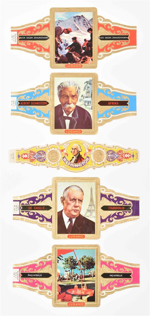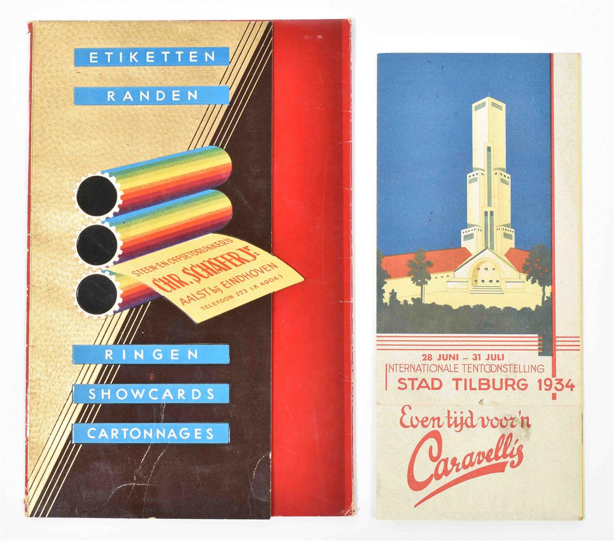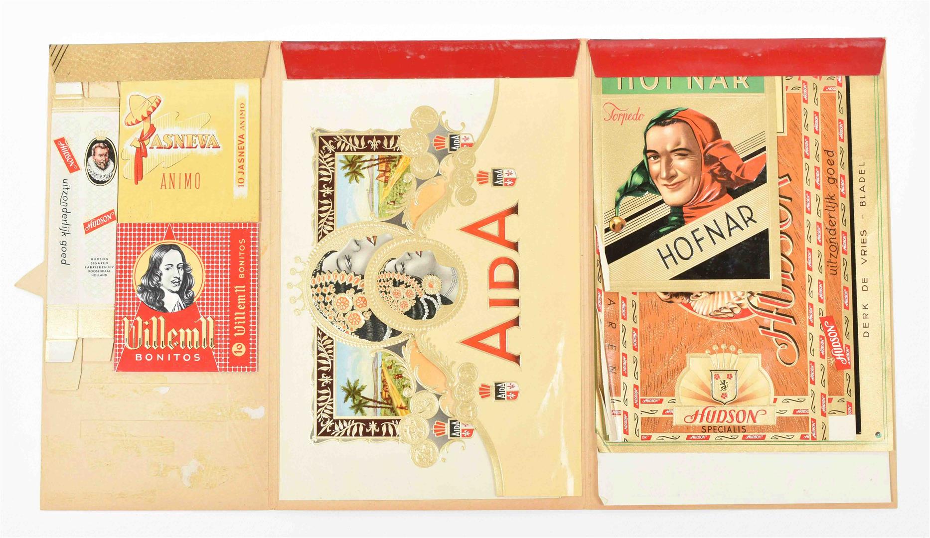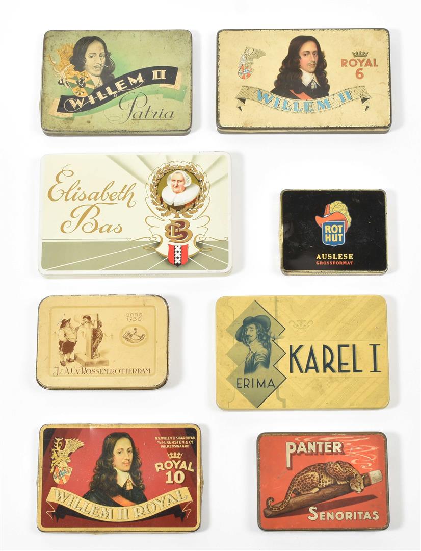 Var. countries, ca. 1900-80. Incl. a.o.: (1) Prijscourant van C. Tersteeg. Sigarenhandel en gros. Amsterdam. Binnenkant 7. 1907-1908. Amst., J. Vas Dias & Co, (1907), 36 p., many ills. of cigars, orig. stapled embossed col. lithogr. wr. One leaf loose, otherwise fine. (2) Prijscourant van J.W. Swane & Zonen sigarenfabrikanten. Hoofdkantoor te Waalre. N.pl., n.d. (ca. 1905), 32 p., num. ills. of cigars, factories etc., orig. embossed tinted lithogr. wr. Stapled removed, rust stains. W. stamp of representative on inside front wr. (3) Trade catalogue of P.C.C. Hajenius, Amst./ The Hague, ca. 1930, 36 p., num. ills., w. loosely inserted "Prijscourant". (4) Turmac. Olympiade herinnering. Booklet commemorating the 9th Olympiade (Amst. 1928), w. 73 (of 74) mounted miniature cl. flags of the countries and Turmac and the Olympic flag, orig. gilt-lettered cloth-backed boards, sm. 8vo. (5) V. Rossem's Poorters-Toeback. De beste Varinas. Col. lithogr. cardboard display, 35 x 22.5 cm, w. hanging thread. Sm. defects. (6) Rook gerust minder met Kwen Lun. Offset cardboard display printed in blue and yellow, 30 x 22 cm, w. fold stand at the back. (7) Steen- en Offsetdrukkerij Chr. Schäfer Jr., Aalst bij Eindhoven. Etiketten, randen, ringen, show cards, cartonnages. Fold. cardboard portfolio w. mounted samples, ca. 1950, total 25.5 x 46 cm. (8) 28 Juni - 31 Juli Internationale tentoonstelling stad Tilburg 1934. Fold. flyer, total 24 x 41.5 cm, des. by J. Jansma (w. his vague printed signature, also a cardboard display by him in the collection). (9) Drukkerij V.D.E. Eindhoven. Ringencollectie met prijsnoteering. Ingaande 15 November 1926. (24) p., w. num. mounted specimens of cigar bands, orig. cord-bound wr. Sm. defects. Extremely rare trade catalogue. (10) Large collection of cigar bands, some mounted in albums, several hundred loose. (11) Seven tin tobacco boxes.