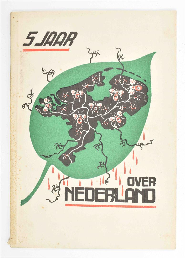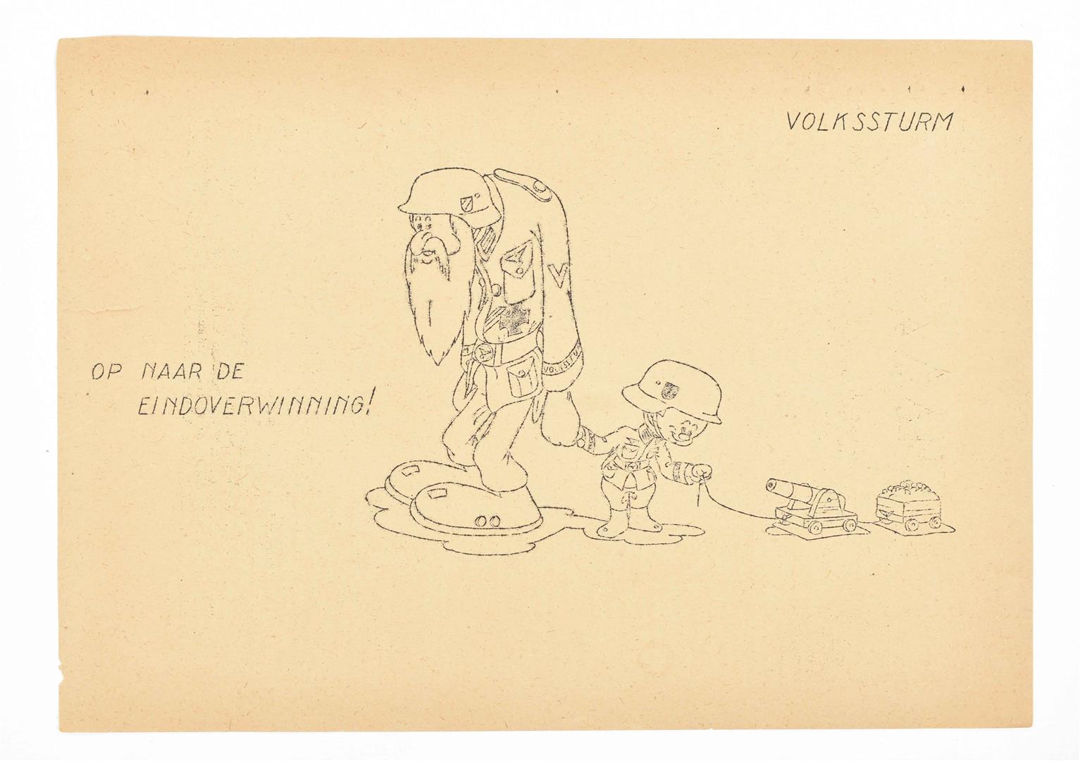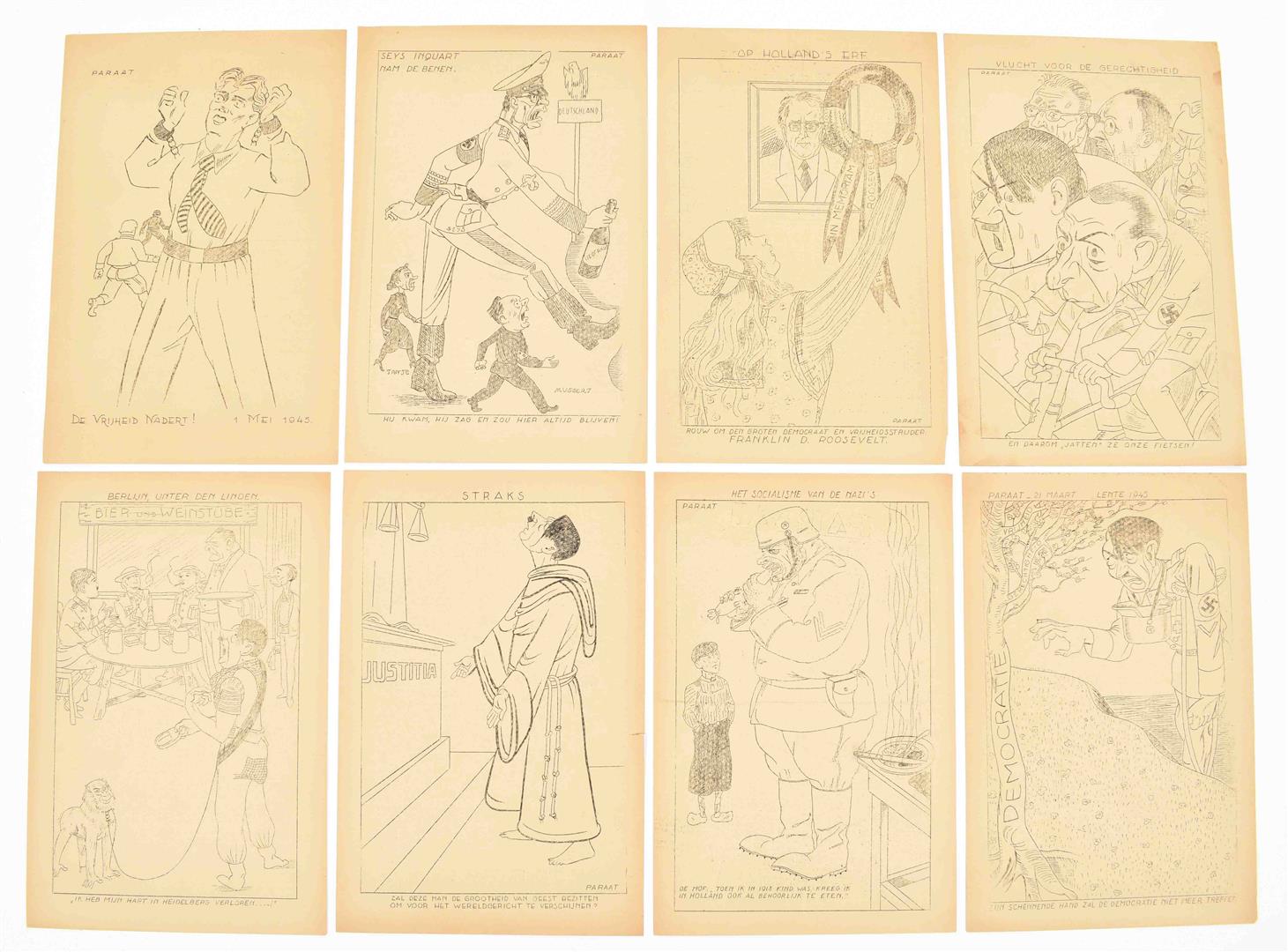 October 1944 - Mai 4-5 1945. Mostly single lvs. w. stencilled/ letterpress text on 1 side and full-p. ill. by Rot on the other side, var. sizes. Comprises: Year 1944, Tweede Octobernummer and Tweede Novembernummer. Year 1945, No. 33, issue for 27 Febr. (unnumb.), no. 51, 64, 69, 74, 80, 89, 91, 96, 103, Eerste Meinummer and 107 (= bevrijdigings-editie). Occas. sm. defects due to the poor quality of the paper (brittle). Rare. Added: Vijf jaar hakenkruis over Nederland. Amst., Drukkerij Dico for "Paraat", (1945), no pagination, 49 plates and orig. wr. after Rot.