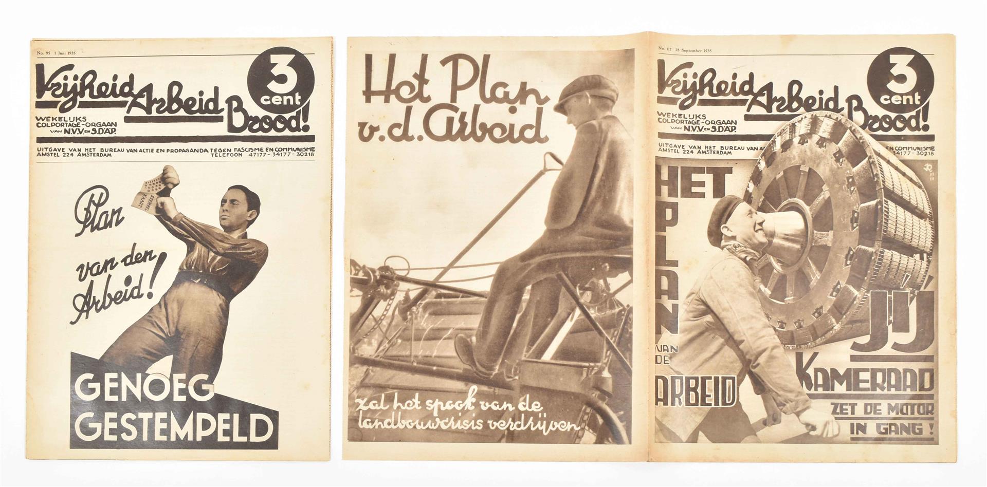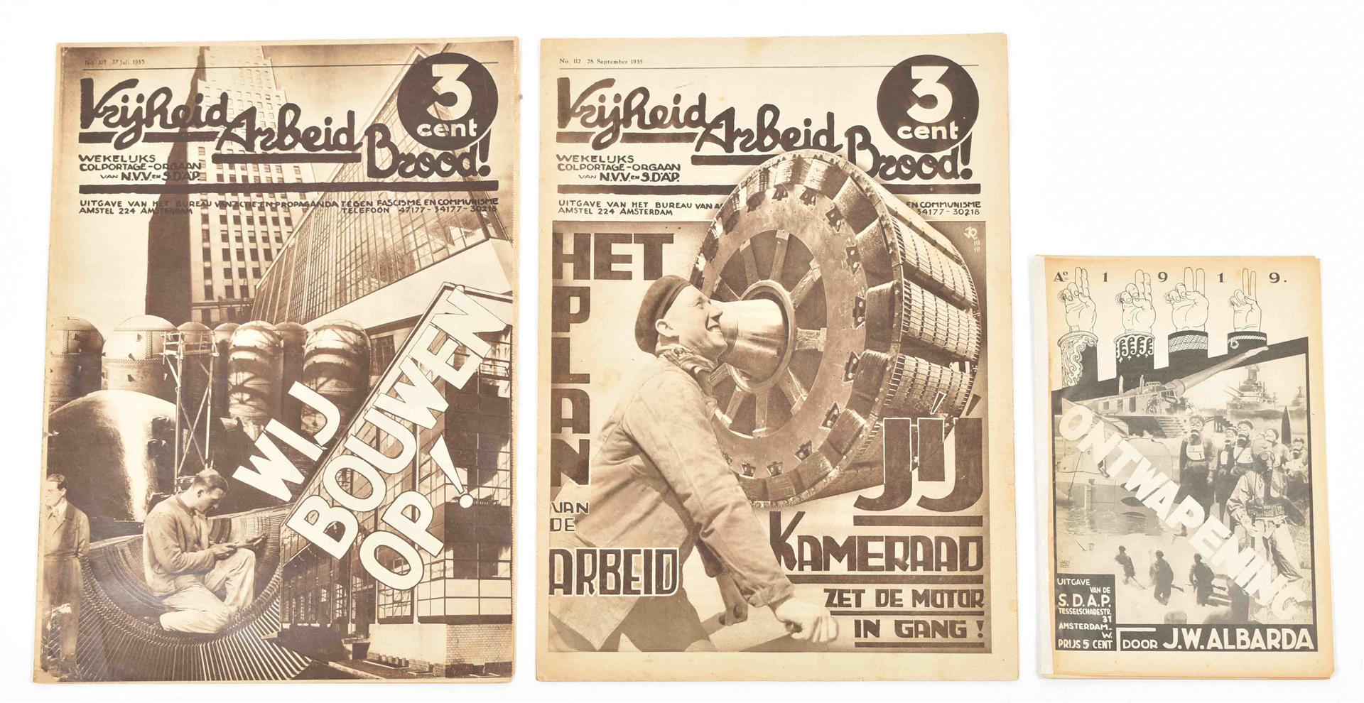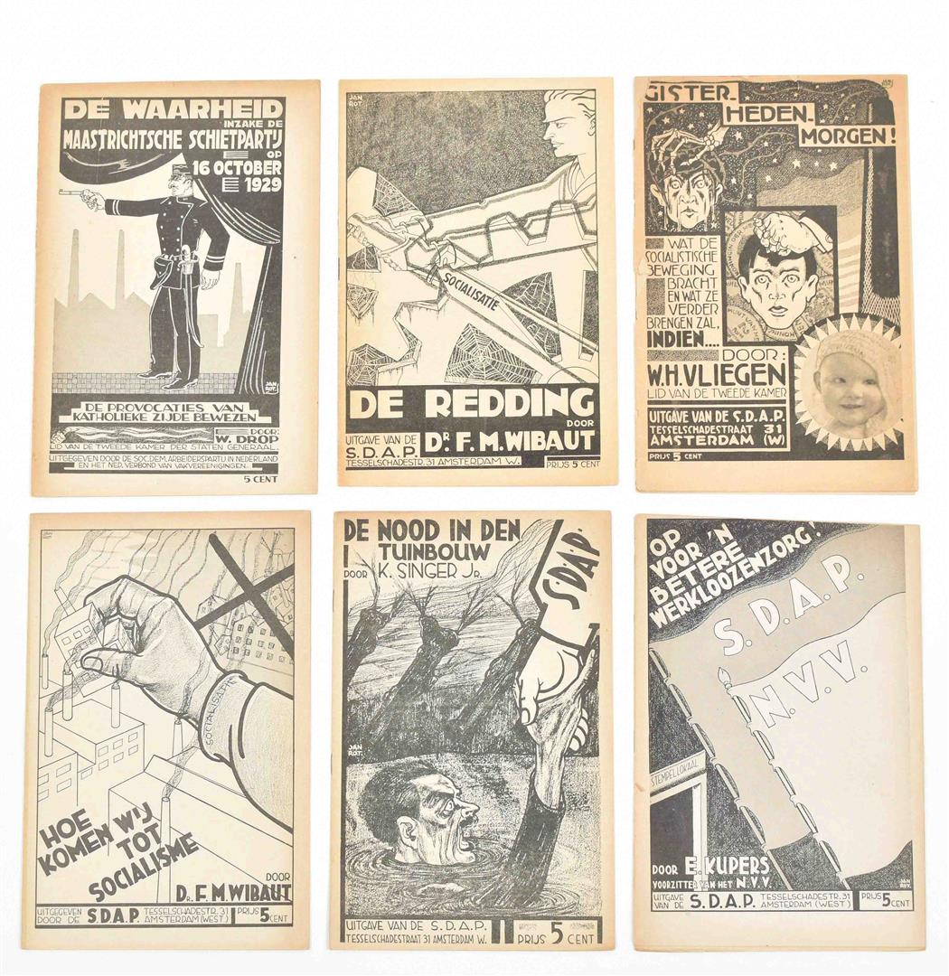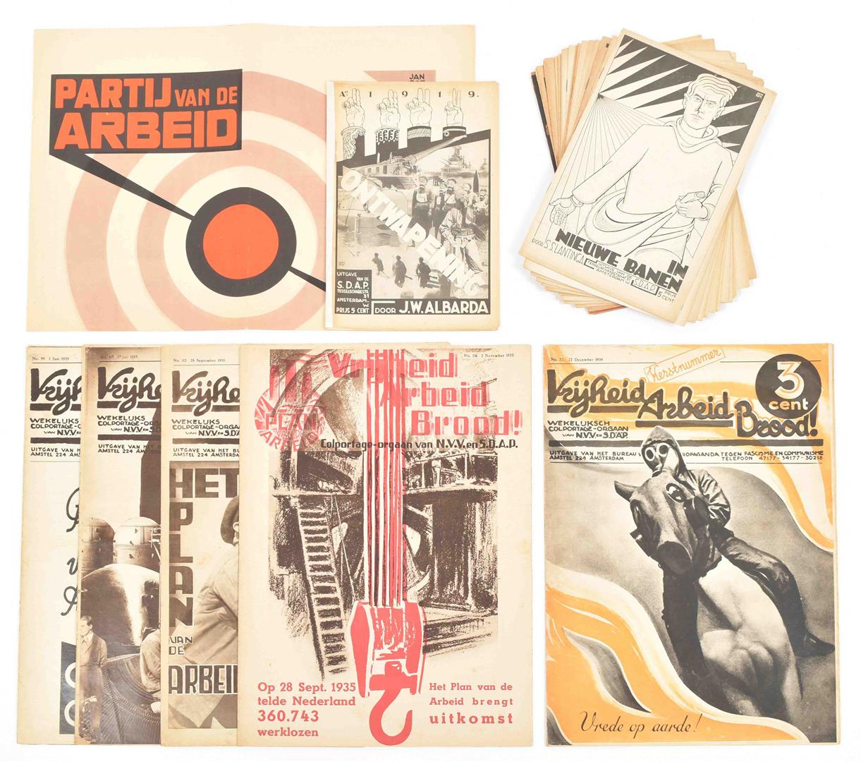 Amst., printed by N.V. De Arbeiderspers for the S.D.A.P., mostly undated (ca. 1930-35), all 16 p. (incl. stapled wr.), front wr. w. ills. by Rot. One issue wr. loose and sl. dam., occas. smaller defects. Incl. the issue by J.W. Albarda, Ontwapening, w. striking photomontage front wr. by Rot. -and 8 others w. ills. by Rot, incl. 5 issues of Vrijheid Arbeid Brood (1934-35) and an early Partij van de Arbeid election-poster for A. de Roos, Lijst 4 (w. pencil-annotation "17 Mei 1946").