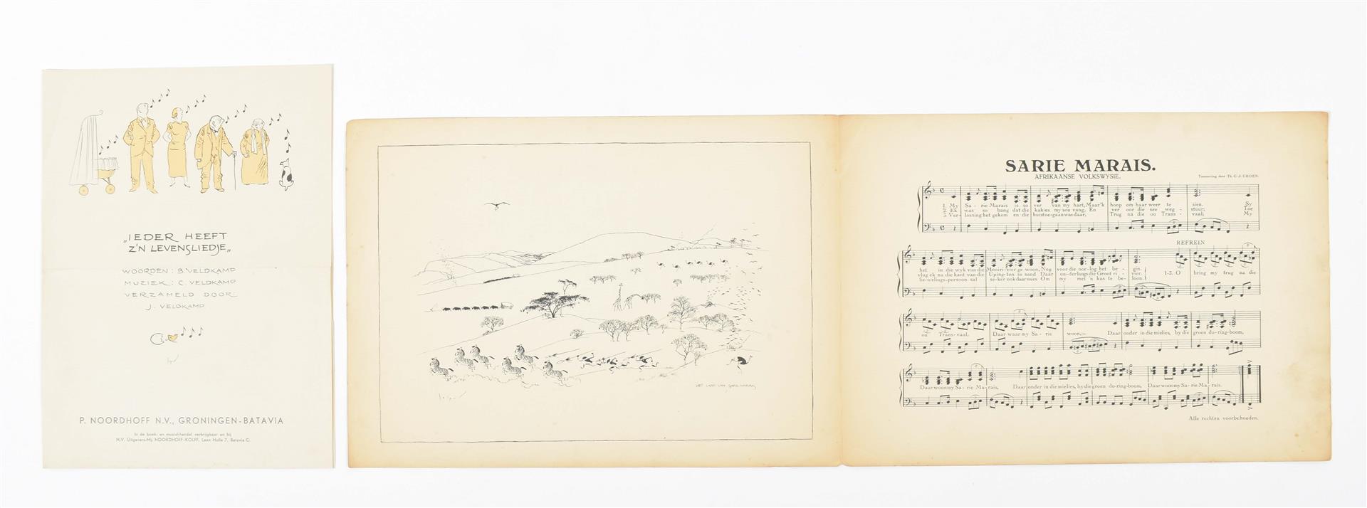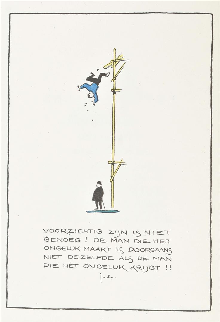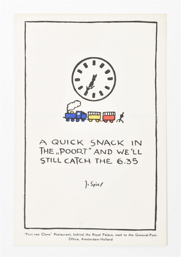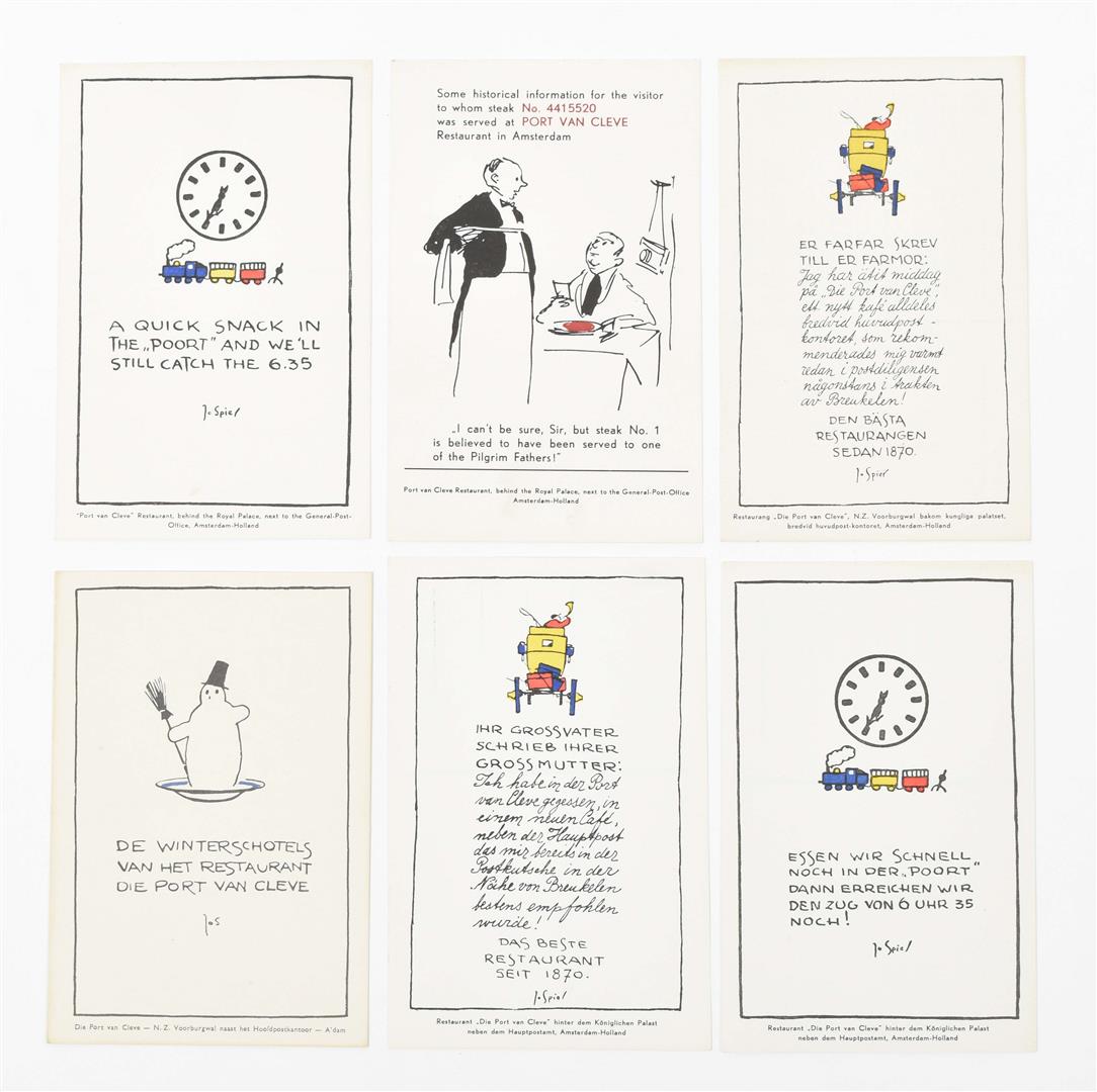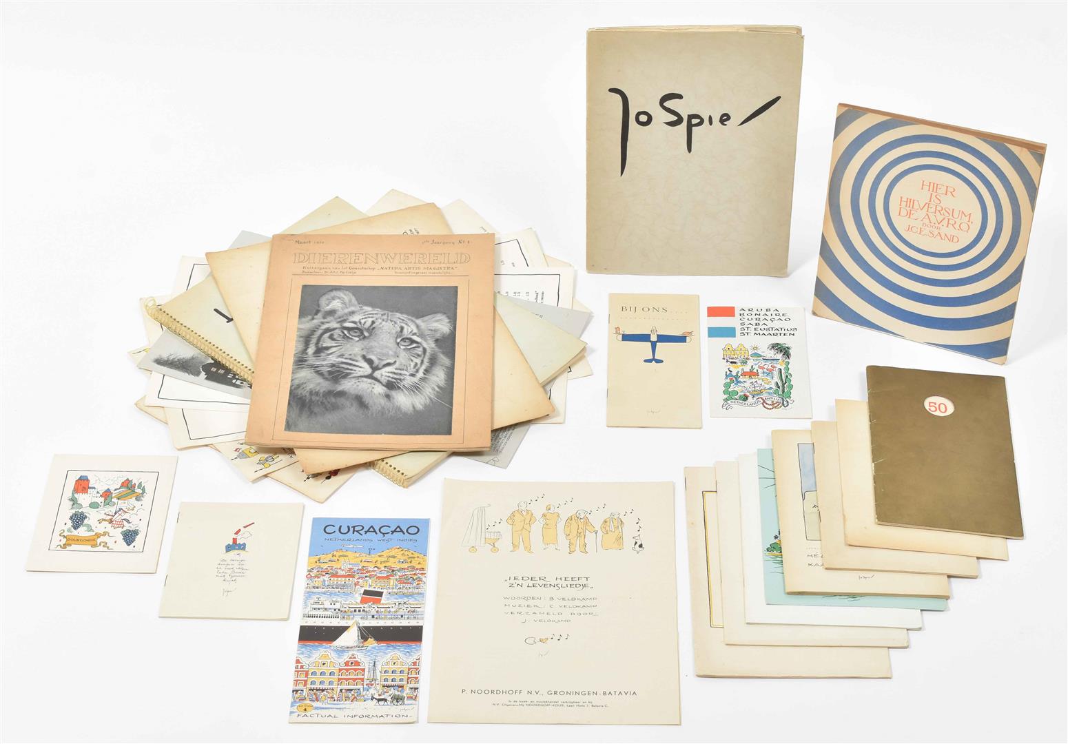 Incl. booklets, cards, flyers, sheet music, etc., mostly of a commercial nature. Comprising a.o.: (1-12) Restaurant "Die Port van Cleve", Amsterdam. 4 menu cards, 6 postcards and 2 other cards advertising the restaurant, all w. ills. by Spier. (2) Jo Spier. Het tweede leven. Amst. etc., De Bijenkorf, 1958, (16) p., text and ills. by Spier, orig. stapled wr., obl. 8vo. (3) Leuk voor later. Een sportalbum van Elseviers Weekblad. Ed. H.J. Looman. Den Bosch, Zuid-Nederlandsche Drukkerij, n.d. (ca. 1953), no pagination, ills. by W. van Wieringen, orig. spiral-bound wr. by Spier, folio. Unused, but lacking envelopes on inside wr. (4) Jo Spier teekeningen. Amst., Kunsthandel J. Goudstikker, (1933), 16 p., ills., orig. wr., 4to. Ex libris of Lodewijk Blok on title-p. (5) Dit is voorlopig aleen maar... Pietje. Miniature booklet, Amst., 1949, 12 p. (incl. wr.), 10 ills. by Spier, orig. stapled wr., 8 x 7 cm. Publ. on occasion and for the benefit of the exhibition "Jeugd van Nederland", RAI Amsterdam, 1949. (6) 50 Jaar Concertgebouw Amsterdam 1888-1938. Amst., Van Munster, (1938), 16 p., ills. by Spier, orig. stapled wr. (7) Dat oog heeft alles gezien. Herinneringen aan het concentratiekamp Theresienstadt. Amst./ Brussels, Elsevier, 1978, 120 p., text, ills. and orig. wr. by Spier.