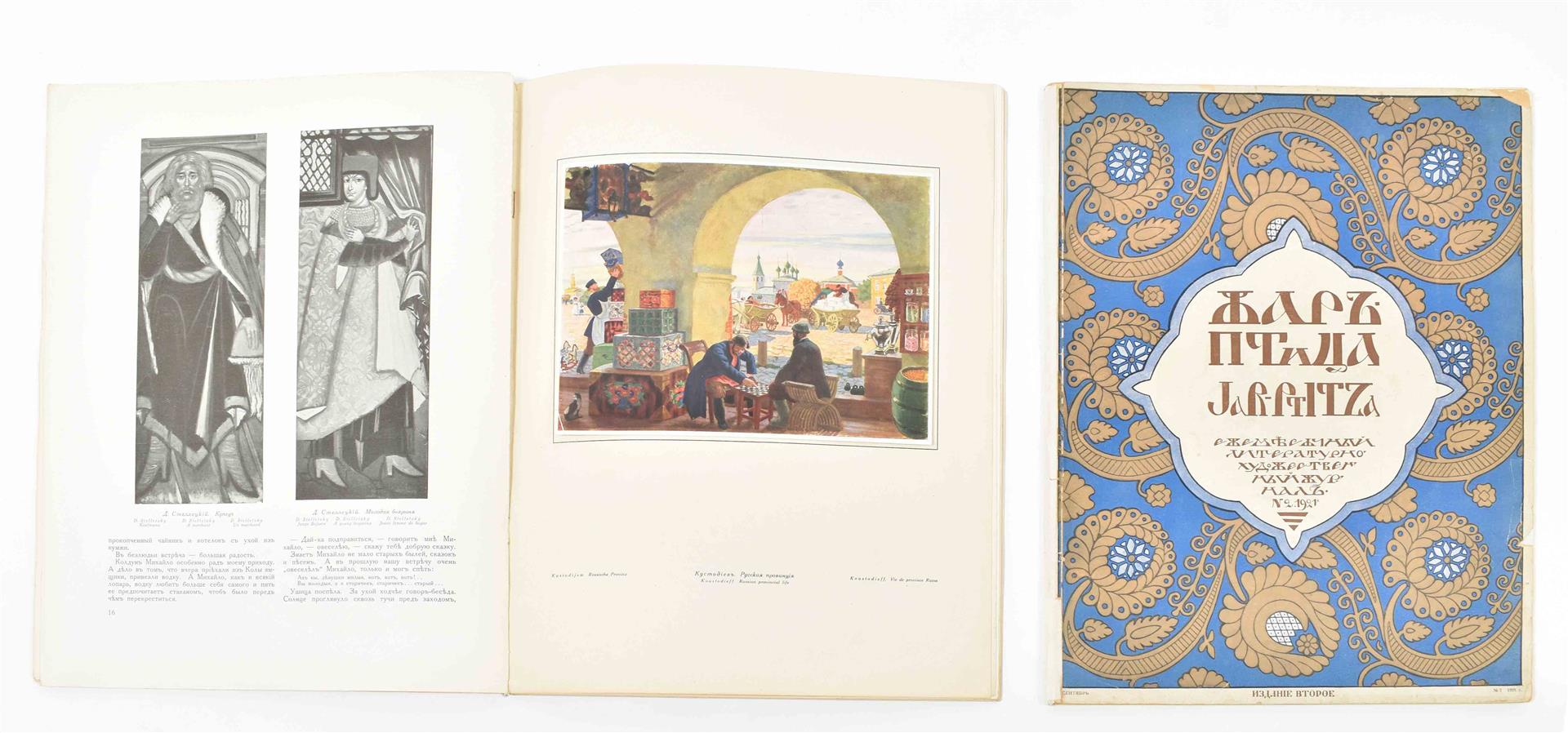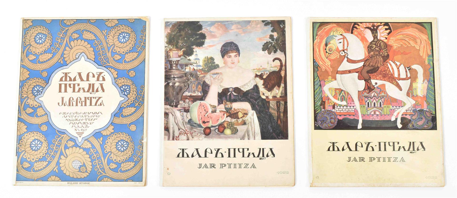 All vols. spine strenghtened w. tape, no. 2 w. marginal missing pieces, mostly repaired w. tape, occas. other internal and external sm. defects. The famous post-revolutionary art journal Jar-Ptitza ("The Firebird"); only 14 issues published in total from 1921 to 1926. (total 3)