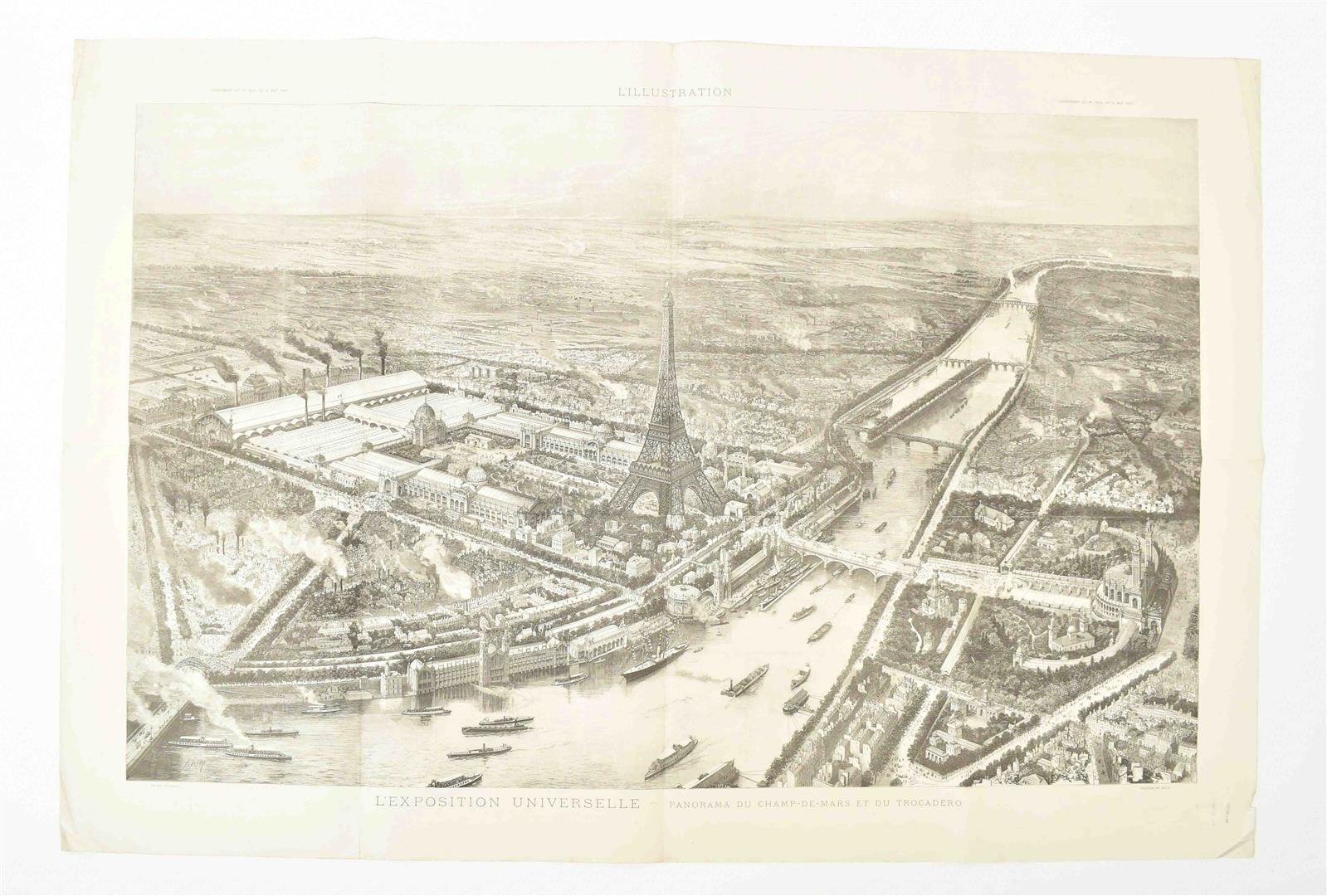 (1) "L'Exposition Universelle. Panorama du Champ-de-Mars et du Trocadero." Large wood engr. bird's eye view by A. Deroy, sheet size 84 x 124 cm, published as supplement to L'Illustration, no. 2410, 4 May 1889. Folded, sm. other marginal imperfections. Good copy, especially for such a large sheet. -and 2 others on the same exhibition (w. defects).