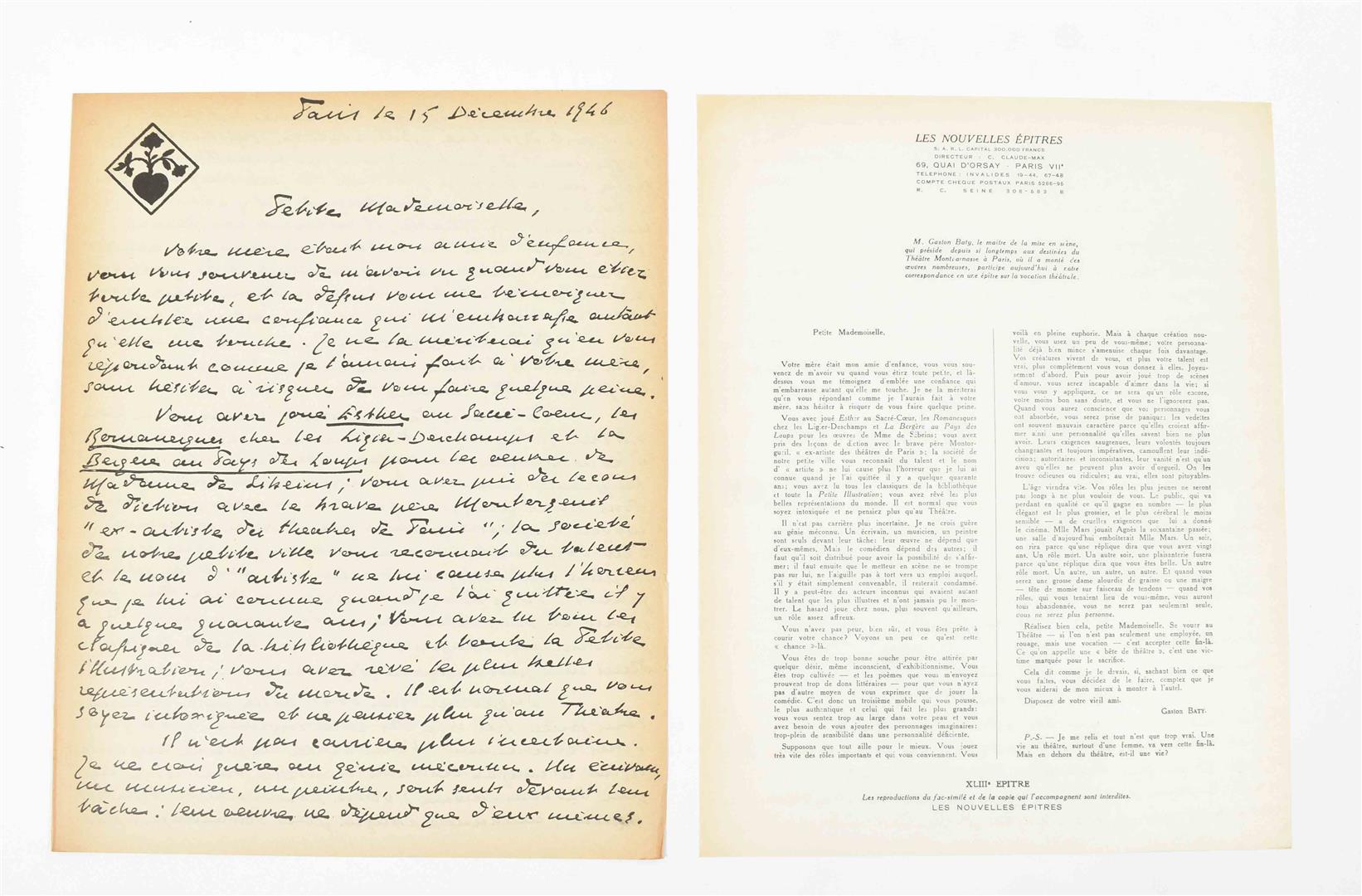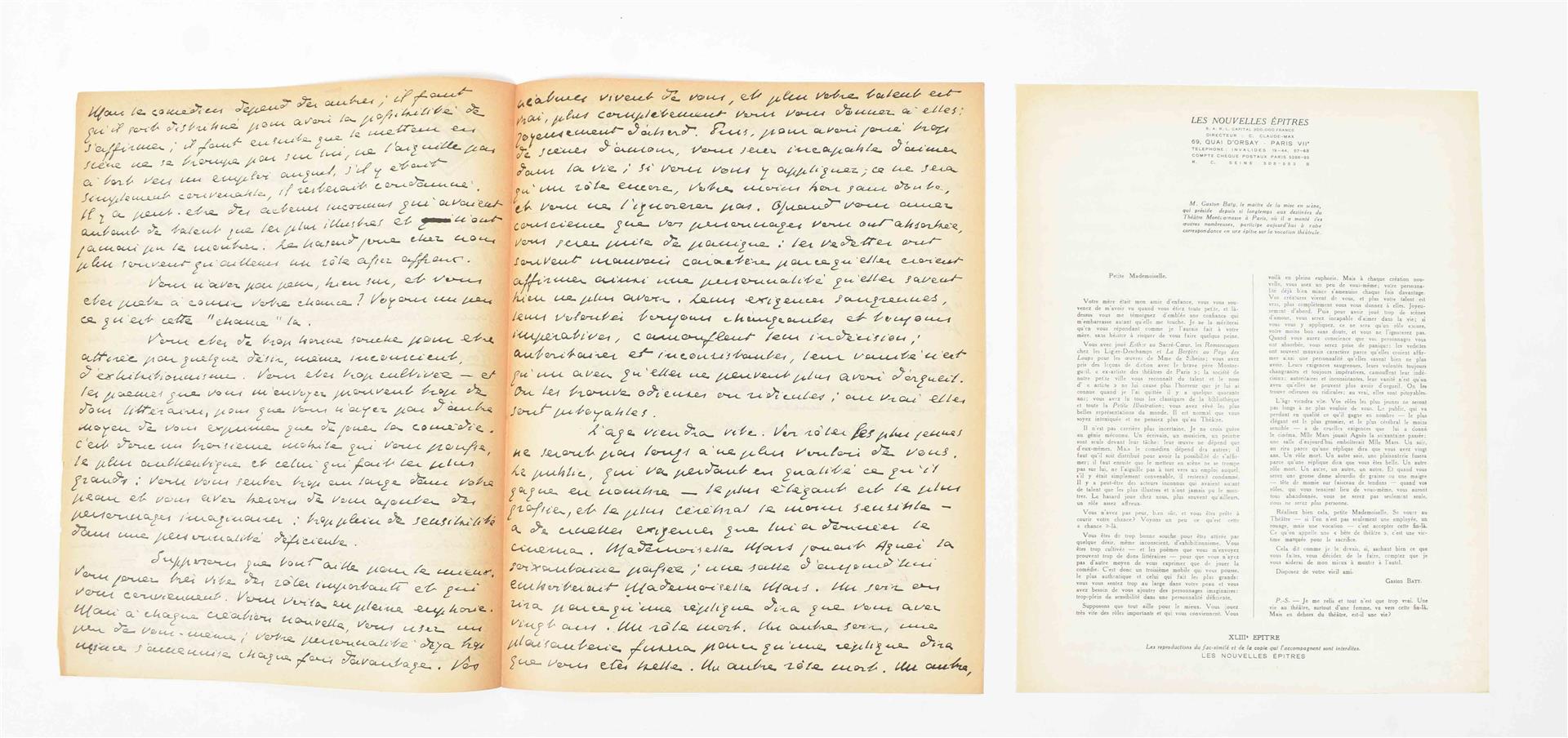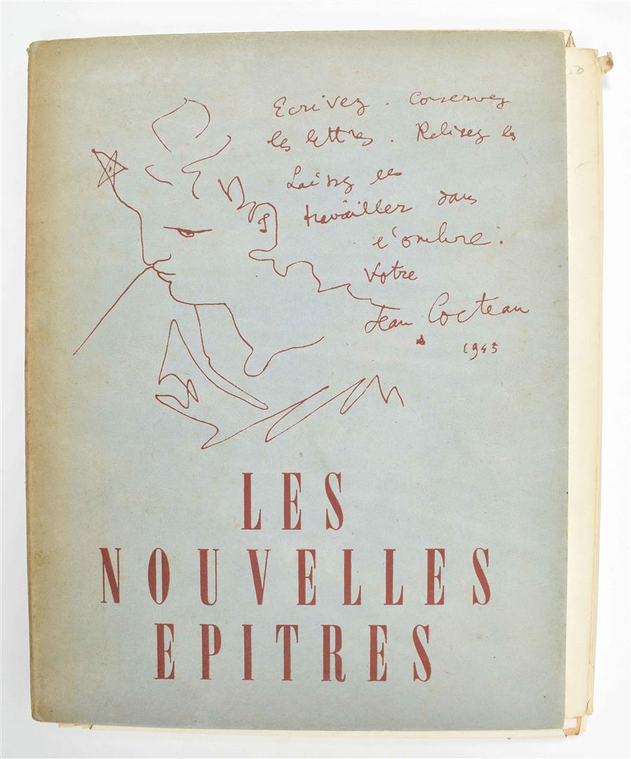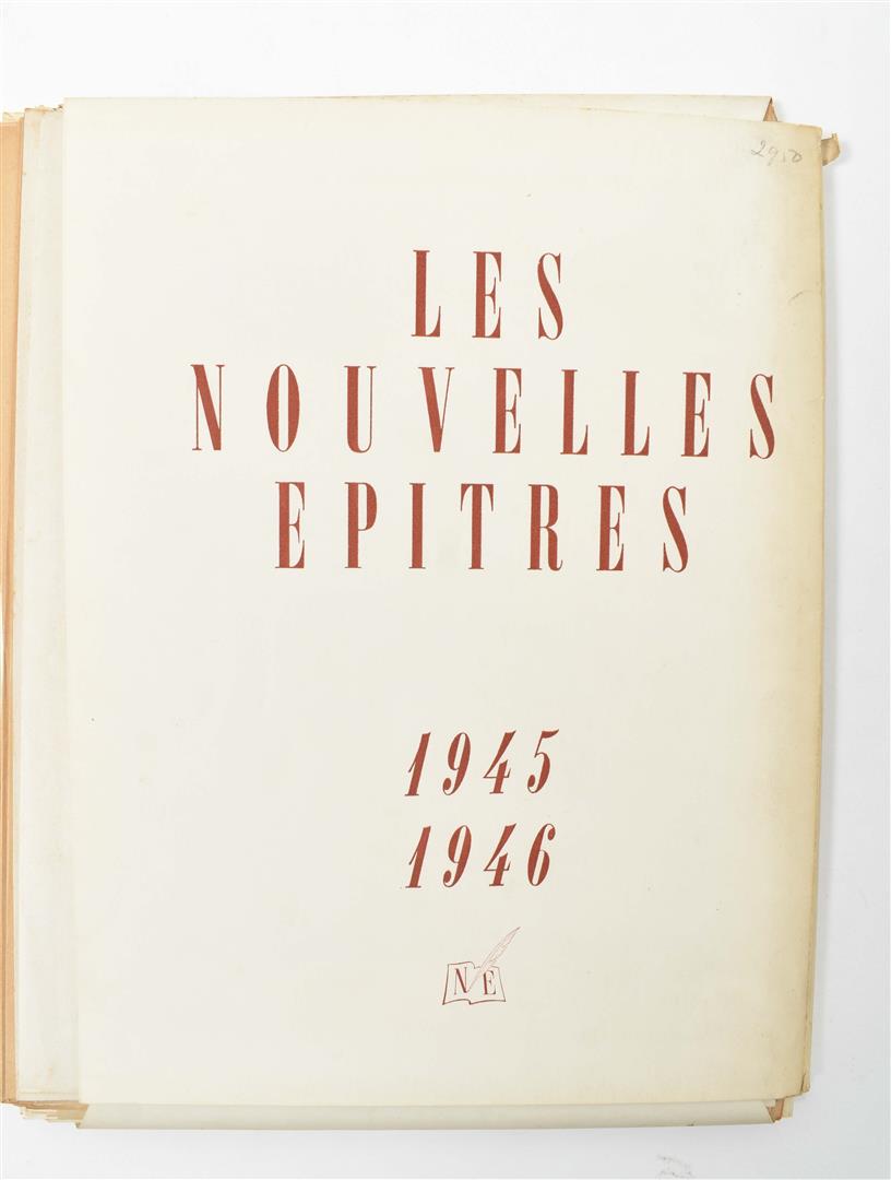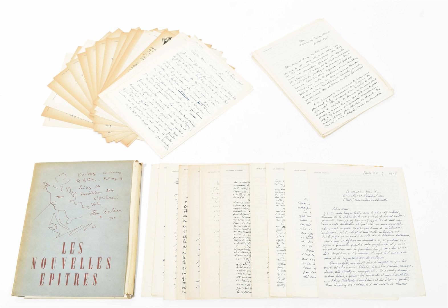 Ed. C. Claude-Max. (Paris, Editions du Monde illustré, 1945-46). 44 facsimile letters, all w. typed carbon paper copy. Loose as publ. in a blue portfolio, 29 x 22 cm, dec. w. a drawing after J. Cocteau. An extraordinary collection initiated by Cocteau and A. Gillois w. (often polemical) letters by a.o. Cocteau, R. Wright, Le Corbusier, C. Vildrac, D. Thompson and G. Duhamel.