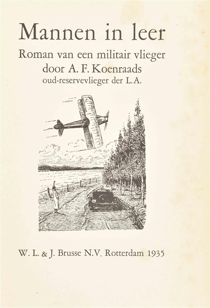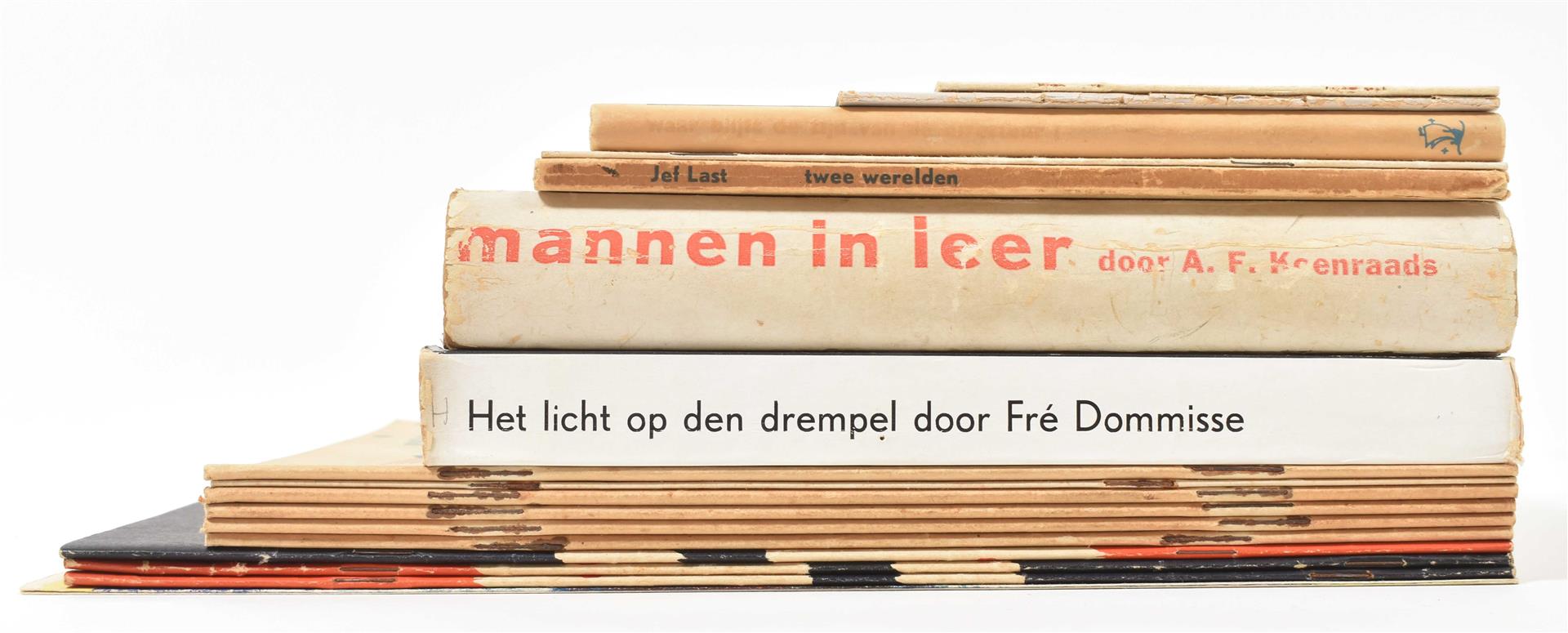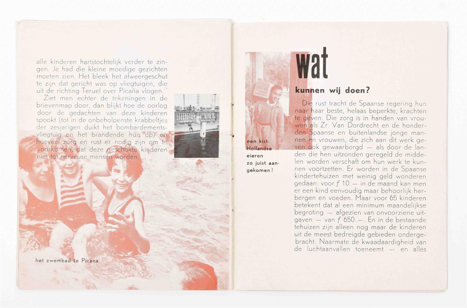 (1) Onze Spaanse pleegkinderen. N.pl., Comité uit N.V.V.-S.D.A.P. voor de Verpleging van Spaanse Kinderen, n.d. (ca. 1938), (16) p. w. photogr./ photomontage ills. attributed to Brusse, orig. wr. w. shaped window to the first page, obl. 8vo. Staples removed, contents loose. Very rare, no copies in NCC. (2) Romein-Verschoor, A. Een veilig huis voor het Spaanse kind. Een veilige toekomst voor het Spaanse volk. Picana. N.pl., Afd. Kindertehuis Picana v.d. commissie "Hulp aan Spanje", n.d. (1938), (16) p. (incl. wr.), w. photogr. ills. printed in red and black, des. attributed to Brusse, orig. wr., 16 mo. Staples removed, contents loose, wr. splitting/ worn on spine. With stamp "ter recensie" on front wr. and date stamp "20 mei 1938" on first page. Rare. (3) Dommisse, F. Het licht op den drempel. Rott., W.L. & J. Brusse, 1937, 191 p., orig. photomontage wr. by Brusse. Wr. sl. wrinkled. A good copy. (4) Koenraads, A.F. Mannen in leer. Roman van een militair vlieger (...). Ibid., idem, 1935, 235 p., orig. photomontage boards by Brusse. A bit foxed, binding sl. worn along extremities. -and approx. 26 others, incl. some duplicates, incl. 1 more sm. publication on the Spanish Civil War and 6 numbers of the periodical In weer en wind, ed. R. Tolman and J.I. van Schaik.