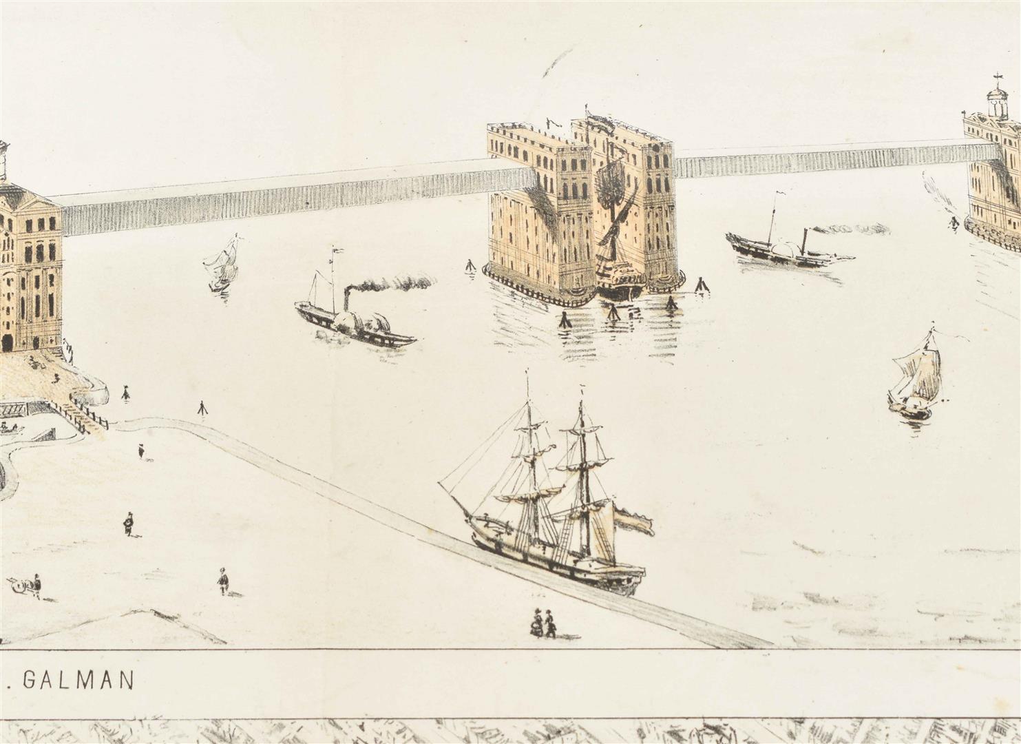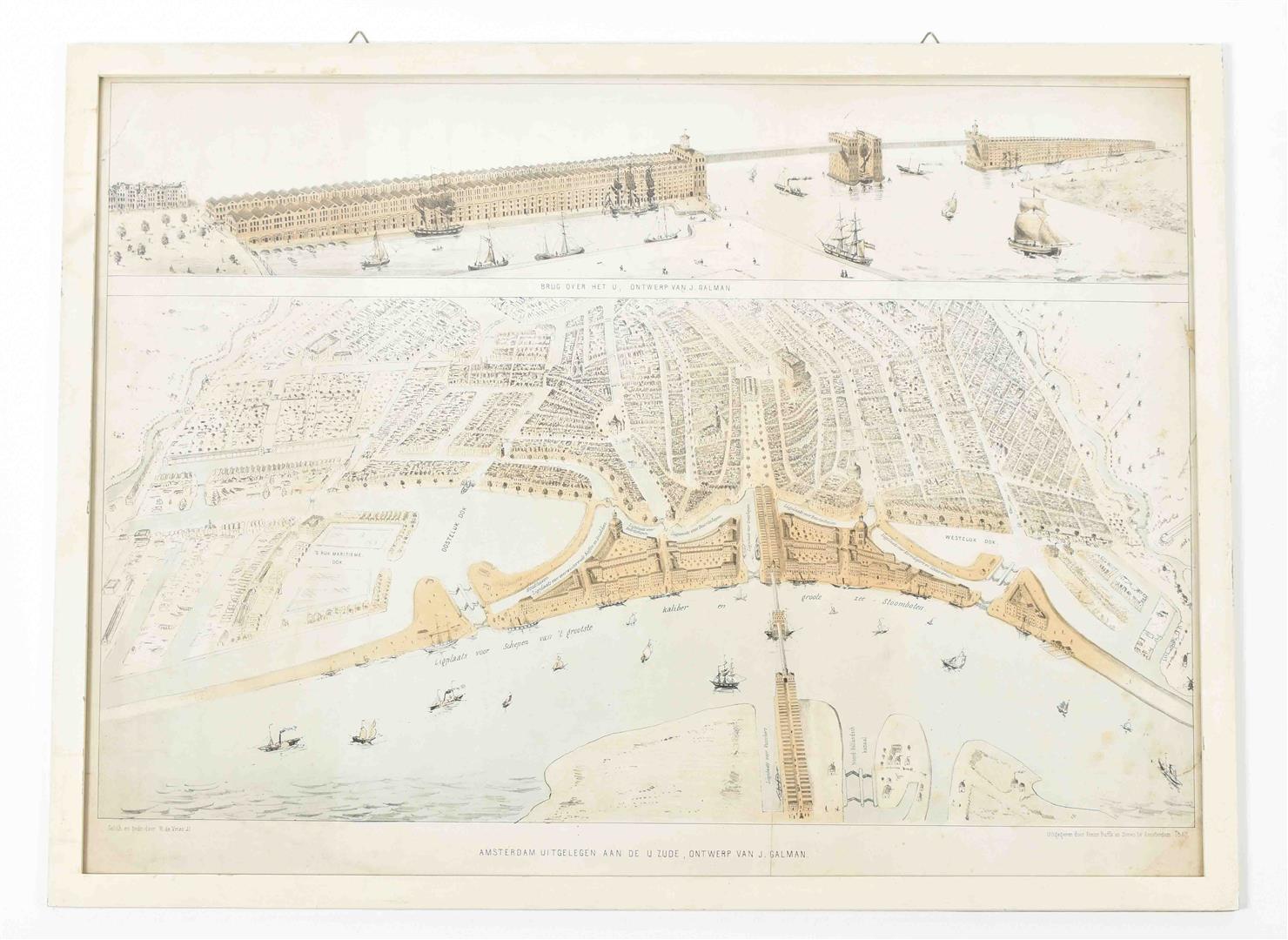 Col. lithogr., 46 x 64 cm, framed, 51 x 68. Printed by R. de Vries Jr., publ. in Amst., Frans Buffa en Zonen, 1857. 2 views depicting an interesting (and never realised) design for a bridge over the Ij River in Amst., connecting the northern and southern parts of the city where Centraal Station now stands.