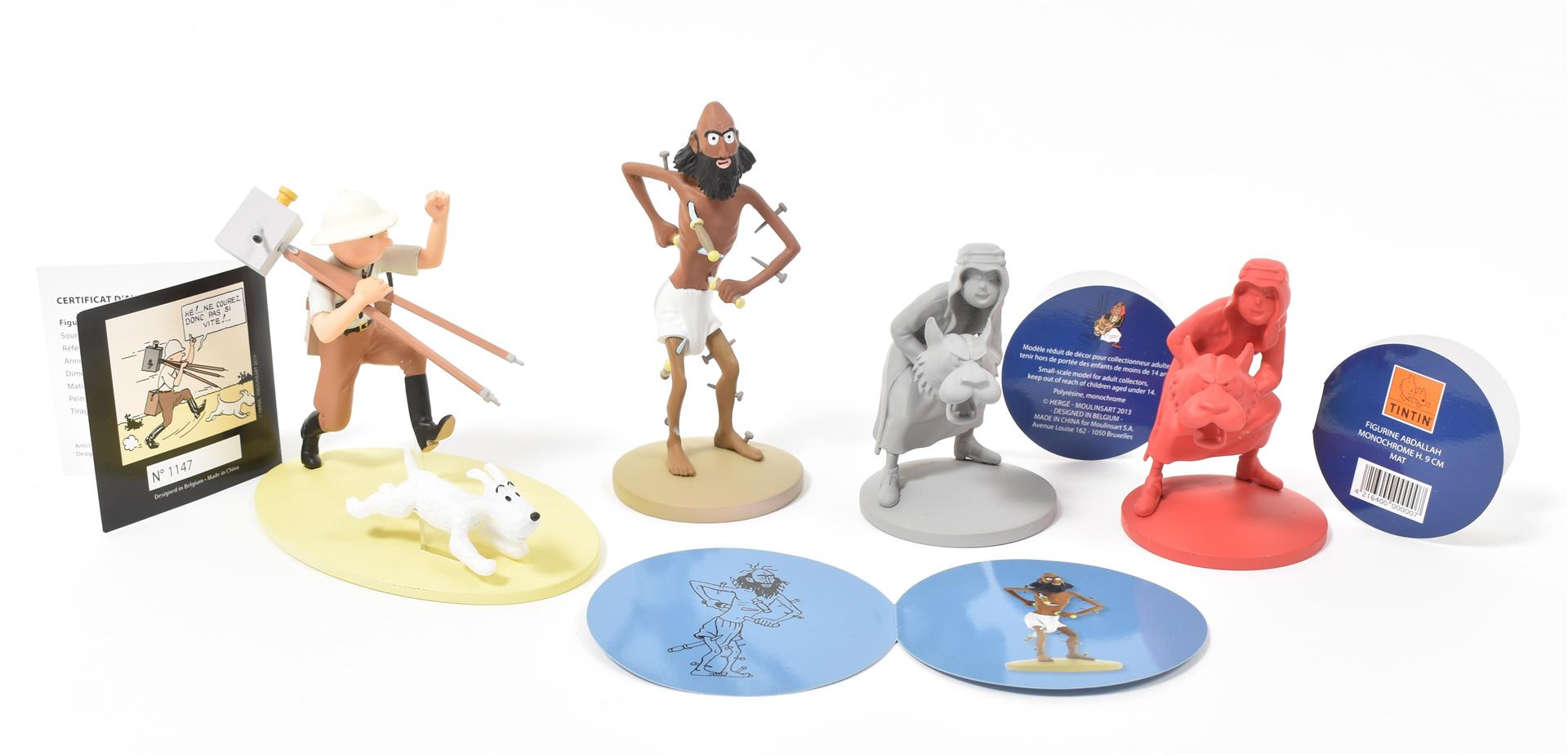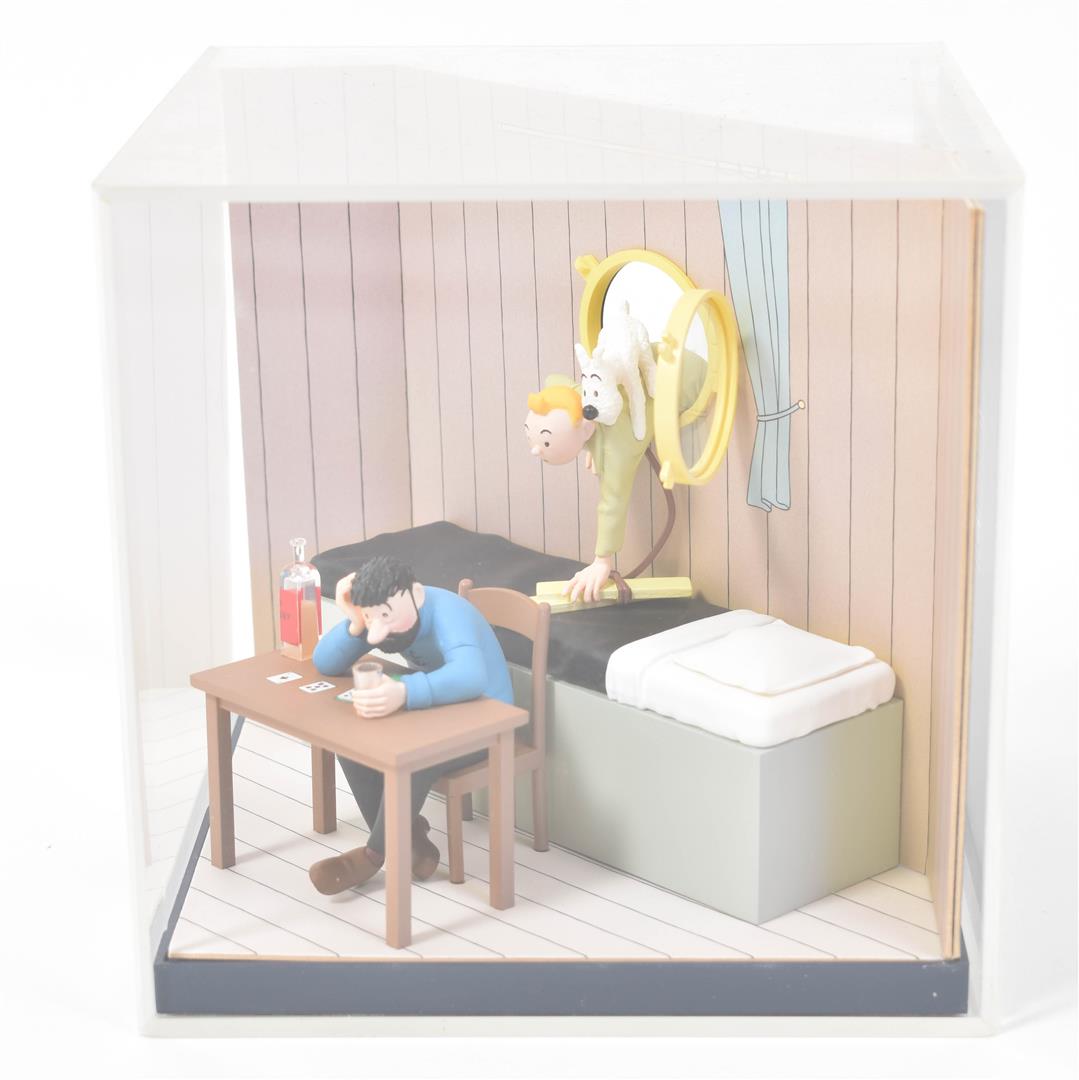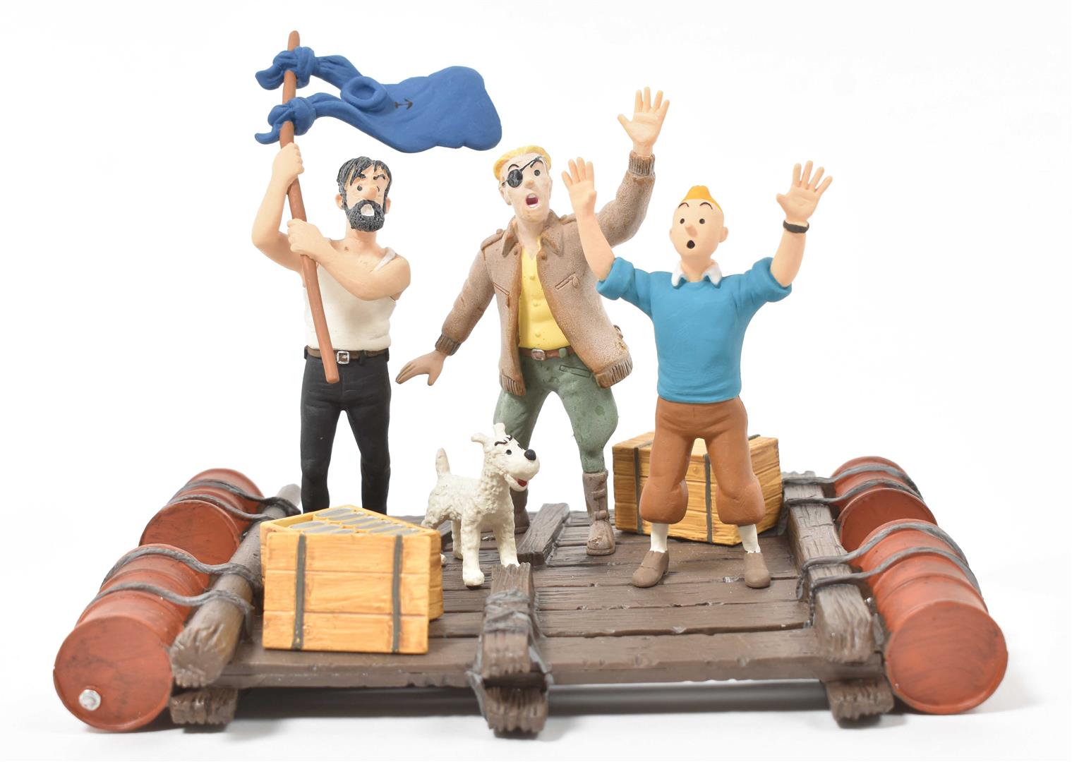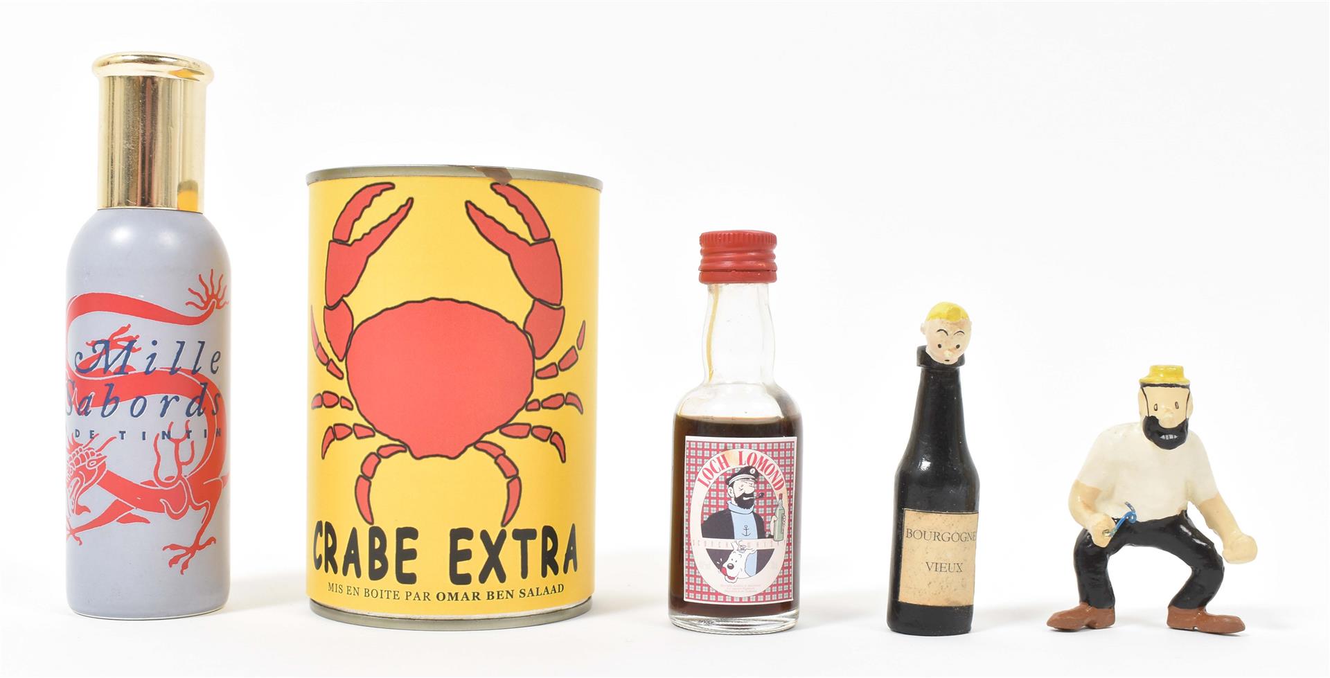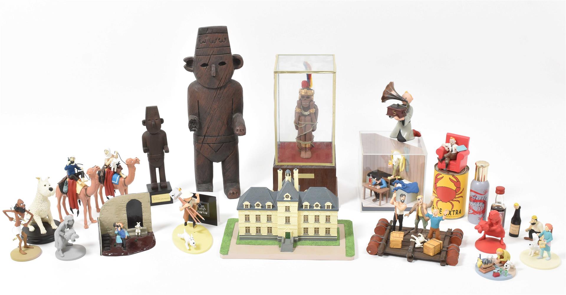 (1) Tintin, Milou, Haddock and Sutz on a raft from "Coke en stock". Hard plastic, 18 x 16 x 12 cm. (2) Scene from "Le Crabe aux pinces d'or" of Tintin coming through the porthole of Haddock's room. In plastic box, 14 x 14 x 14 cm. (3) Two Arumbaya Fetish figurines from "Le Temple du soleil". One 39.5 cm tall, the other a Moulinsart statuette from the Images mythiques collection, 23.5 cm tall. (4) Seven sm. resin Moulinsart figurines, 4 w. certificates of authenticity. (5) Statuette of Rascar Capac from "Les 7 boules de cristal". On a stand in a plastic box, 13 x 13 x 32 cm. -and 8 other Tintin figurines and curiosa, incl. a "Mille Sabords" eau de toilette, a "crabe extra, mis en boîte par Omar Ben Salaad" tin and a sm. "Loch Lomond" scotch whiskey bottle.